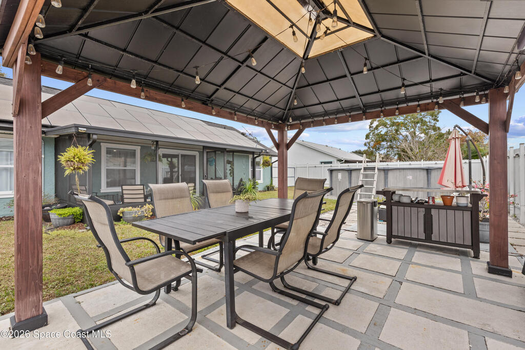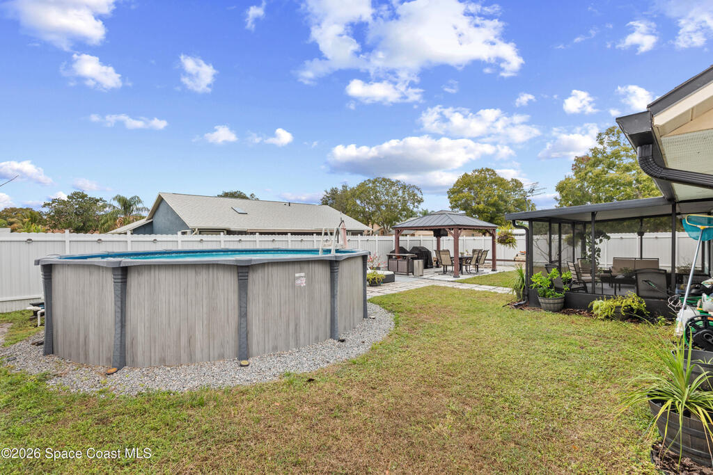 Beautifully maintained 3-bedroom, 2-bath home featuring a private backyard oasis. This split-bedroom, open floor plan offers an updated kitchen with quartz countertops and stainless steel appliances. Centrally located in Melbourne, just minutes from shopping, dining, and major conveniences. Recent upgrades include a new roof with full home solar panels (no PACE loan), HVAC system, and new fencing in 2024. Outdoor highlights include a large gazebo with fire pit (2022) and an above-ground pool (2020).
