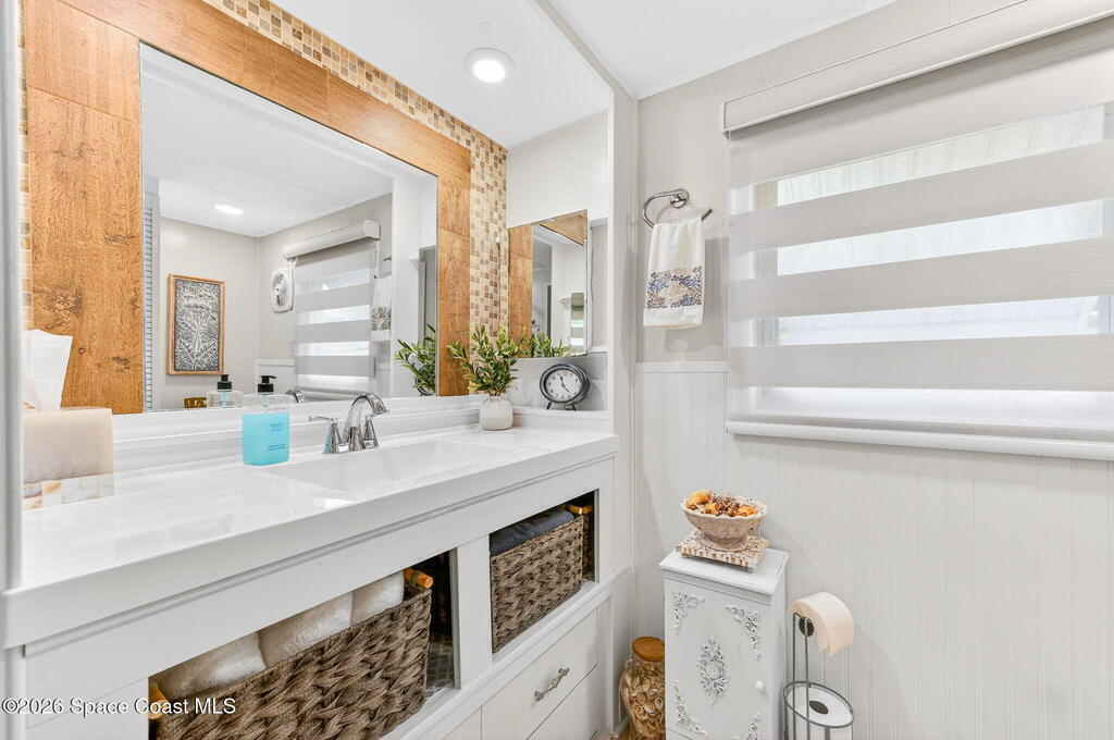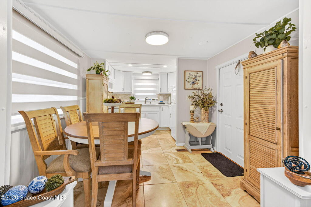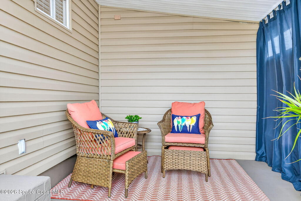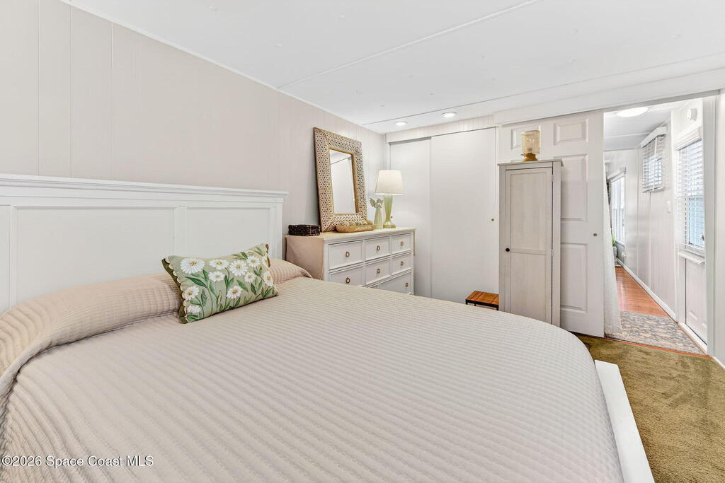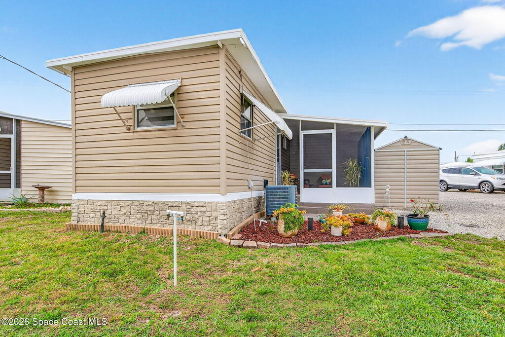 Welcome to this inviting and affordable 1 bed / 1 bath home located in desirable Palm Bay Estates! This home features a canal view from the screened in porch. It provides a functional layout and comfortable living space, perfect as a full-time residence, seasonal retreat or investment property. Upgrades include new vinyl siding, windows, tankless water heater, stackable washer / dryer, new kitchen appliances, quartz countertops, updated backsplash, LED lighting, new window treatments, plumbing, electrical system and breaker box. A beautiful new vanity, shower, and lighting add ambiance to the bathroom. The ac system has also been completely refurbished. Roof membrane is only 2 years old. Outside, enjoy a low-maintenance yard and peaceful surroundings. Ample parking includes an attached carport. Utility shed for additional storage. This 55+ community features a heated pool, clubhouse, picnic area, dog park, community boat ramp and access to Turkey Creek and the Indian River!
