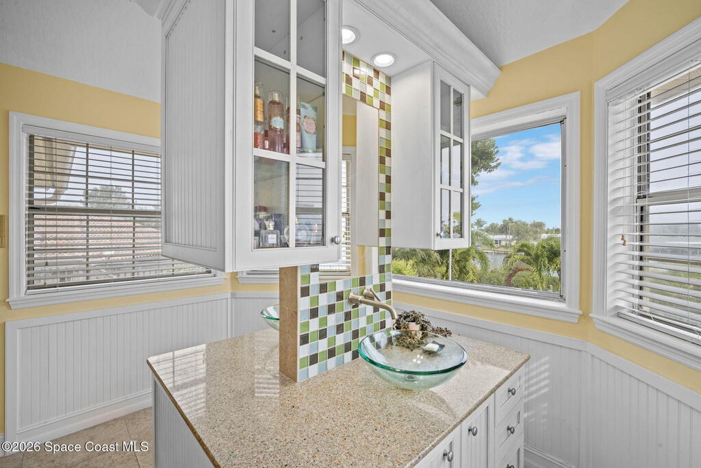 Tucked behind the guarded gates of Tortoise Island, this extraordinary waterfront estate commands approximately 120-feet of prime frontage along a 17-foot dredged canal, quietly asserting itself as one of the most significant offerings the community has seen in decades. With a newly reimagined dock and a private beach style shoreline, the property offers a level of boating access, scale, and permanence that discerning buyers often wait a lifetime to secure.The residence unfolds across more than 4,600 square feet of thoughtfully curated interior space, where timeless materials meet architectural volume. Tile flooring flows seamlessly throughout, complemented by soaring vaulted ceilings that create a sense of openness without sacrificing warmth. A private office anchors the front of the home, offering a refined workspace, while the primary living and dining areas extend naturally toward the water through French doors, dissolving the boundary between indoors and out.