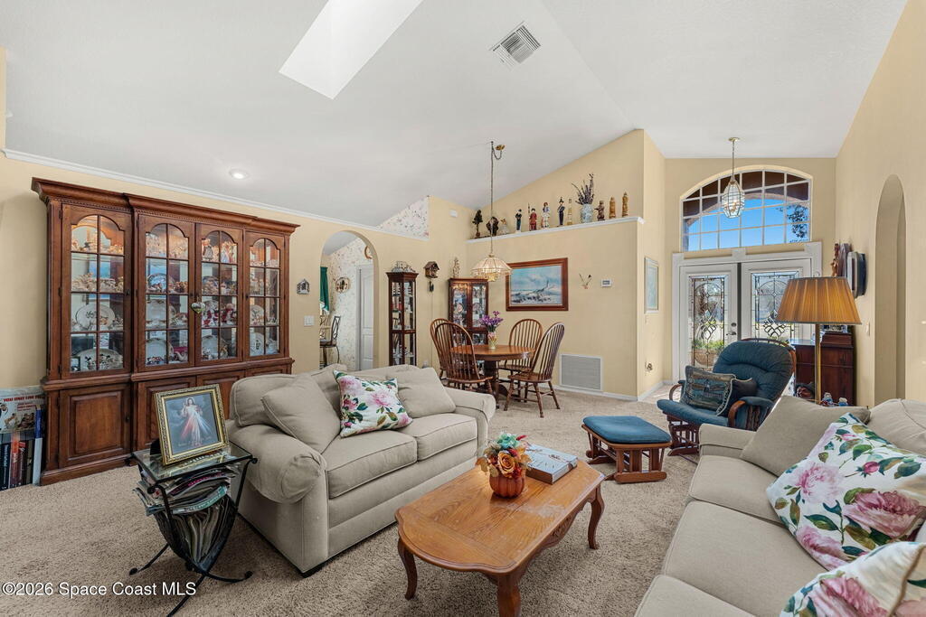 This one owner home sits on a rare pie-shaped lakefront lot on a cul-de-sac, one of the best water-view lots in the subdivision. A central kitchen & popular open floor plan are filled w/ natural light from skylights, creating a bright & welcoming living space. Enjoy serene lake views from almost every window of the home including kitchen table. The primary suite also offers peaceful water views, walk-in closet, dual sinks, updated shower and garden tub. The screened patio is ideal for relaxing or entertaining while overlooking the lake. Key updates include a 2014 roof, accordion hurricane shutters, 2015 HVAC, and storm-impact double front doors & a storm-impact sliding glass door to the patio. All appliances convey, including washer and dryer. The home is well lived in and offers a well-designed and popular layout. Located near restaurants & shopping, with easy access to major employers, beaches, PSFB & highways.
