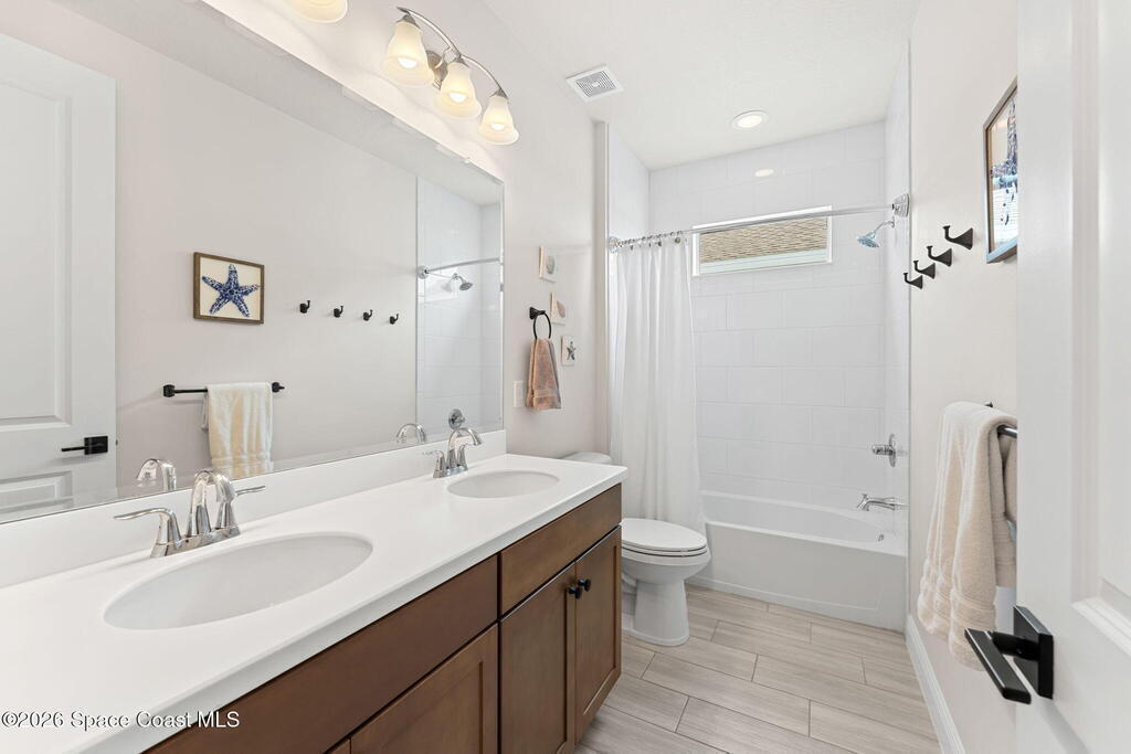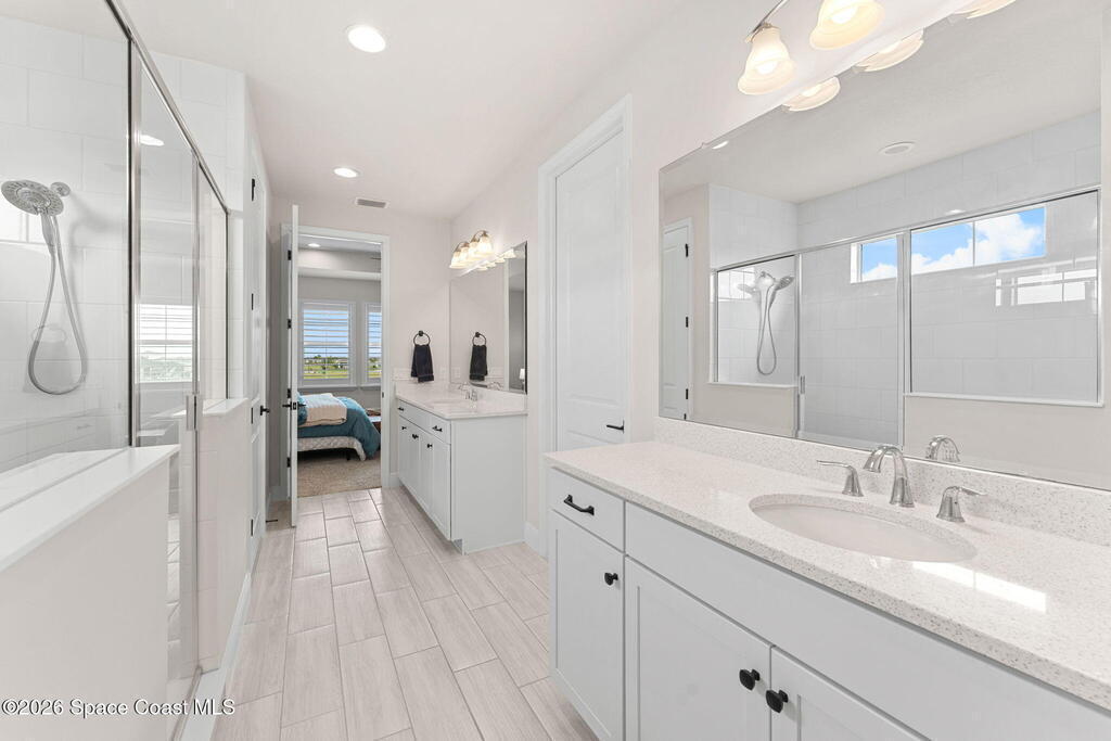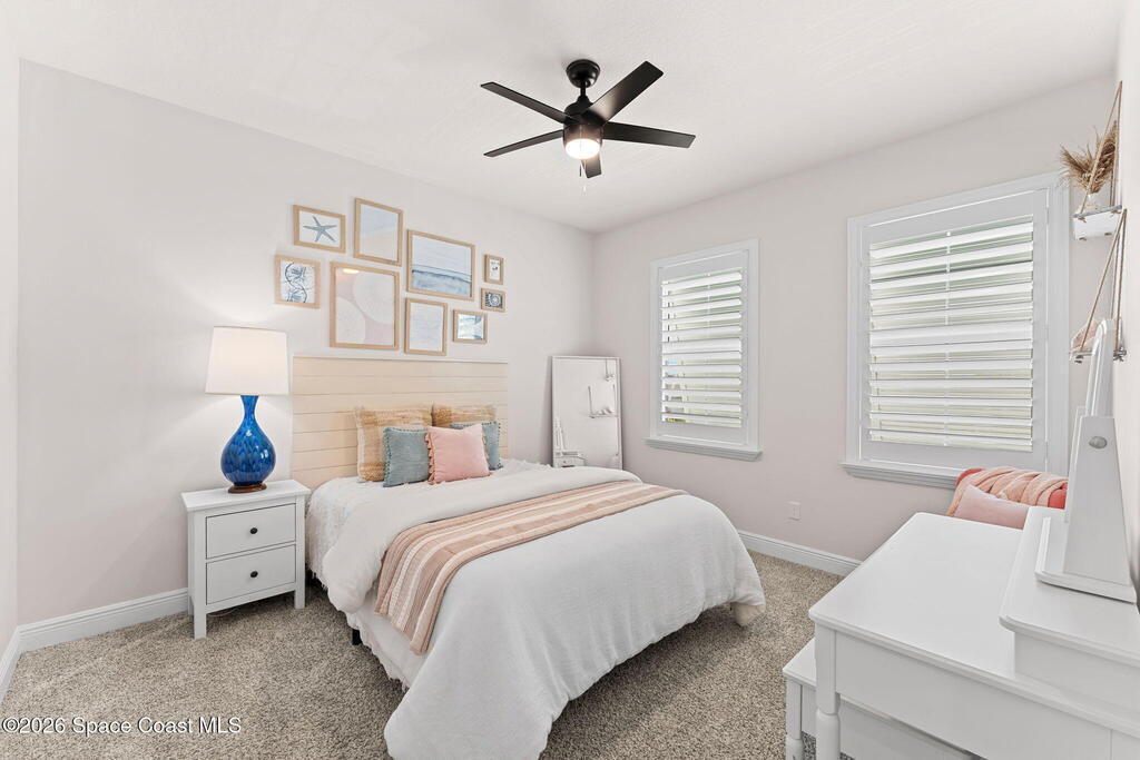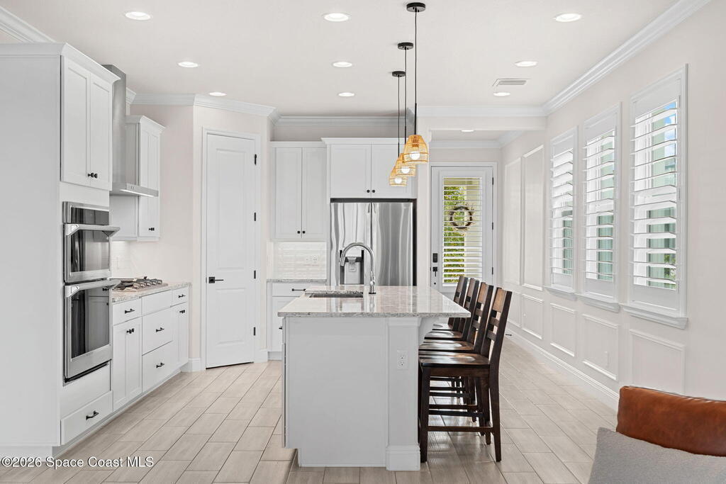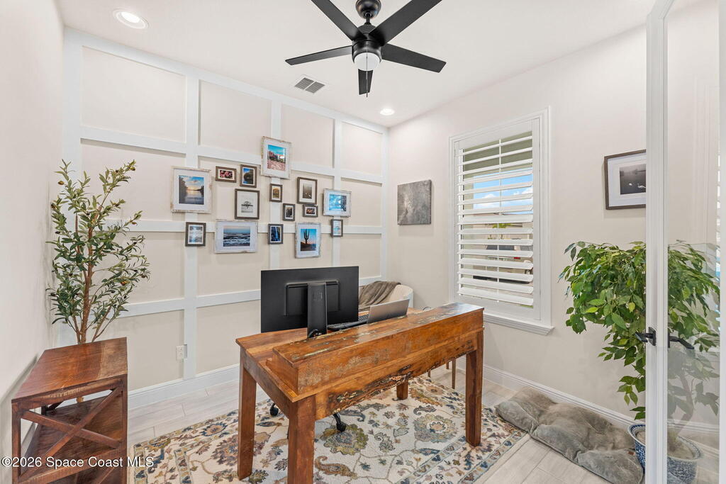 Designed for function & finished with upgrades that matter. Custom wood trim in the entry (2024) opens to a bright, open-concept kitchen, living & dining space featuring quartz countertops, streamlined cabinetry & plantation shutters (2023). Screened outdoor living elevates the daily routine with a 2023 saltwater pool + spa, long lake views & extra west-side easement space for added privacy & openness. First floor includes a flexible bedroom + full guest bath, plus a French-door office highlighted by custom wall trim (2024). The primary suite offers plantation shutters, tray ceiling, oversized glass-enclosed shower & walk-in closet. Upstairs adds a generous loft/bonus area with custom wall trim + shelving (2025), two additional bedrooms with custom wood trim (2024), a full bath & second-floor laundry. Convenient to Viera shopping & dining, I-95 & the beach, with fantastic community amenities