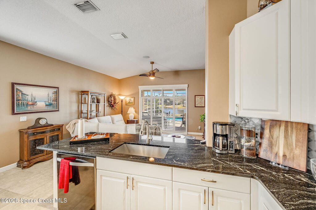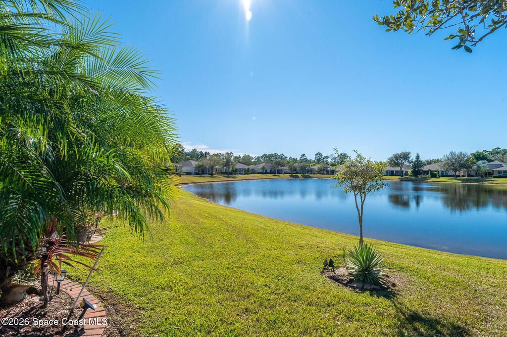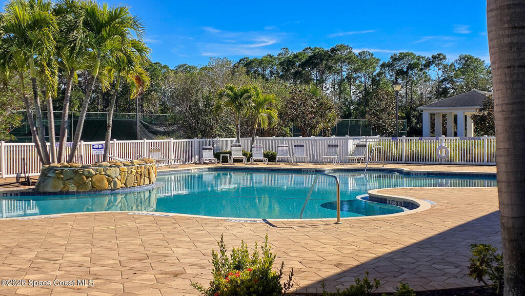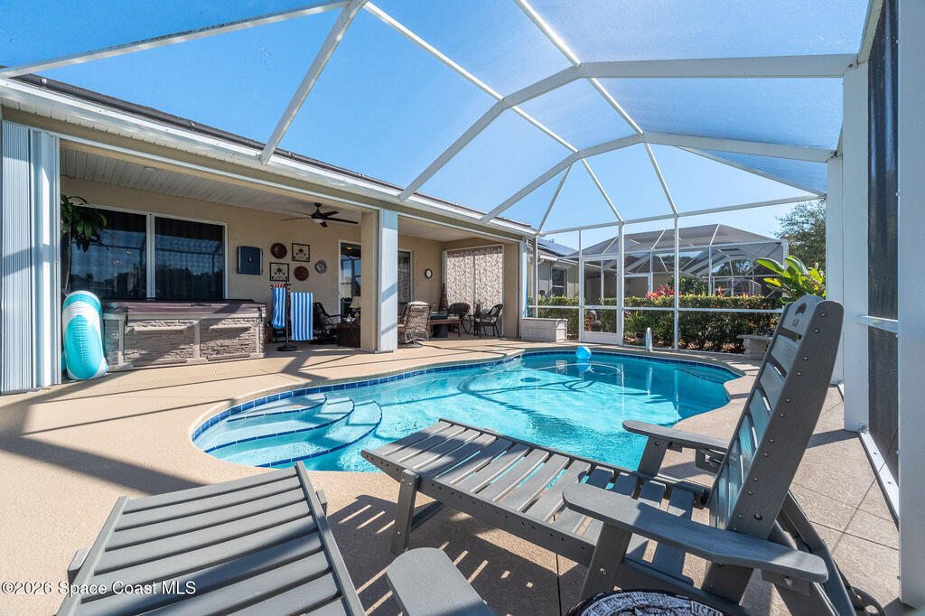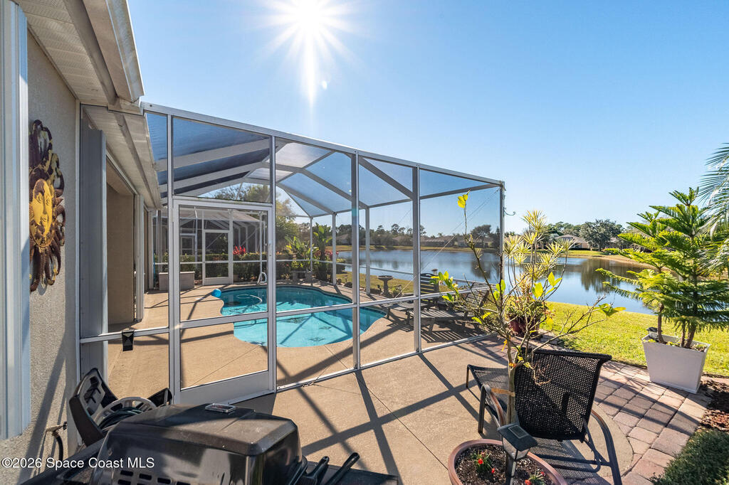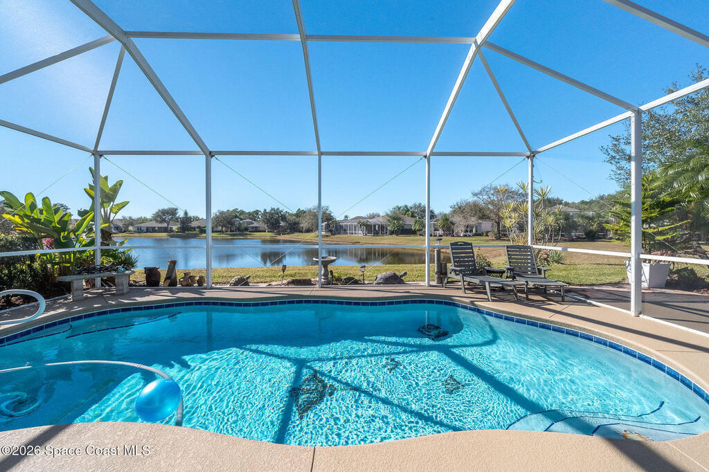 Immaculate and truly turnkey, this pristine pool home reflects exceptional care and pride of ownership throughout. Located in a gated community with HOA-maintained lawn and landscaping, the home features a newer roof and A/C, an upgraded kitchen with granite countertops, black stainless steel appliances, two pantries, and a center island, plus updated bathrooms with granite countertops. Enjoy a screened-in pool with water and amazing sunset views, a spacious entertaining patio, and a hot tub that conveys. The flexible layout includes three bedrooms plus an office or flex space. The primary suite offers dual closets and vanities, a water closet, and a large walk-in shower. Convenient access to Bayside Lakes Community Center. Extras included: hot tub, second refrigerator, washer, dryer, and crystal chandelier. Meticulously maintained and truly move-in ready with furnishings negotiable!