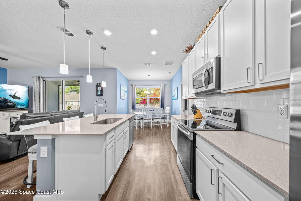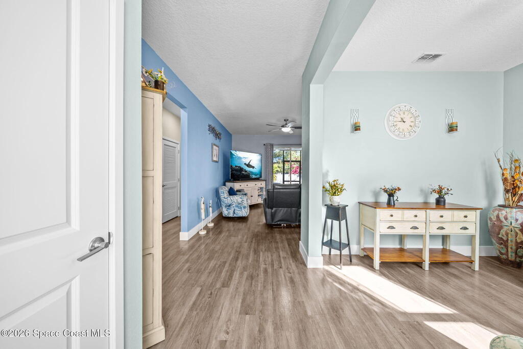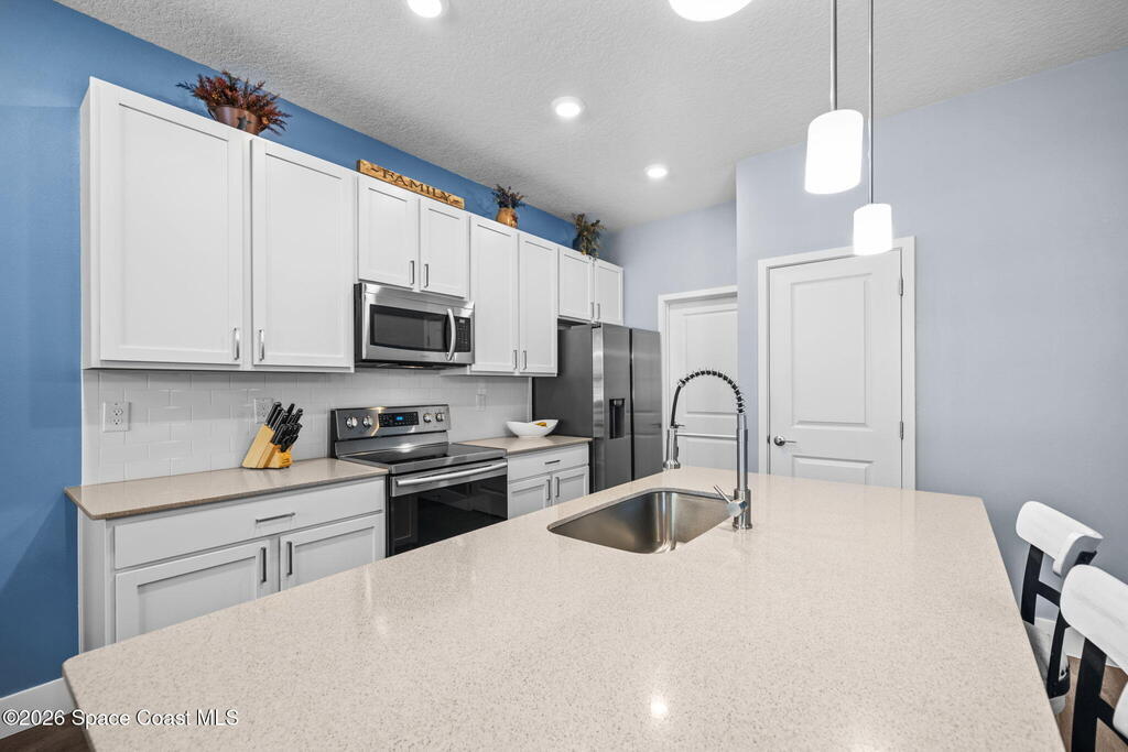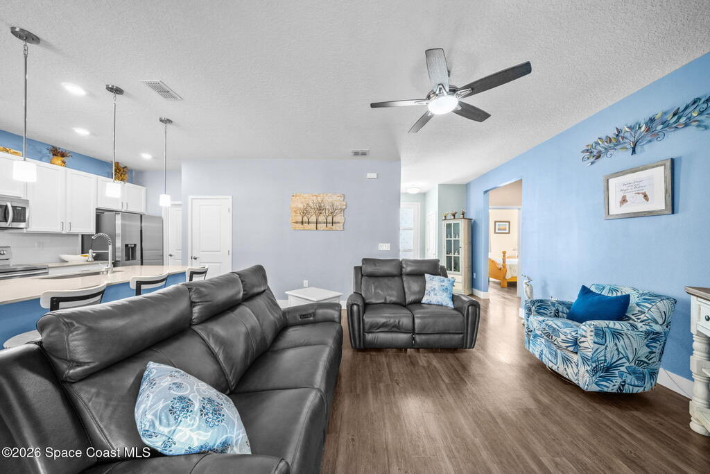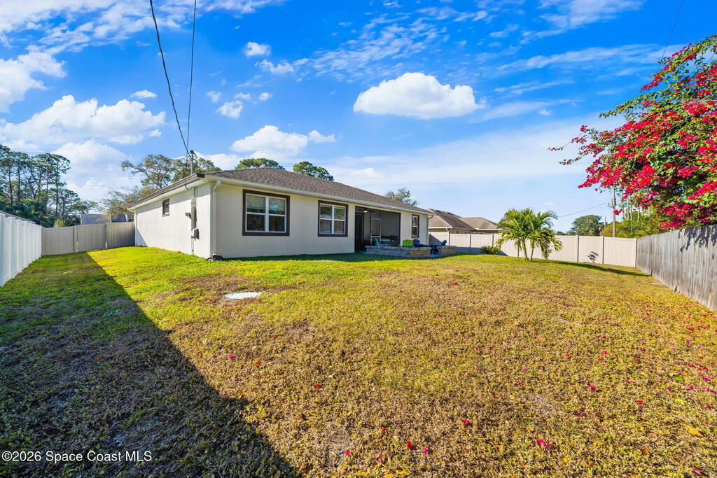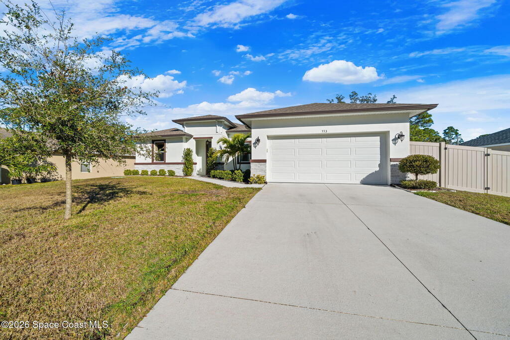 Built in 2021, this energy-efficient concrete block home offers 3 bedrooms, 2 bathrooms, and 1,727 sq ft of modern living on city water in Palm Bay. The open floor plan is enhanced by 9'4'' ceilings and vinyl flooring throughout--no carpet--creating a bright and spacious feel. The kitchen features 42'' cabinetry, quartz countertops, and stainless steel appliances, flowing effortlessly into the main living and dining areas, perfect for everyday living and entertaining.Designed with energy efficiency in mind, this home offers newer construction standards that help keep utility costs low while maintaining year-round comfort. The primary suite is a true retreat with a tray ceiling, large walk-in closet, dual sinks, and a beautifully tiled walk-in shower filled with natural light from the transom window. Both bathrooms feature quartz countertops for a cohesive, upscale look.