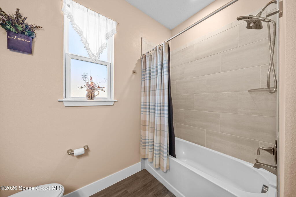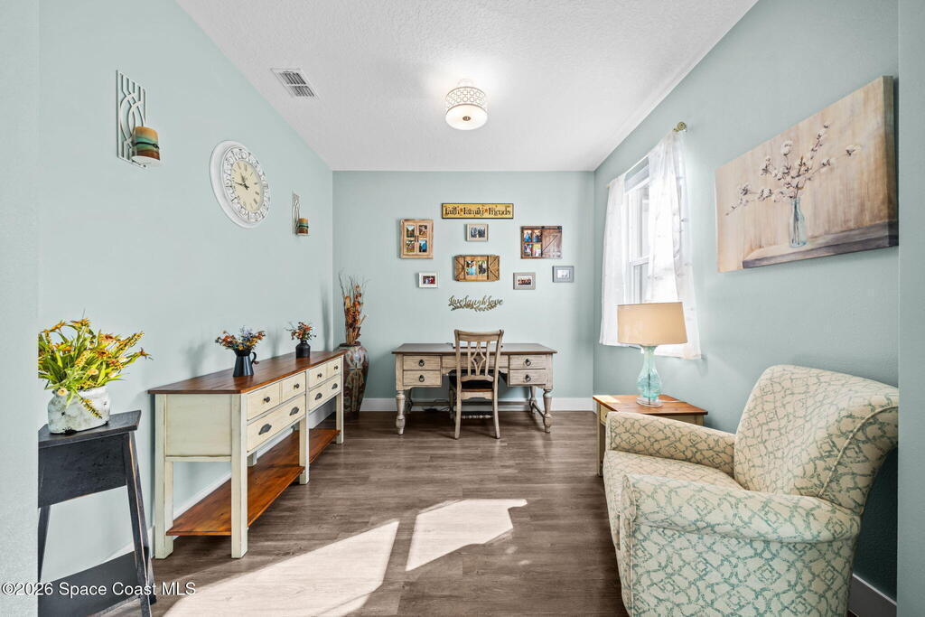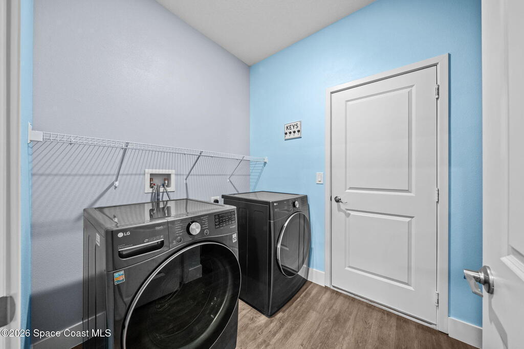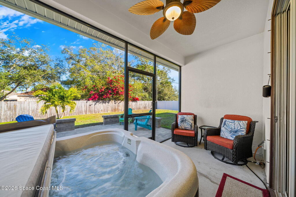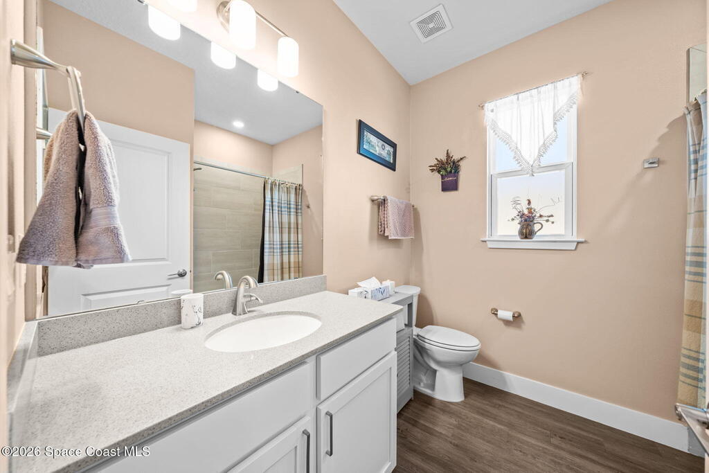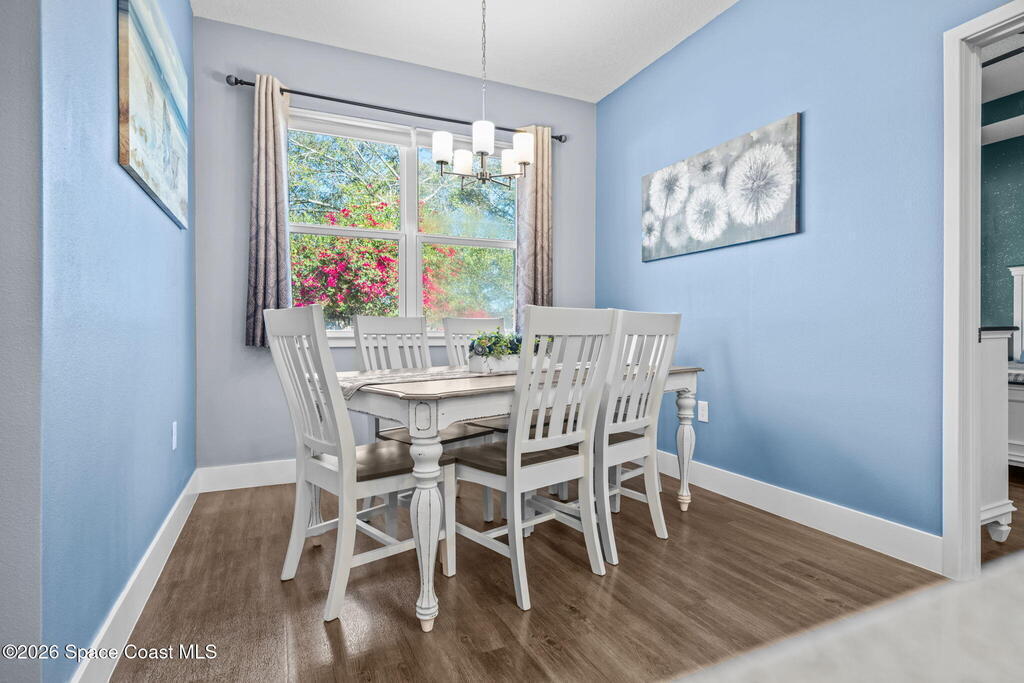 Built in 2021, this energy-efficient concrete block home offers 3 bedrooms, 2 bathrooms, and 1,727 sq ft of modern living on city water in Palm Bay. The open floor plan is enhanced by 9'4'' ceilings and vinyl flooring throughout--no carpet--creating a bright and spacious feel. The kitchen features 42'' cabinetry, quartz countertops, and stainless steel appliances, flowing effortlessly into the main living and dining areas, perfect for everyday living and entertaining.Designed with energy efficiency in mind, this home offers newer construction standards that help keep utility costs low while maintaining year-round comfort. The primary suite is a true retreat with a tray ceiling, large walk-in closet, dual sinks, and a beautifully tiled walk-in shower filled with natural light from the transom window. Both bathrooms feature quartz countertops for a cohesive, upscale look.