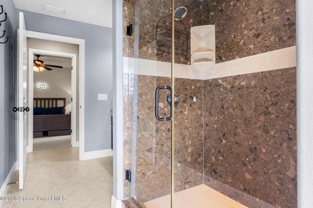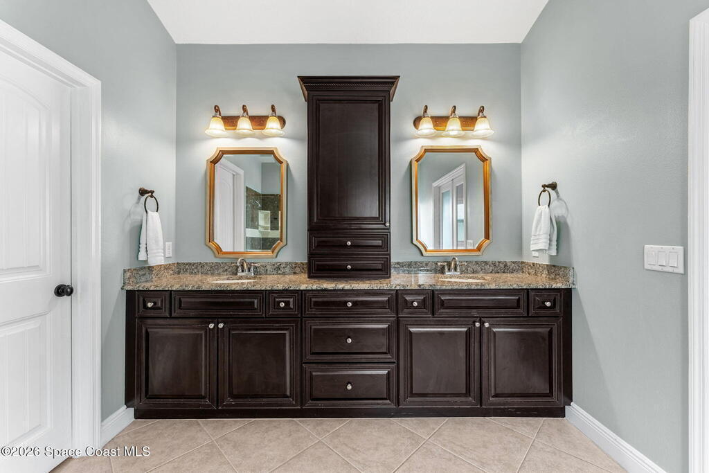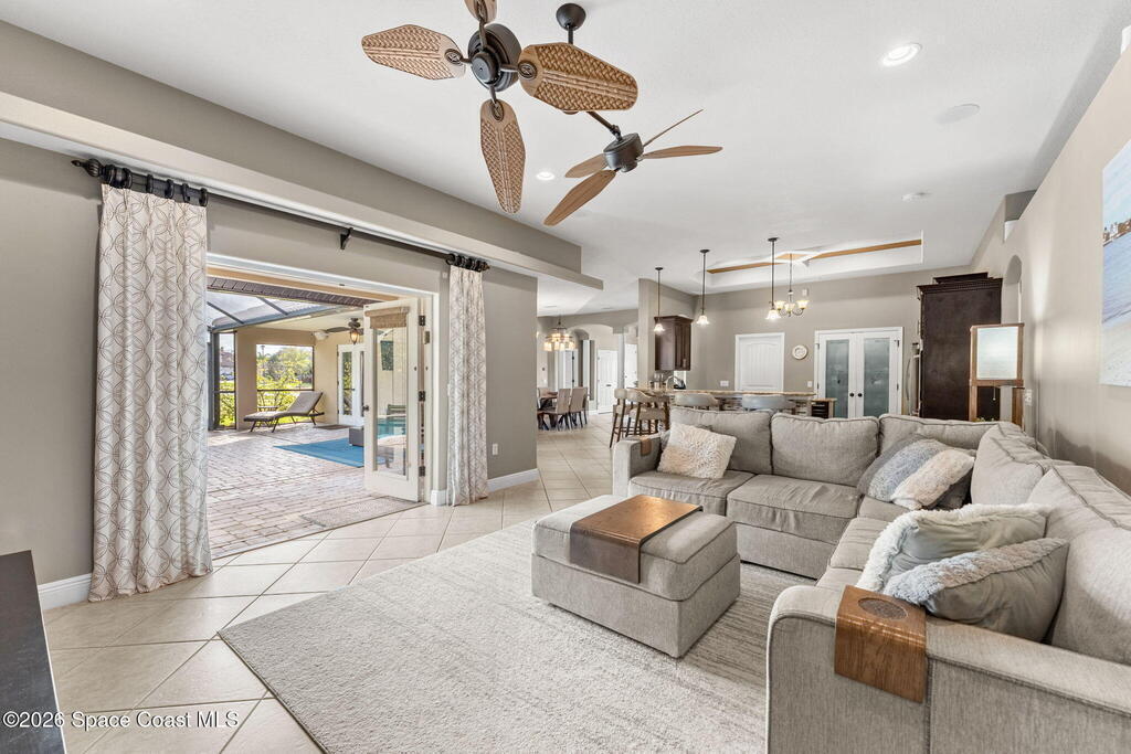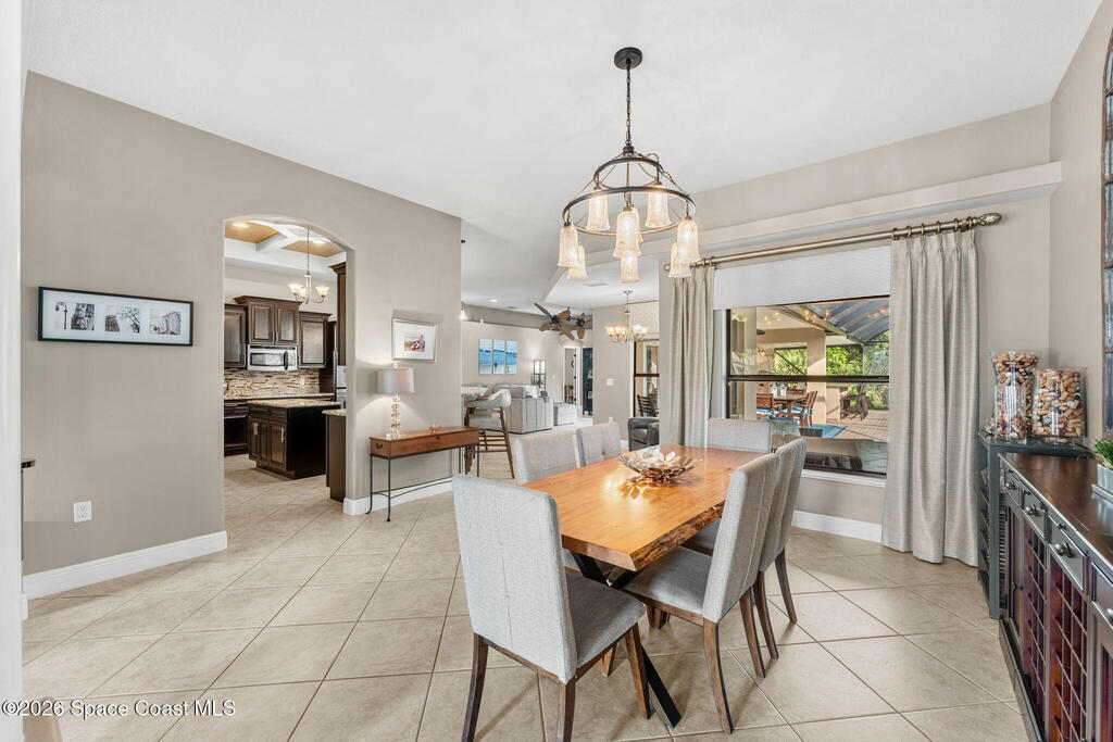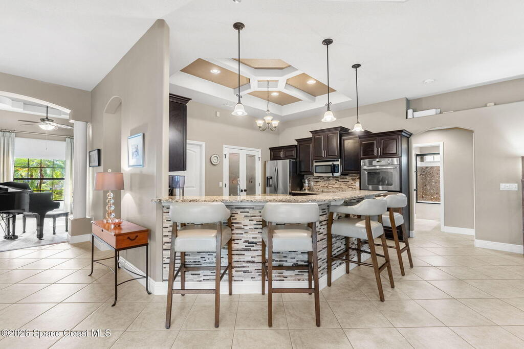 Sunlight, space, and a backyard built for real living define this home from the moment you step inside. Open living and dining areas flow effortlessly beneath coffered ceilings and architectural columns, grounded by continuous tile floors and framed by outdoor views that pull the outside in. The kitchen keeps pace with everyday life and large gatherings alike, centered around a generous granite island, staggered maple cabinetry, double ovens, and a walk-in pantry that supports serious hosting. The primary suite feels quietly indulgent with French doors opening straight to the lanai, a tray ceiling overhead, a spa-inspired bath with jetted tub and walk-in shower, and a walk-in closet washed in natural light. A smart split-bedroom layout adds real-world function, pairing two secondary bedrooms with a full bath while a third secondary bedroom sits near another full bath that also serves as the pool bath, keeping guests comfortable and outdoor days seamless.