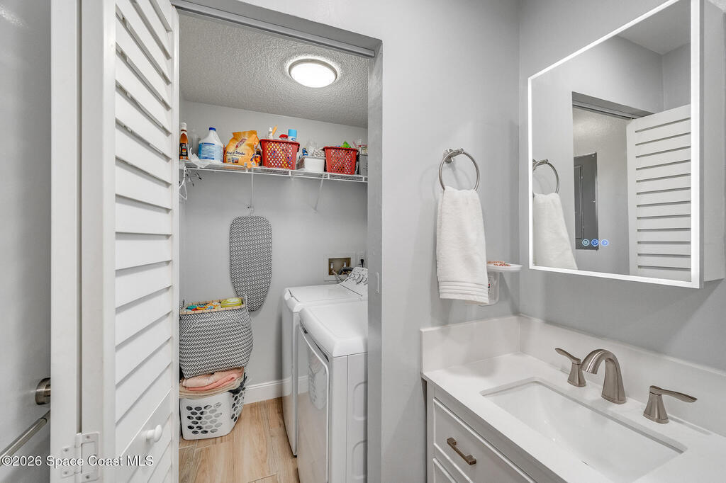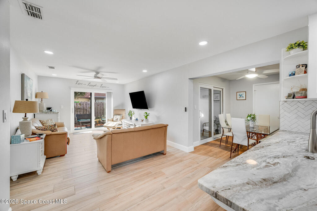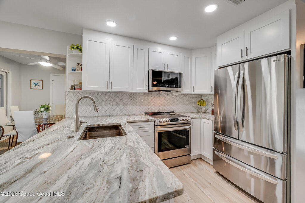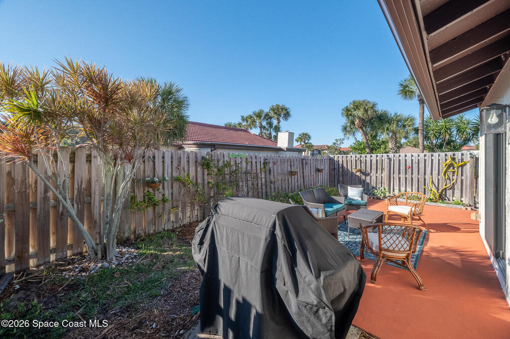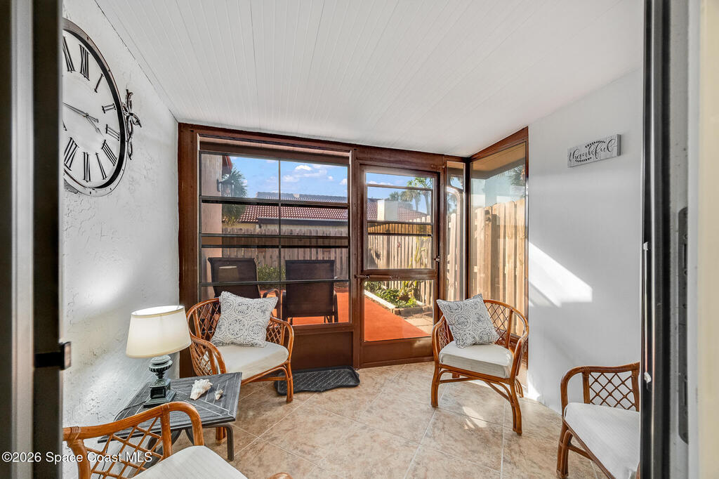 Located in a highly sought-after community, this beautifully remodeled one-story corner unit offers the rare convenience of a one-car garage and exceptional natural light throughout. No detail has been overlooked, with a new roof, hurricane-impact windows and doors, and all-new appliances providing peace of mind and modern comfort. The home is truly move-in ready and showcases quality finishes at every turn. Outdoor living is a highlight, featuring a private lanai, cement patio ideal for entertaining or gardening, and an outdoor shower perfect for coastal living. With low HOA fees and outstanding amenities including private beach access, a clubhouse, two pools, tennis courts, and more, this is a rare opportunity to own a stunning home in an unbeatable location. Don't miss it.