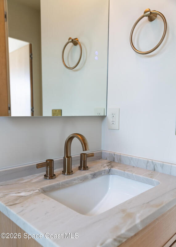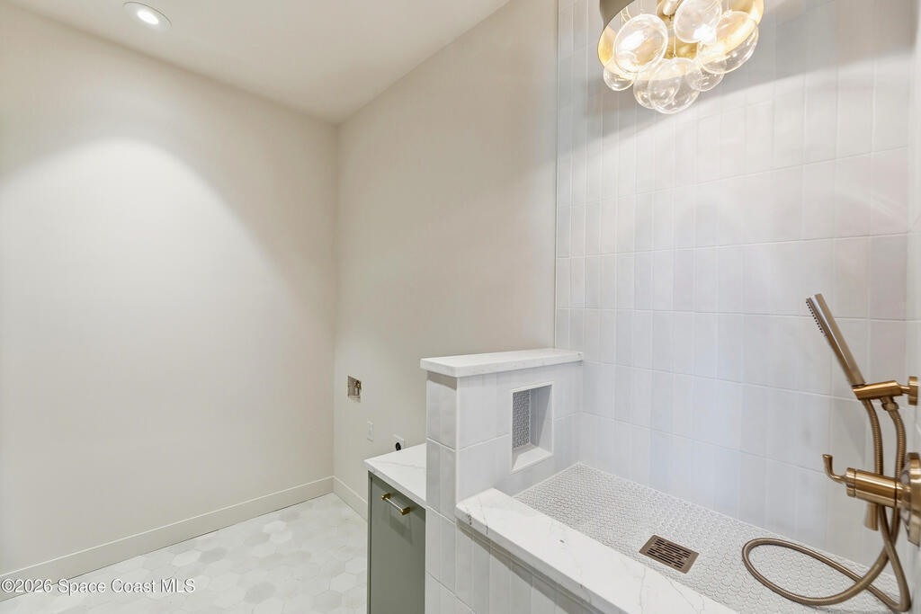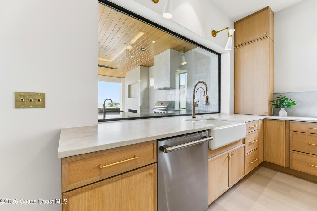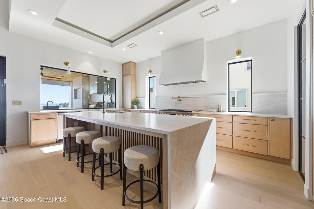 Experience waterfront living in this newly custom-built luxury home, perfectly positioned along the Intracoastal within the premier gated community of The Shores at Tranquility. Set on .45 acres with 69+ feet of direct waterfront, this 4-bedroom, 4-bath residence offers an oversized bonus room, a 4-car garage and is thoughtfully designed for both everyday comfort and elegant entertaining. A beautiful double-door entry welcomes you into 23-foot ceilings and 3-5 mile waterfront views showcased through oversized sliding glass doors, creating an unforgettable first impression with front-row views of Kennedy Space Center rocket launches, abundant wildlife, and breathtaking sunrises from the comfort of home.The heart of this home is a chef's kitchen featuring premium Monogram appliances, a 48-inch gas range with double ovens, six burners, and a griddle, quartz countertops with waterfall edges,