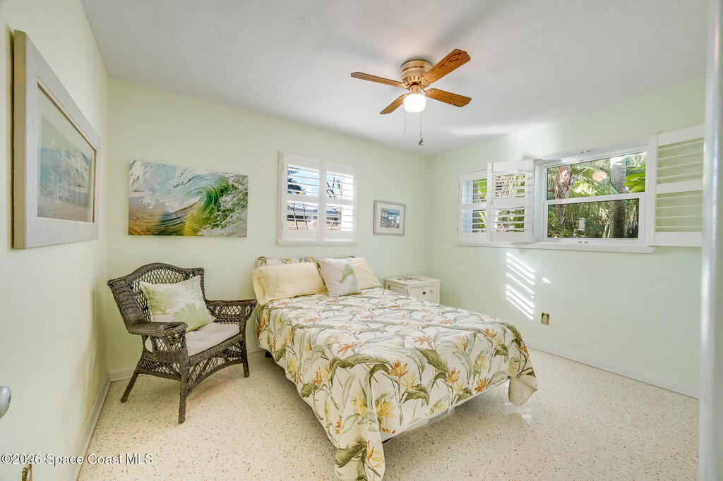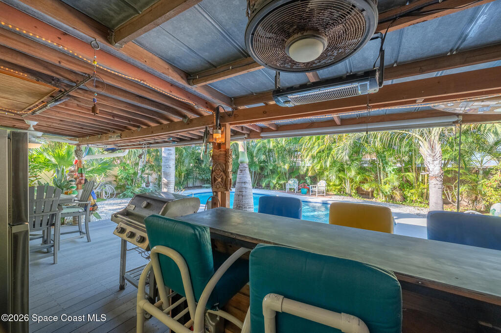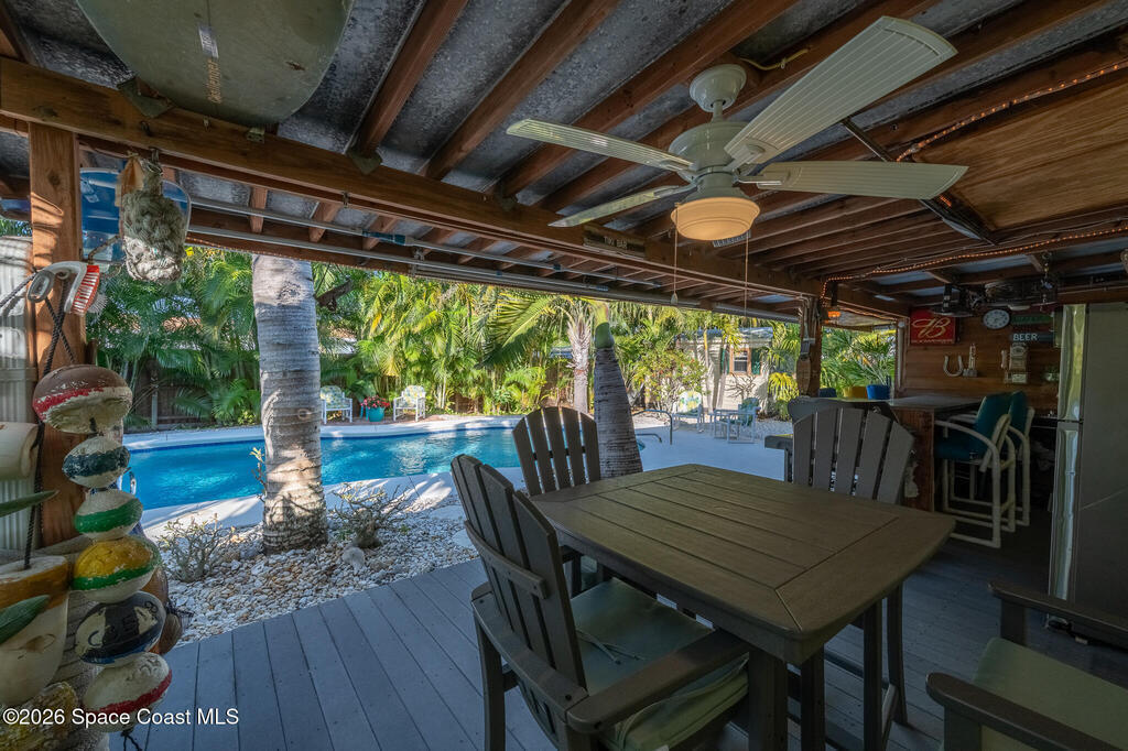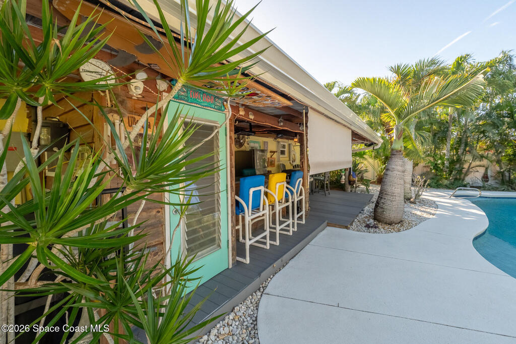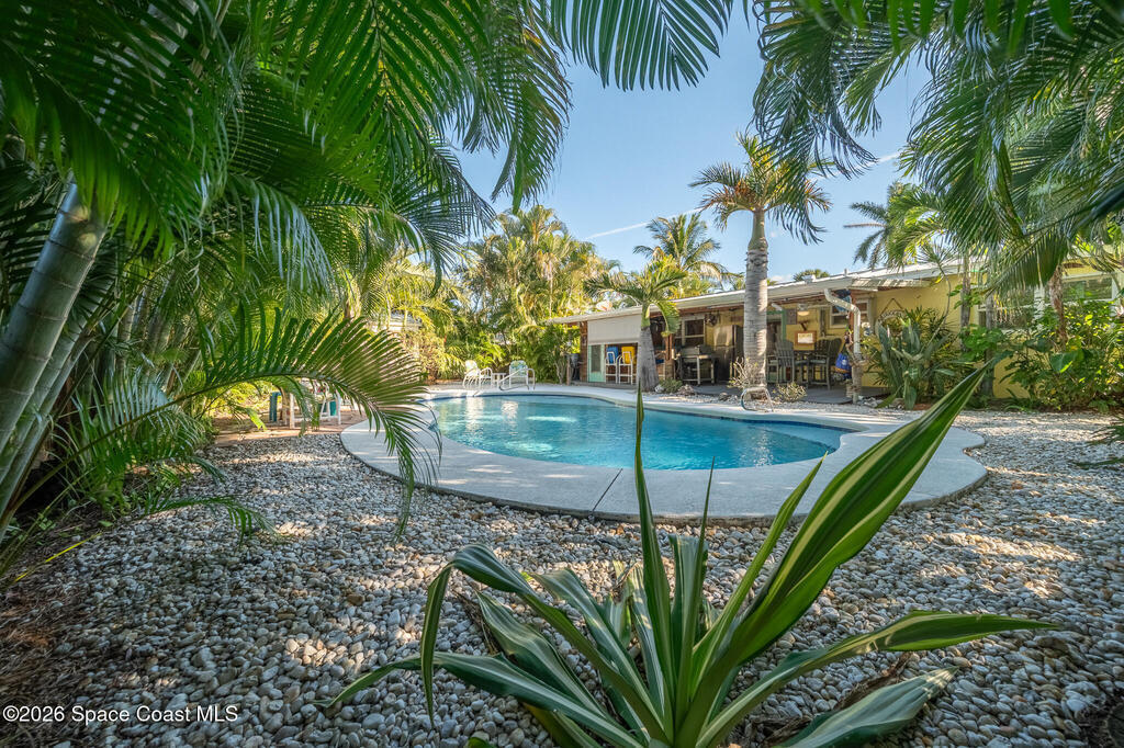 Bulletproof Satellite Beach 3/2 Pool Home. Just a 1,700-foot walk to the beach. CBS construction, 2021 standing seam metal roof secured with clips and straps, impact windows, and hurricane shutters. Energy efficiency with solar installed in 2021, average electric bill $27 per month, 14 SEER AC system, 200-amp service, and PVC Schedule 40 plumbing--no cast iron. Annual home insurance is $2,100. Enjoy outdoor living with a 2009 Aqua Blue pool, electric pool heater, insulated pool cover, new timer and pump, and a plastic/recycled patio deck with an epoxy-finished outdoor bar. The entire property is professionally rocked (no grass), and the fully fenced backyard offers privacy. This home has dedicated RV/boat parking with 30-amp electric and sewer hookups, plumbed with natural gas, new gutters, and polished terrazzo flooring throughout. City water and sewer. One hour from Orlando International Airport and Disney attractions. This is a rare, storm-hardened, energy-efficient coastal retreat.