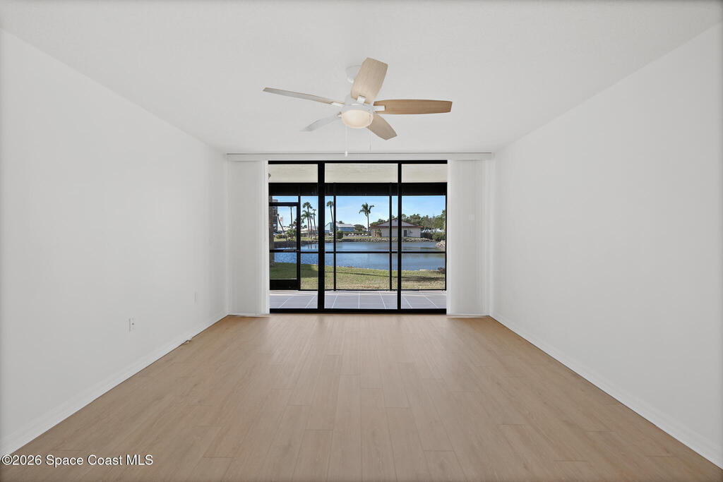 Gorgeous ground floor two bedroom two bath plus den condo in Costa Del Sol has been fully updated with new luxury plank flooring throught, new granite counters, new kitchen cabinets and appliances, large screen porch overlooks pond where you will be visited bby manatees, turtles and birds. Ceiling fans, full size washer and dryer, private one car garage, Community features two pools, clubhouse, tennis, fishing dock. Firm no pets