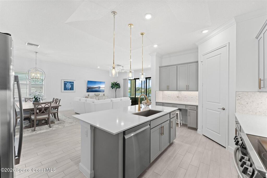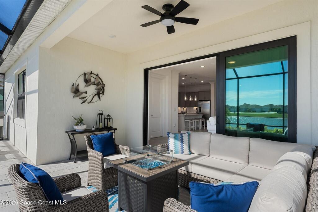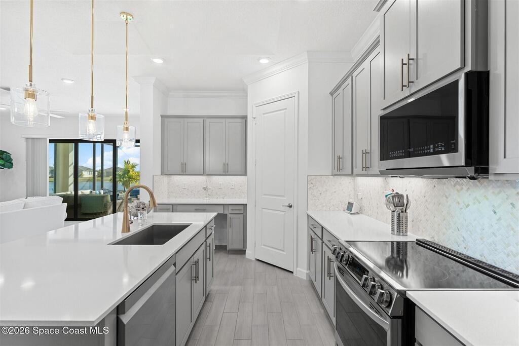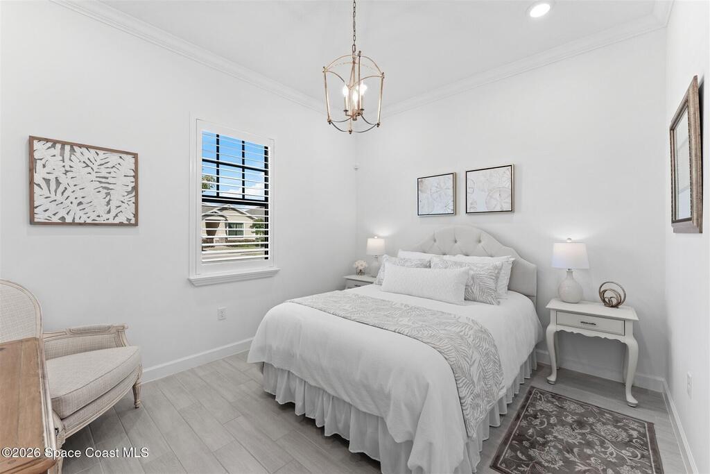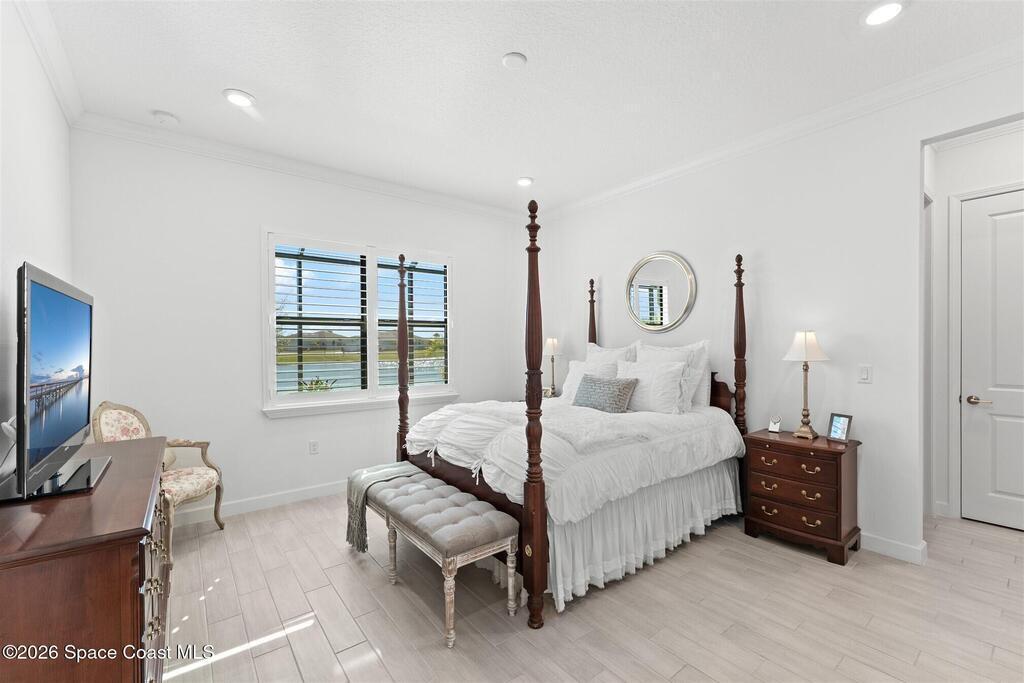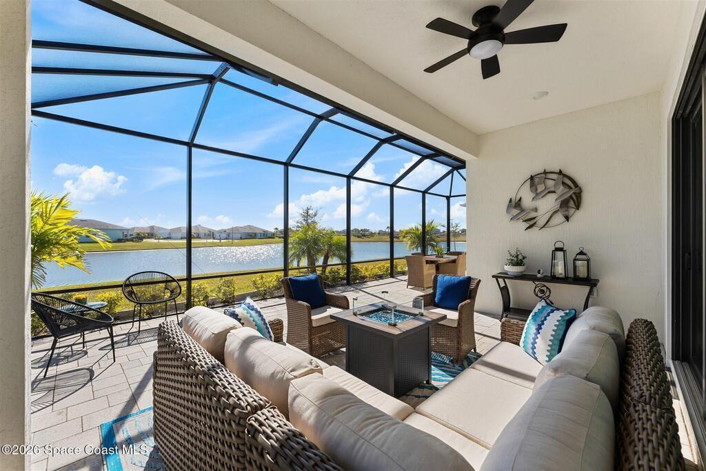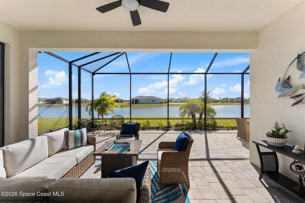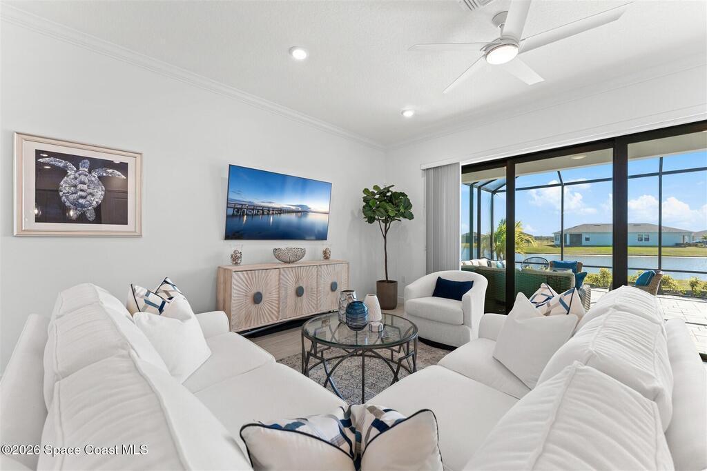 Waterfront, model home inspired, 3 bedroom plus den, 3 bath sophia plan in Bridgewater, Viera's resort style 55+ gated community! This stunning 3-year-old home is meticulously decorated in the popular palette of grays and whites and has every option: IMPACT WINDOWS & TRIPLE SLIDER, plank tile throughout, plantation shutters, crown molding, 8' doors, designer lighting, epoxy garage floors, and water filtration! The kitchen has a unique chamfered tray ceiling and is complete with upgraded appliances, a custom pantry and a gorgeous backsplash that highlights the gold toned faucet and cabinet pulls! One bedroom is an en-suite for those special overnight guests! Owner's suite has huge walk-in w/custom built-ins. Enjoy the lake views from the expanded screened lanai! Bridgewater's breathtaking private clubhouse has a heated pool & spa, fitness center, billiards room, lighted pickleball & tennis courts, and even a movie theater! Close to the ocean beaches, cruise ports, shopping and dining!