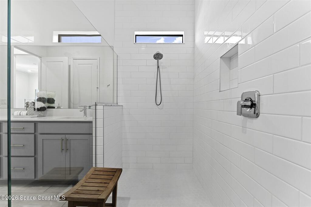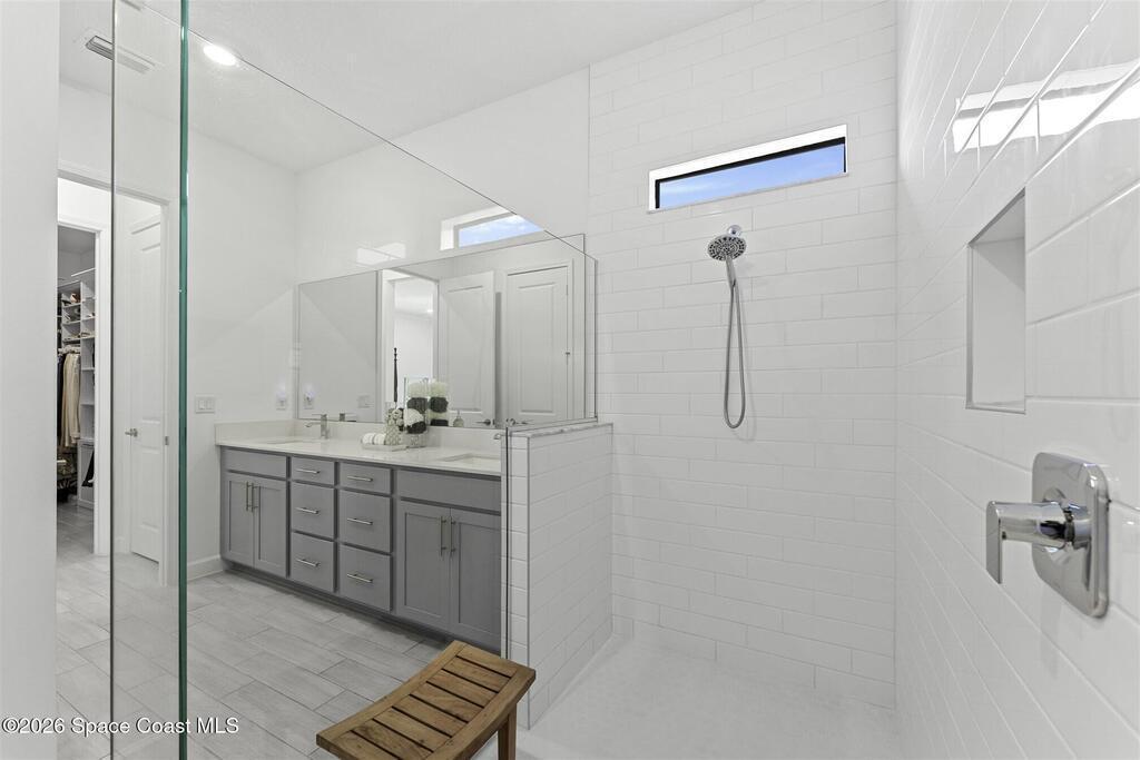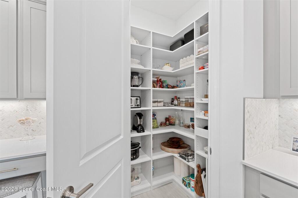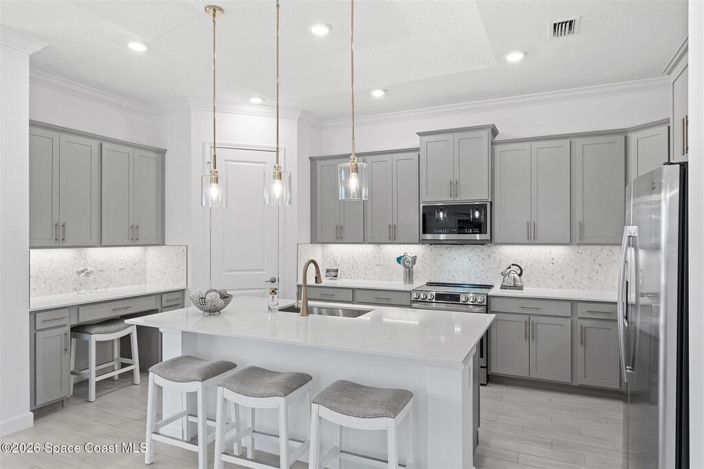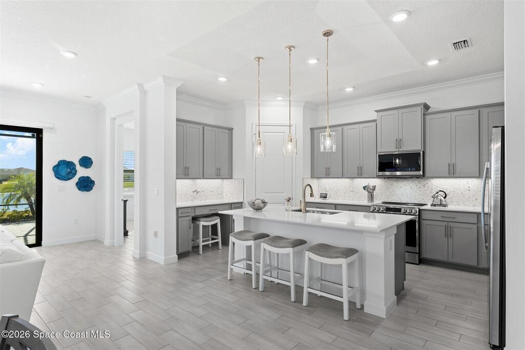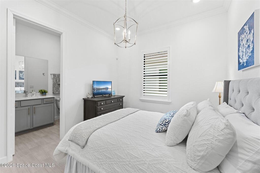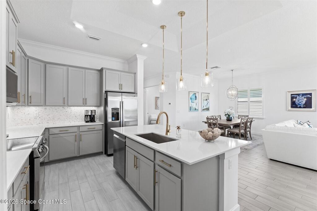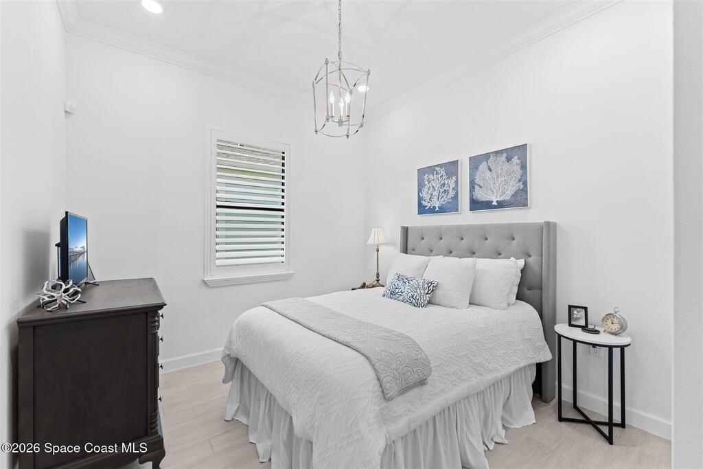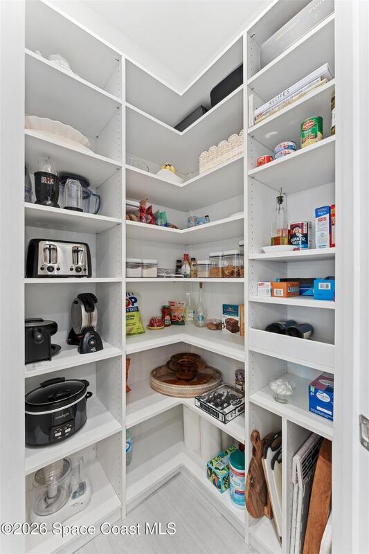 Waterfront, model home inspired, 3 bedroom plus den, 3 bath sophia plan in Bridgewater, Viera's resort style 55+ gated community! This stunning 3-year-old home is meticulously decorated in the popular palette of grays and whites and has every option: IMPACT WINDOWS & TRIPLE SLIDER, plank tile throughout, plantation shutters, crown molding, 8' doors, designer lighting, epoxy garage floors, and water filtration! The kitchen has a unique chamfered tray ceiling and is complete with upgraded appliances, a custom pantry and a gorgeous backsplash that highlights the gold toned faucet and cabinet pulls! One bedroom is an en-suite for those special overnight guests! Owner's suite has huge walk-in w/custom built-ins. Enjoy the lake views from the expanded screened lanai! Bridgewater's breathtaking private clubhouse has a heated pool & spa, fitness center, billiards room, lighted pickleball & tennis courts, and even a movie theater! Close to the ocean beaches, cruise ports, shopping and dining!