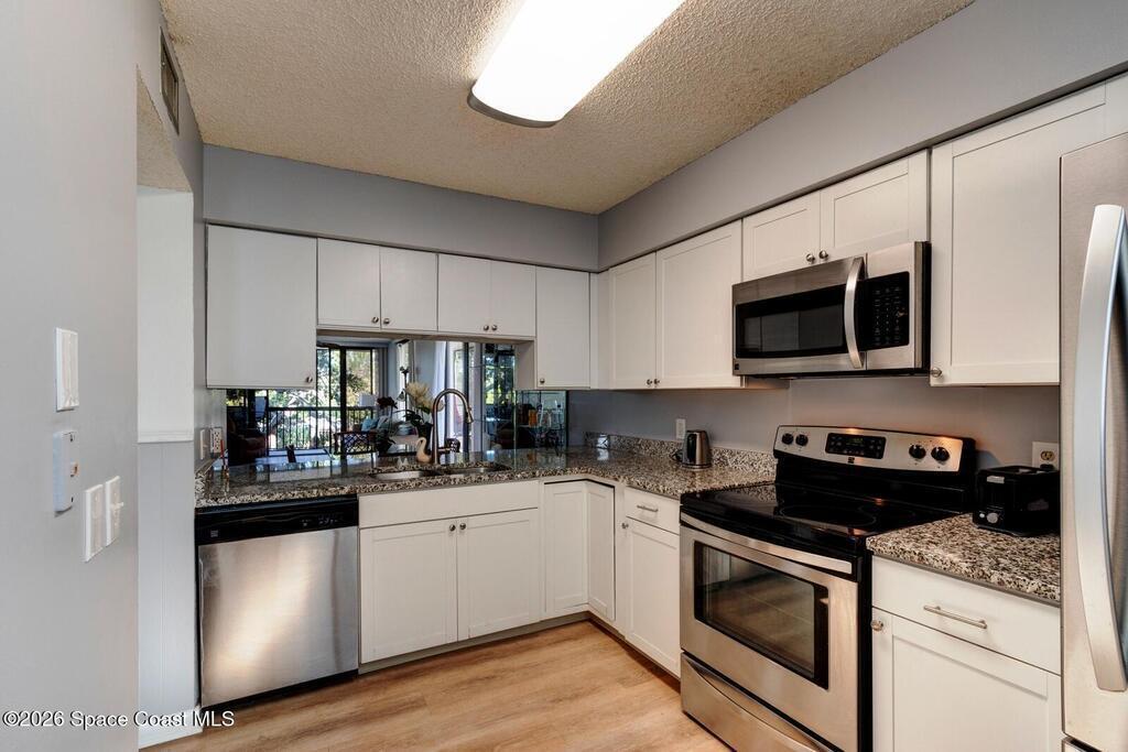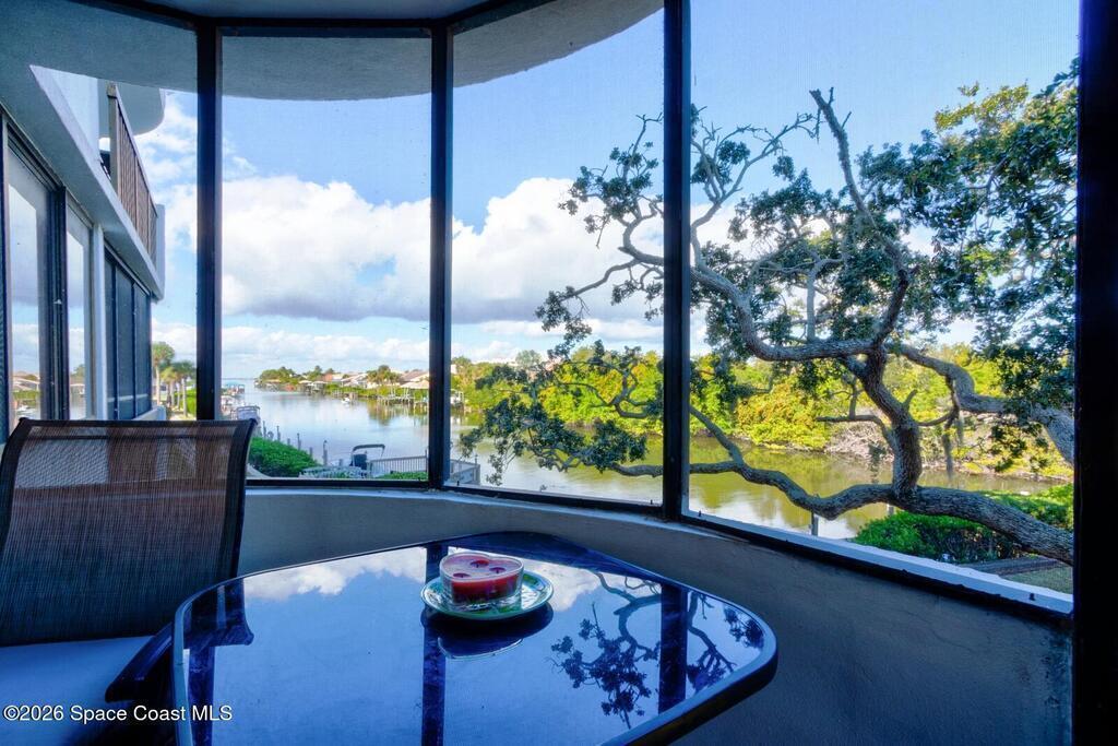 Experience relaxed waterfront living in this well-maintained two-bedroom, two-bath condo offering tranquil canal and riverfront surroundings in a gated community designed for boaters and nature lovers. This unit has been thoughtfully improved and is move-in ready, combining comfort, functionality, and long-term value. Inside, the residence features durable luxury vinyl plank flooring throughout, updated ceiling fans, and a bright, open living and dining area that flows seamlessly to a spacious wrap-around screened porch. The porch wraps two sides of the unit and provides peaceful water views, ideal for morning coffee, evening sunsets, or entertaining guests. The kitchen is equipped with granite countertops, stainless steel appliances, an electric range, garbage disposal, and updated shaker-style cabinetry, offering both style and practicality. An interior laundry room includes a full-size washer and dryer, conveniently located within the unit.