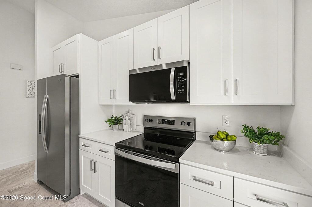 Discover your ideal living space in this new construction, MOVE-IN- READY home, meticulously designed for maximum comfort and convenience. This residence features 3 elegantly appointed bedrooms, 2 stylish bathrooms, and a practical 1-car garage. Each detail has been thoughtfully considered, from the tile flooring that extends throughout the home to the contemporary lighting and cabinetry. The primary suite has sliding glass doors leading to a covered back patio, a spacious walk-in closet, and a private en-suite bathroom for enhanced privacy. The kitchen is a standout, featuring white shaker cabinets with soft-close doors and drawers, quartz countertops, and stainless steel Whirlpool appliances. Experience the added security and energy efficiency of impact windows throughout the home. Additional highlights include the epoxy-coated garage floor, a private fenced backyard, and an efficient irrigation system. As an added incentive, the seller is offering $5,000 towards buyers closing cost