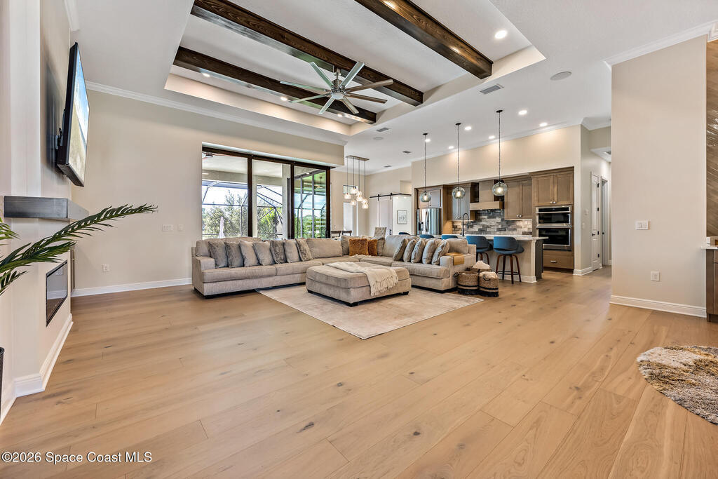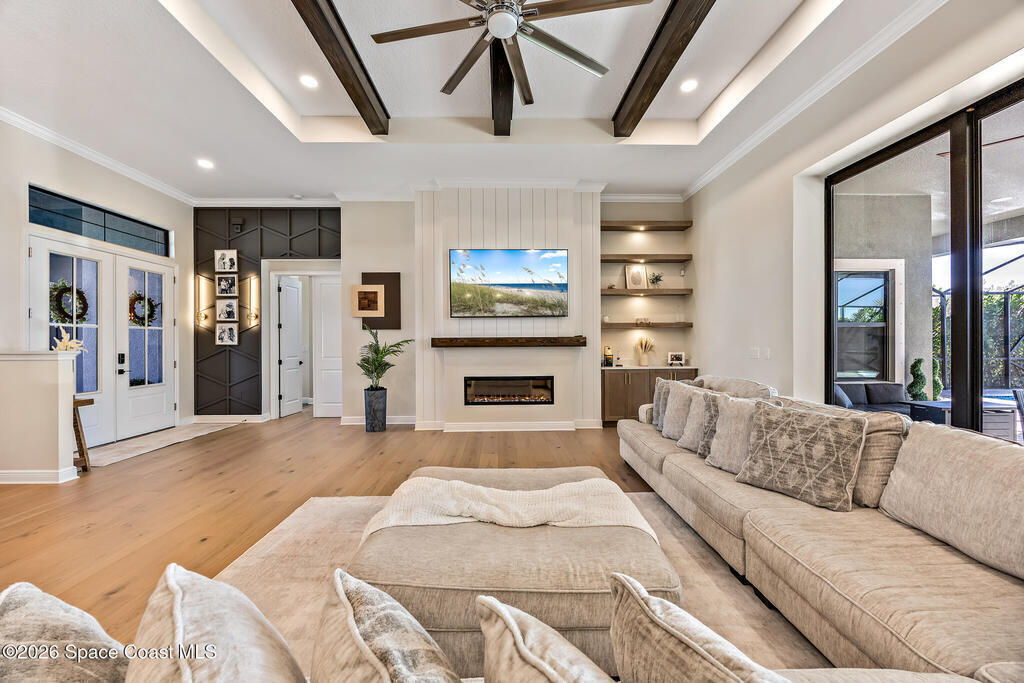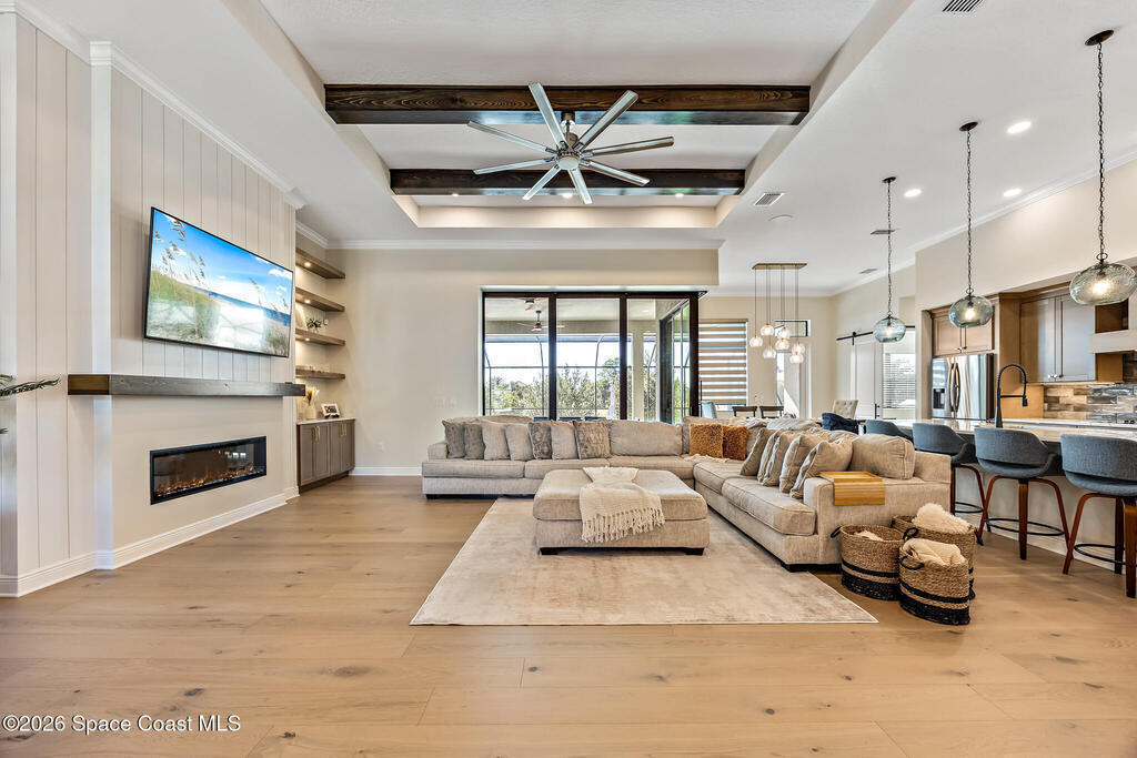 Step into modern luxury in this stunning 2023-built 4 bedroom, 3 bath home, thoughtfully designed for today's lifestyle. From the moment you arrive, you'll notice the attention to detail--the expansive living area showcases soaring 12 Foot ceilings, a custom fireplace wall with accent shelving, decorative feature walls, and built-in lighting, along with tray ceilings and wood beams in both the living room and primary suite. A beautifully appointed custom bar and sitting area adds another layer of luxury with a decorative tile wall, custom cabinetry, and Level 3 quartz--perfect for entertaining guests in style. Inside, the home delivers an impressive blend of style and functionality with 8' doors throughout, wood flooring in main areas, and custom tile in all wet spaces. The heart of the home is the chef's kitchen, featuring custom designed cabinetry, built-in stainless steel appliances,
