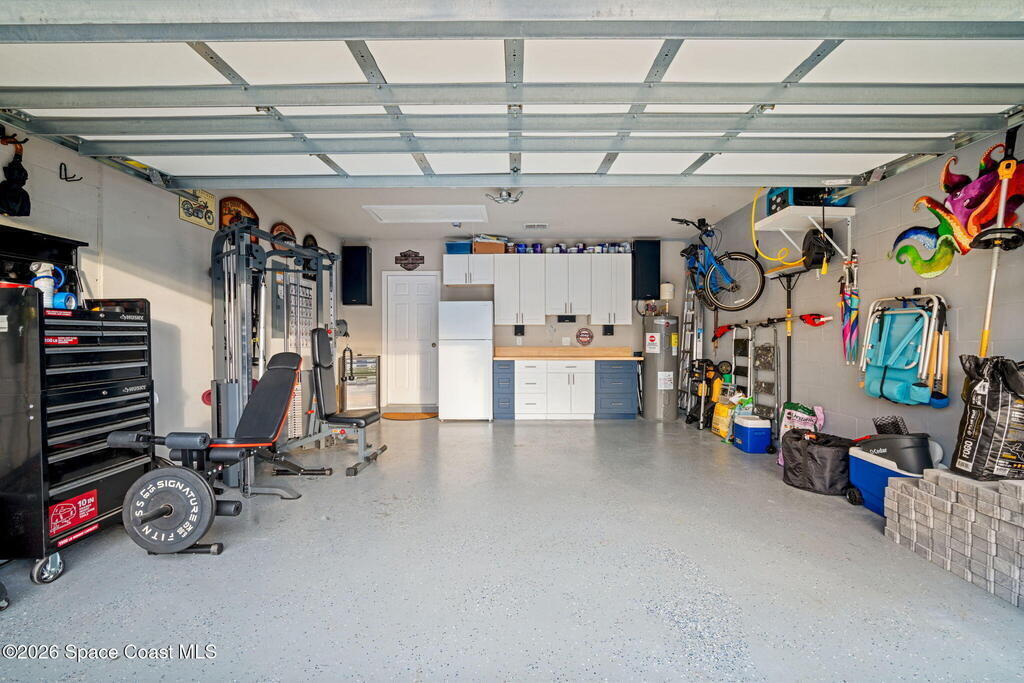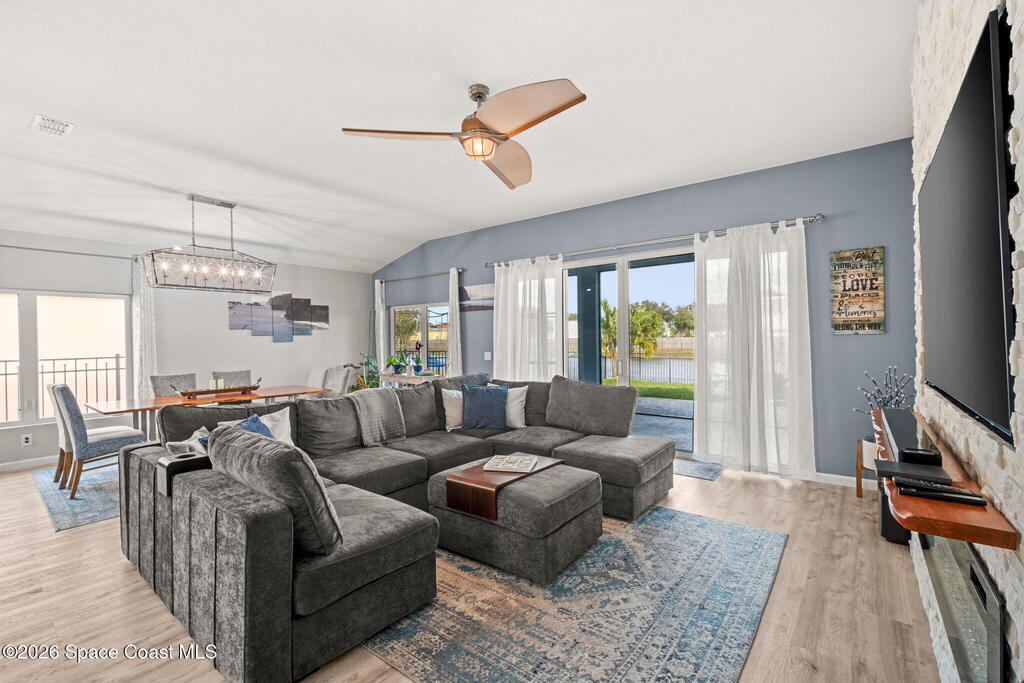 Enjoy the best of Florida living with waterfront views in this bright, updated home located in a gated community. The open floor plan features wood-plank laminate flooring and upgraded lighting for a light, airy feel. The kitchen offers a large island, quartz countertops, custom cabinetry, touch less faucet, smart refrigerator, and tile backsplash. A stone accent wall with built-in electric fireplace adds a modern and cozy touch to the living area. With a split floor plan the master en suite includes a walk-in shower, soaking tub, and spacious walk-in closet with custom shelving. Relax in the screened lanai overlooking a manicured, fenced backyard with new pavers, deck, and lakeside fire-pit area. Upgrades include impact windows and doors, 2023 AC and duct work, freshly painted interior and exterior, garage cabinetry, attic storage, new gutters, access gates, Ring doorbell, hardwired smoke detectors, instant-hot water system, automatic garage exhaust fan, and a Massey termite bond.