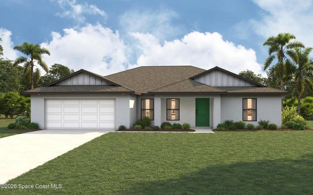 NEW CONSTRUCTION WITH WARRANTY! City water! Estimated delivery March 2026. The St. Augustine blends indoor and outdoor living with a welcoming covered front porch, expansive covered lanai, and a bright, open floor plan. A vaulted ceiling enhances the main living area, connecting the dining room with double windows, kitchen with freestanding island and pantry, and a spacious Great Room with a wall of sliding glass doors for abundant natural light. The split-bedroom layout offers a private primary suite with two walk-in closets and a bath featuring a dual-sink vanity, large linen closet, and tiled shower. Three additional bedrooms provide flexibility for guests, a home office, or hobby space. This home includes quartz countertops in the kitchen and baths, stainless steel appliances, plank tile flooring in main areas, hurricane-impact windows and doors, and more. Pictures, renderings, & virtual tour are of a similar home & are used for display purposes only.