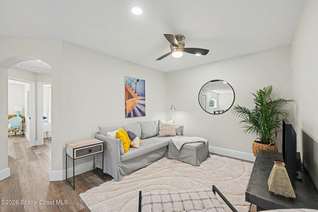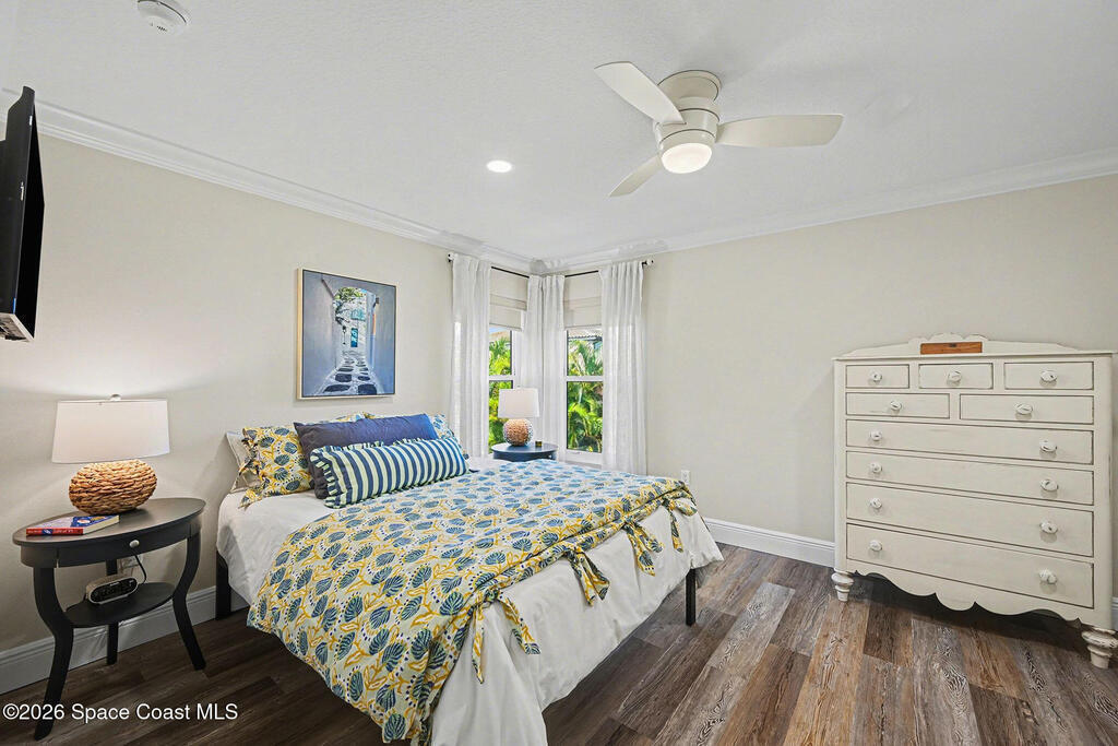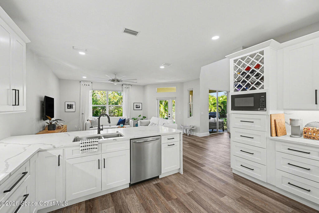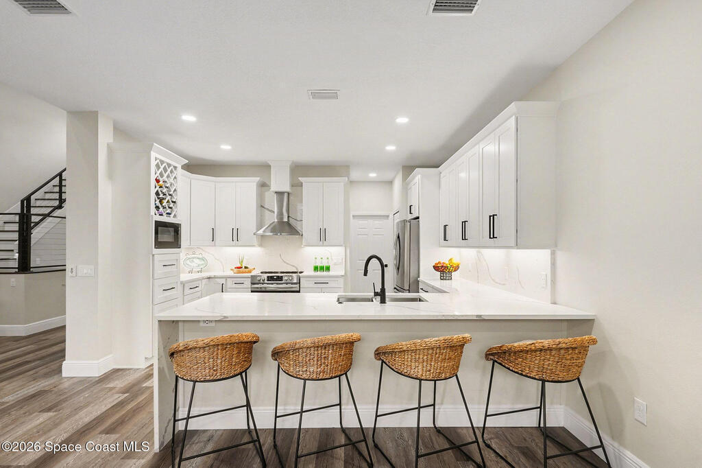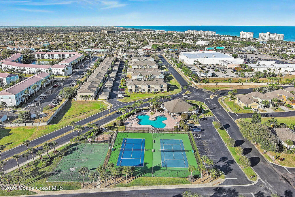 Gorgeous fully renovated end unit perfectly situated beachside gated community of Oceanside Village, offering resort-style amenities including pool, clubhouse, tennis, and basketball courts. This modern home features an open concept layout with a newly designed kitchen showcasing quartz countertops with waterfall edges and backsplash, under-cabinet lighting and newer stainless appliances. Luxury plank flooring, 7 inch baseboards throughout, hardwood stairs. All bathrooms have been tastefully updated with high-end finishes. Designer staircase & railing open the space and draw in natural light to the upstairs loft, ideal as a second family room or office. Updates include 2020 roof, newer air handlers, UV low-E impact glass windows upstairs for efficiency, fresh interior paint, new exterior paint, and custom blinds throughout. Building and flood insurance, roof replacement, exterior painting, landscape, grass, tree and shrubbery maintenance, irrigation, community amenities and security.