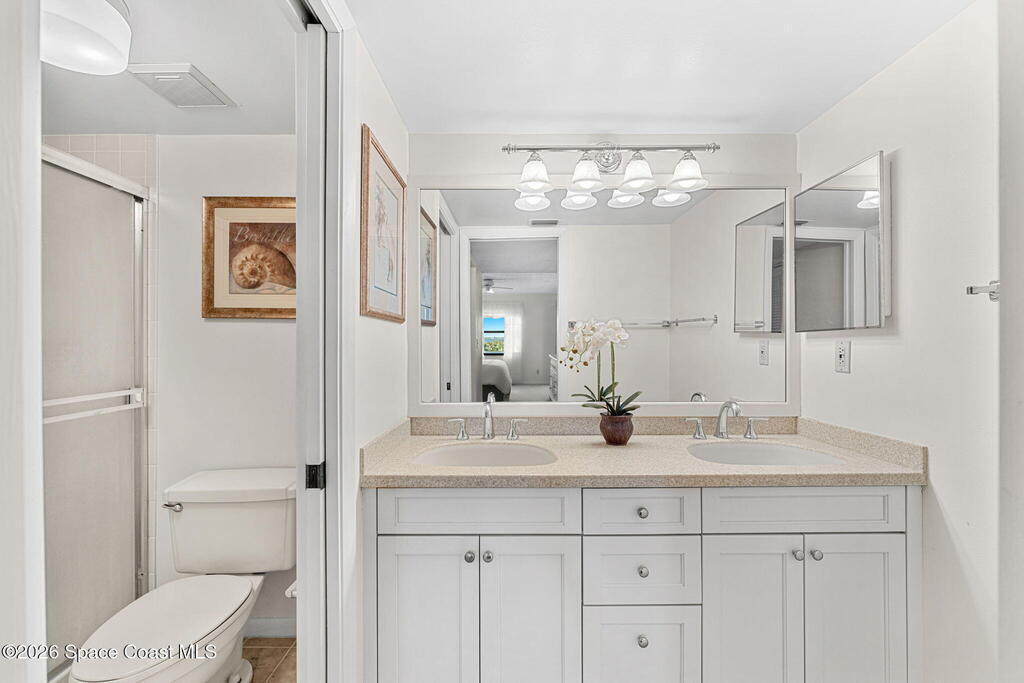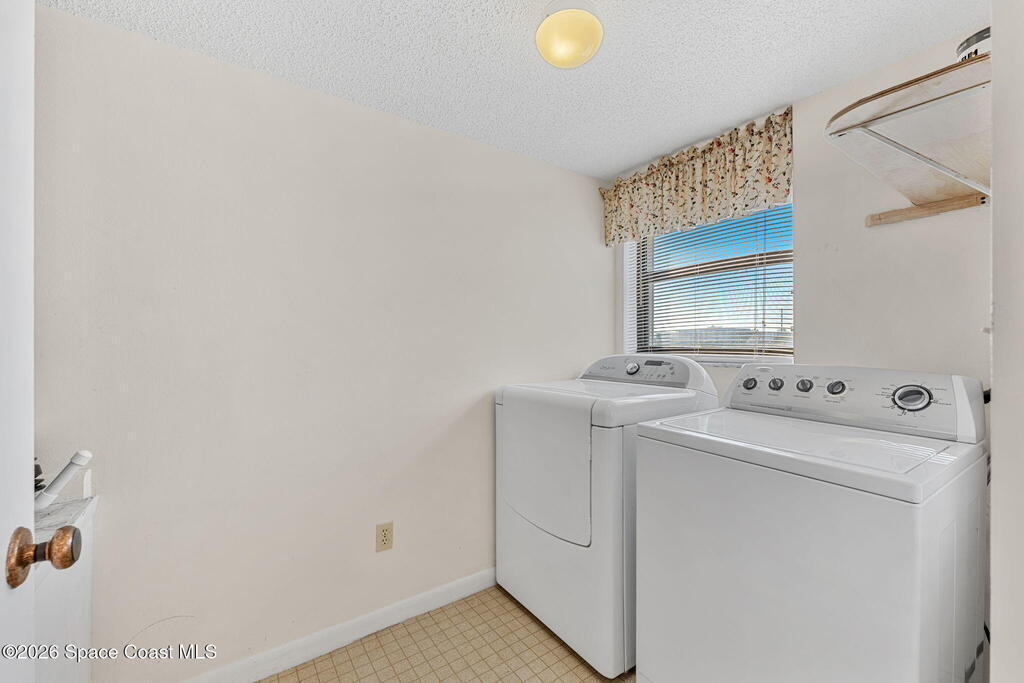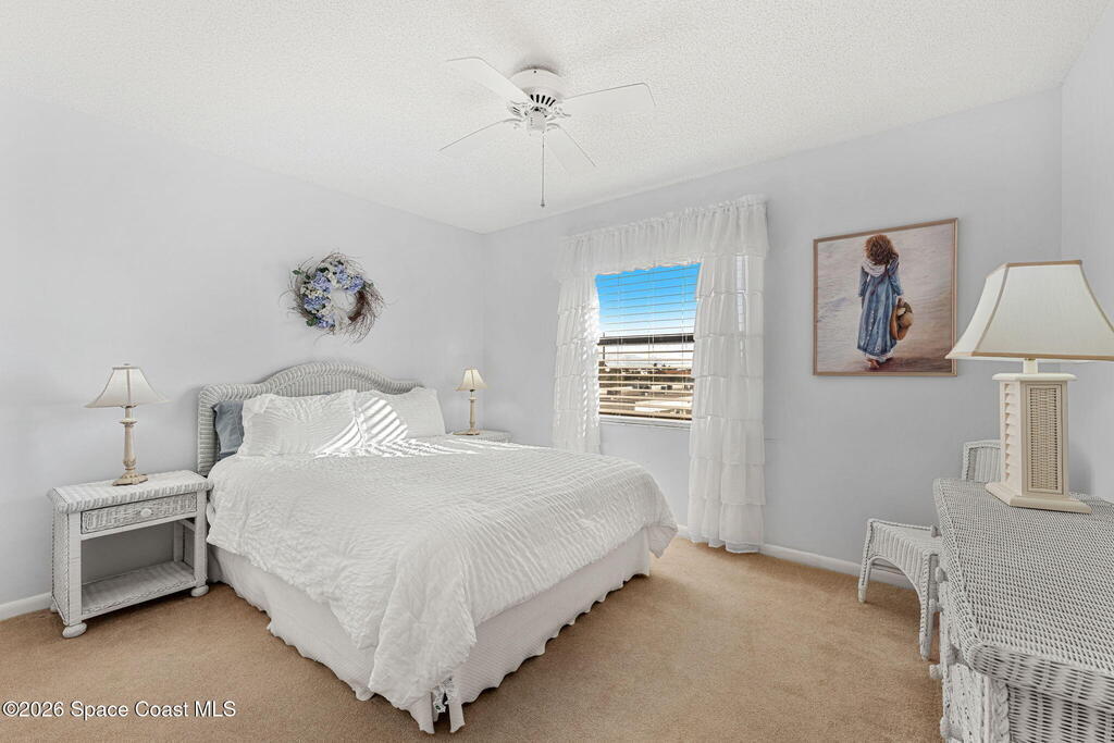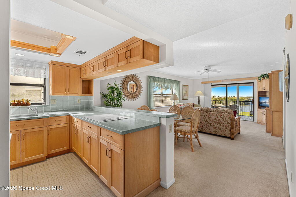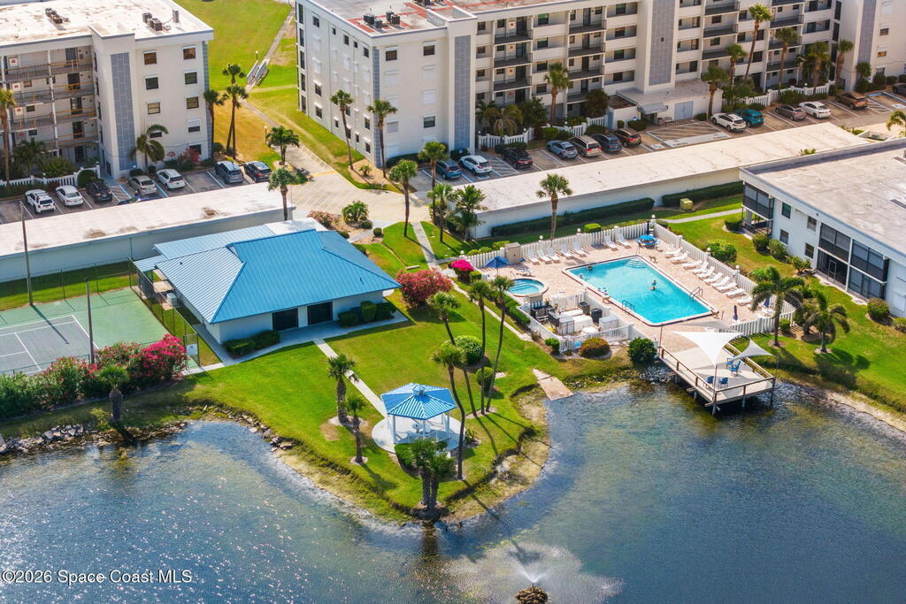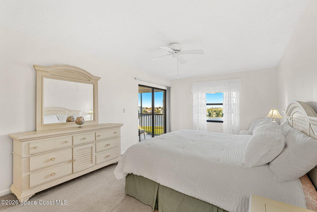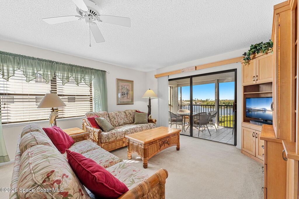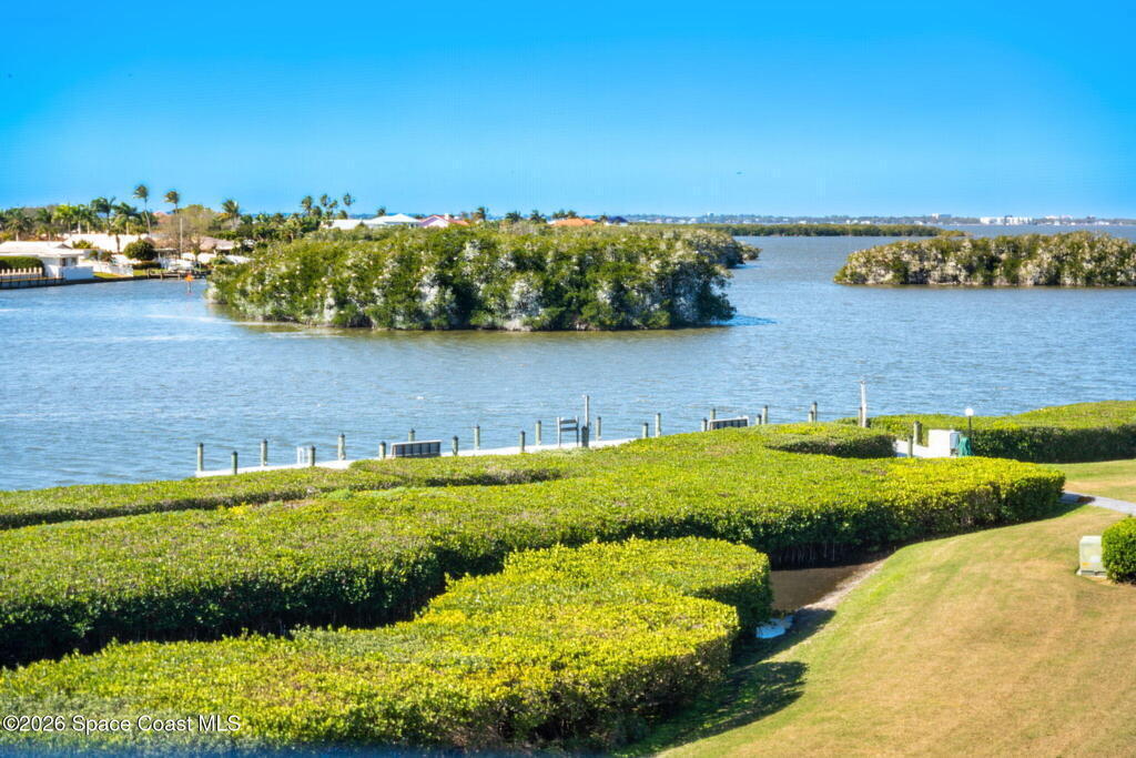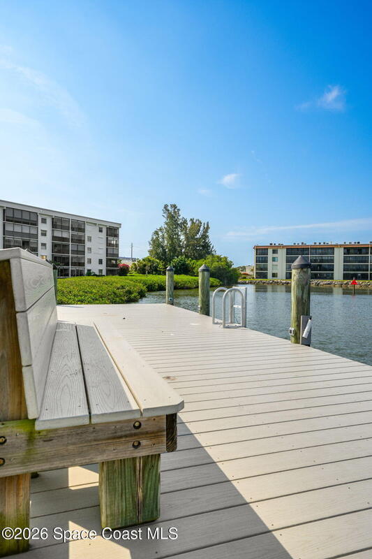 Rarely available 3-bedroom, 2-bath residence in Fountain Cove--an exceptional find in Cocoa Beach. Lovingly maintained as a second home, this fourth-floor unit offers custom wood cabinetry and Corian countertops in both the kitchen and baths, complemented by matching custom built-ins in the living room. Plush carpeting creates comfortable retreats in each bedroom. Enjoy sweeping Banana River views from the private balcony and the primary suite, where dual closets lead into a well-appointed en-suite bath. The balcony has recently completed restoration and is equipped with shutters for added peace of mind. Fountain Cove offers an inviting waterfront lifestyle with a pool, clubhouse, shuffleboard, river access, and car wash station. A deeded private one-car garage plus ample open parking complete this special offering.