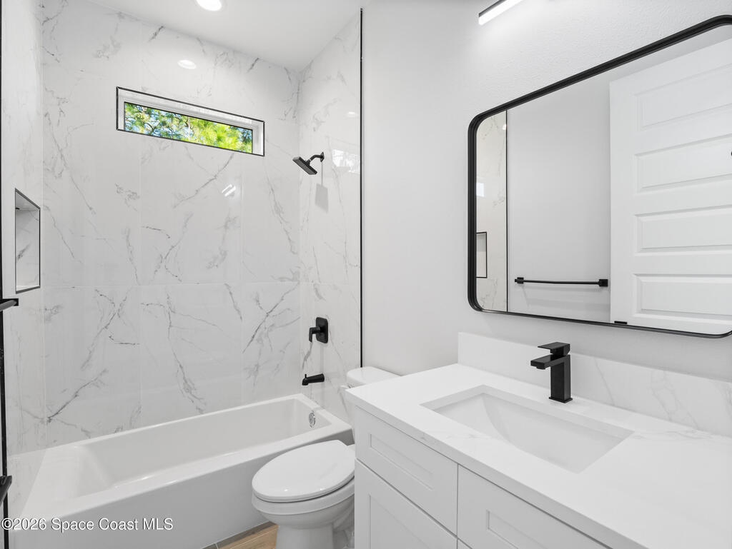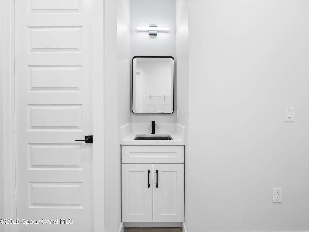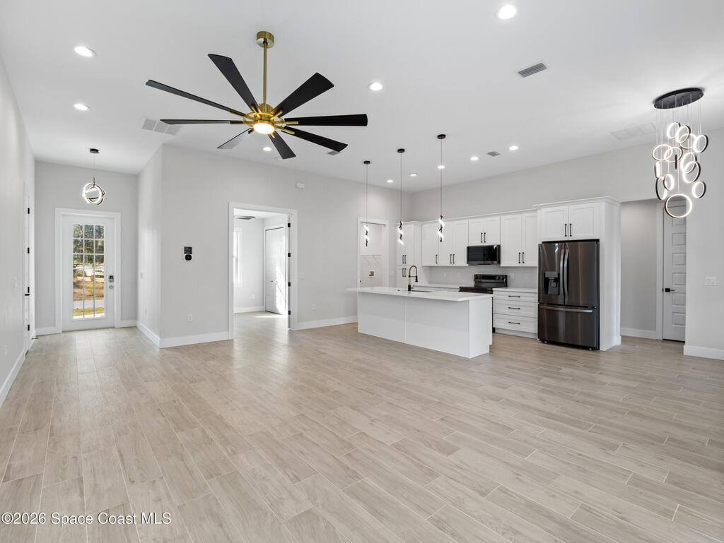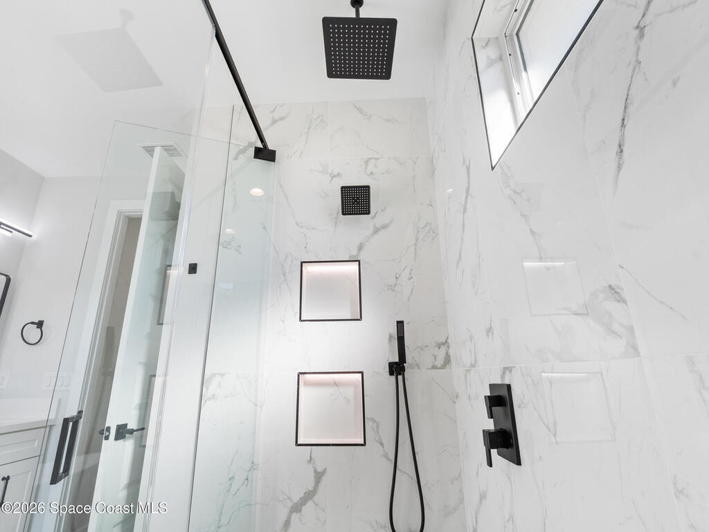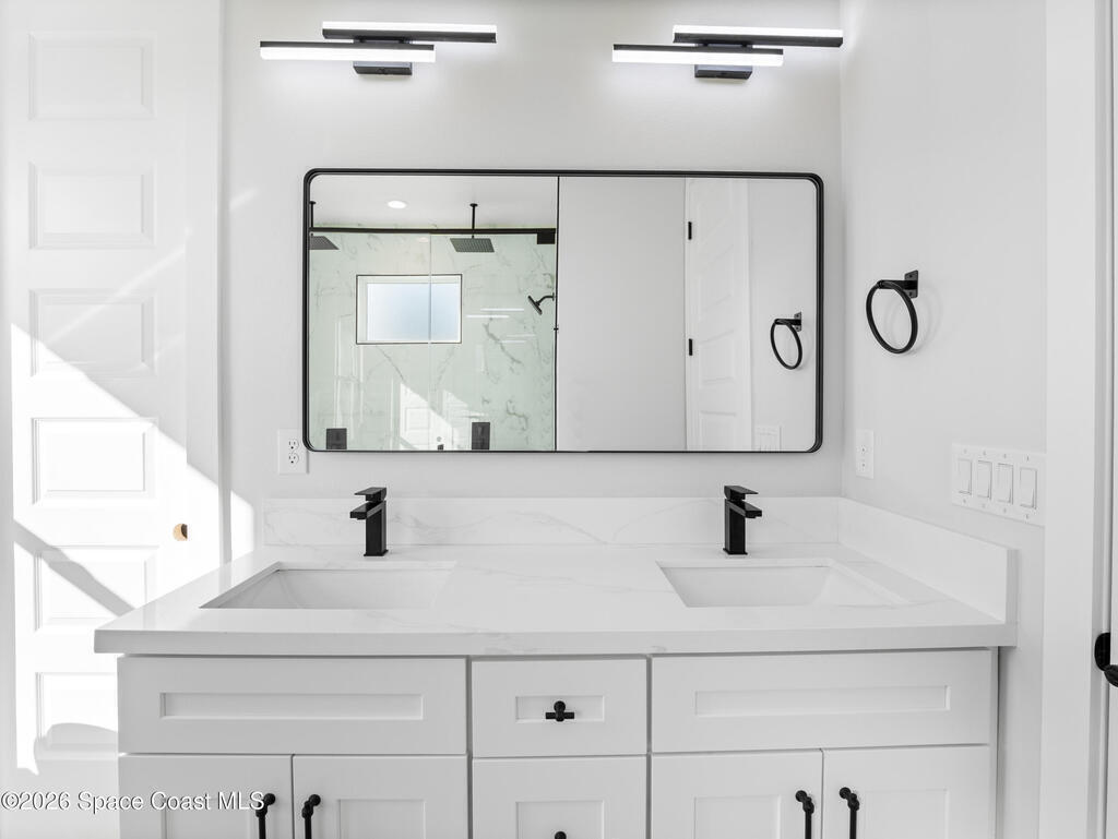 Impeccable craftsmanship and sophisticated design in the heart of Palm Bay, Florida. This stunning home embodies the essence of understated luxury, offering a serene retreat that blends modern high-end finishes with the relaxed atmosphere of the Space Coast. Every detail has been thoughtfully curated to provide a living experience that is both grand and inviting. The kitchen is anchored by a sprawling center island, perfect for entertaining or casual dining. This residence features lustrous quartz countertops not just in the kitchen, but carried seamlessly throughout the home, creating a cohesive aesthetic of elegance. Pristine tile flooring runs throughout the entire property, offering a cool, hypoallergenic, and sophisticated foundation that enhances the open, airy feel of the living spaces. The primary suite is a true sanctuary of relaxation. The en-suite bathroom rivals a high-end spa, featuring a grand walk-in shower equipped with dual rain shower heads, and a stand-alone bathtub