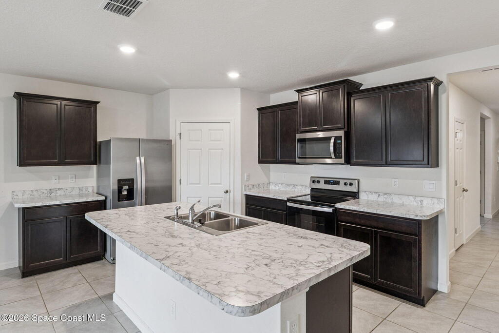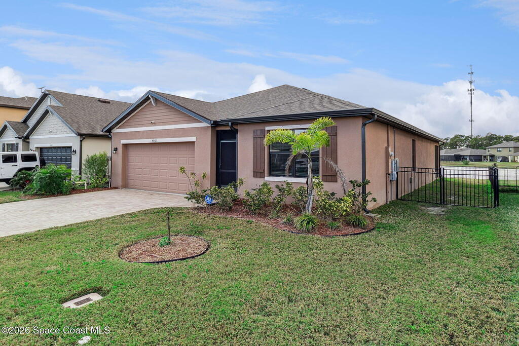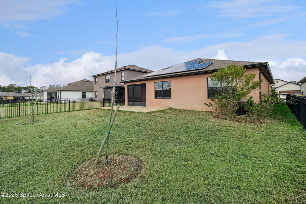 PAID OFF SOLAR panels make this move-in ready 4-bedroom, 2-bath home in Cocoa, Florida an exceptional value in the highly desirable Adamson Creek community. Built in 2022, this single-story, energy-efficient residence offers 1,830 square feet of open-concept living with a split-bedroom floor plan for privacy and functionality. The modern kitchen features a large island, pantry, and eat-in dining area, flowing seamlessly into spacious living and dining spaces with tile and carpet flooring throughout. The primary suite includes a walk-in closet and a walk-in shower. Enjoy peaceful pond views from the screened rear porch and a fully fenced backyard ideal for outdoor living and entertaining. Additional highlights include a 2-car garage, central air conditioning, in-unit laundry, and low quarterly HOA. Conveniently located near top-rated schools, shopping, dining, and major highways, this newer construction home offers the perfect blend of comfort, efficiency, and location in Brevard Cty,