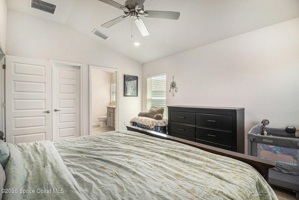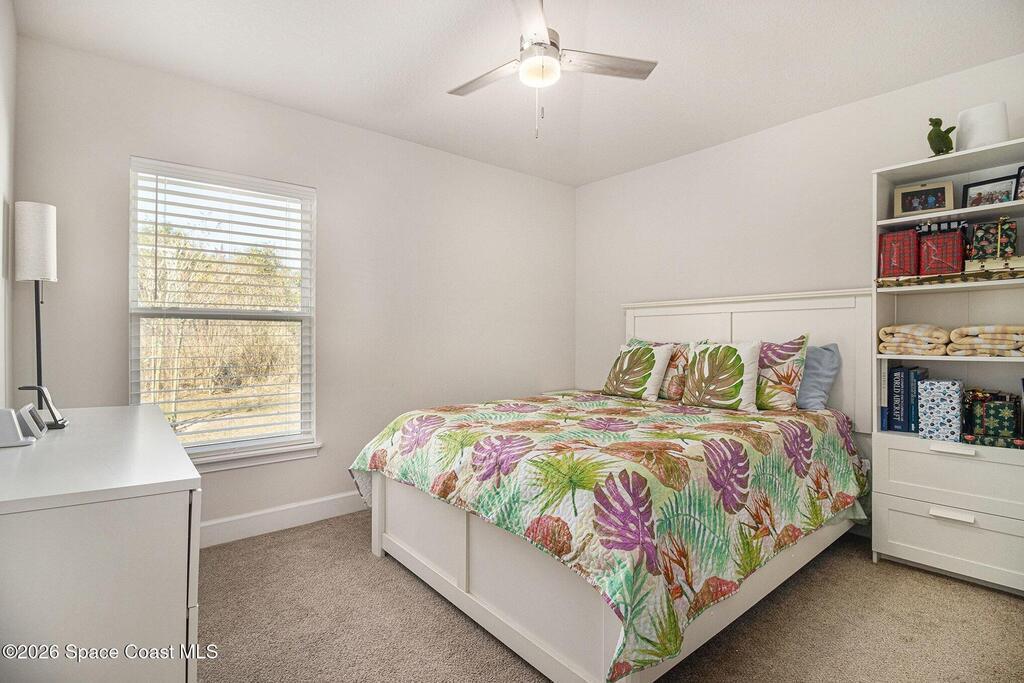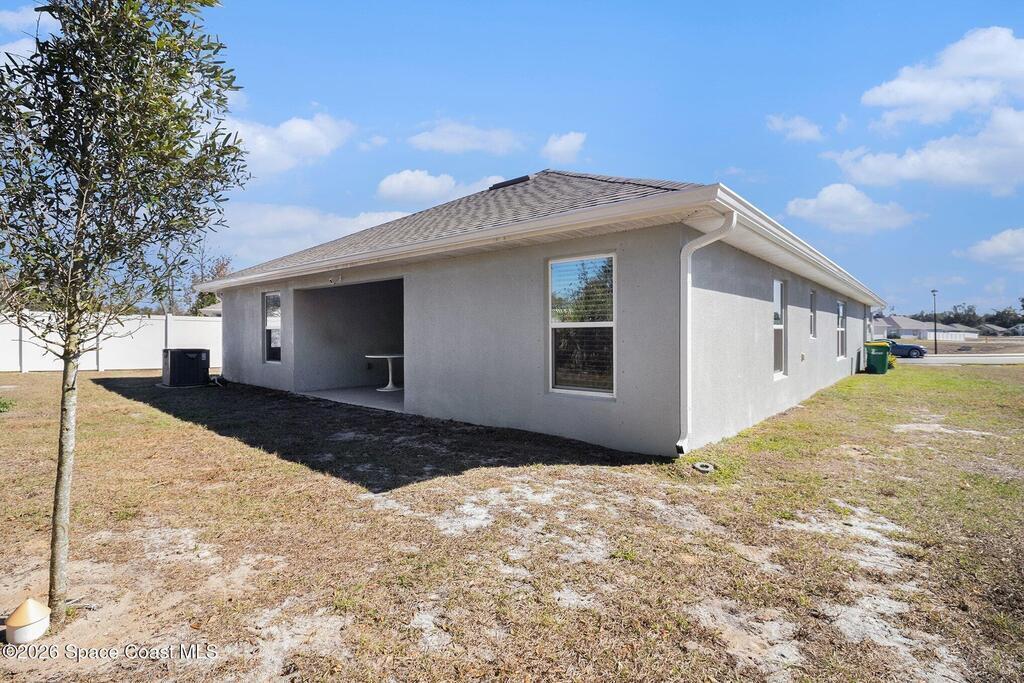 Nearly new, this one-owner home built in 2023 offers a spacious open-concept floor plan with 4 bedrooms, 2 bathrooms, and a 2-car garage. The kitchen features a breakfast bar, eat-in breakfast nook, pantry and separate dining area. The great room has French doors leading out to the covered patio that backs up to a wooded area for added privacy. This split plan home provides privacy, while the primary suite includes a walk-in closet, bath with dual sinks, and a walk-in shower. Additional features include indoor laundry, hurricane shutters, and irrigation system. Conveniently located minutes from shopping/dining, major highways, and Kennedy Space Center. Watch rocket launches from your own yard.