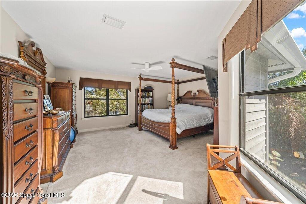 Step back in time to oak tree lined streets, sidewalk bike rides, and friendly conversations at the mailbox in the Sanctuary of Indialantic. This highly sought after guard gated community offers timeless charm and exceptional livability. The home showcases original, oak hardwood floors and solid oak cabinetry reflecting craftsmanship rarely found today, Soaring ceilings in the entryway, formal living room and dining room are accentuated by multiple tiers of windows that flood the home with natural light. Numerous French doors open to both the back and side decks creating seamless indoor/outdoor living and overlooking the generous backyard. The spacious kitchen features an eat in bay window, large center island, and pantry and opens to the adjoining family room with a classic brick fireplace. A first floor bedroom and full bath provide flexibility for multigenerational living. A large laundry room, oversized two car garage and abundant storage closets complete the main level.
