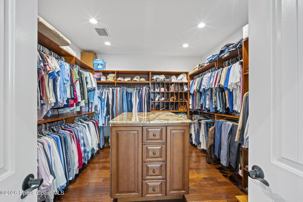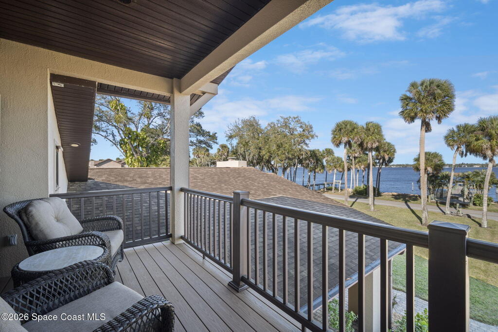 Located on Rockledge Drive, this exceptional riverfront home offers 149 feet of direct Indian River frontage. The oversized .74-acre lot provides rare privacy. The CBS home features two wood-burning fireplaces and dual primary suites, including an upper-level primary retreat with river views, private balcony, kitchenette, custom closets, and engineered hardwood flooring throughout the upper level. A main-level primary suite offers flexibility for guests or multigenerational living.The gourmet kitchen showcases custom Hickory cabinetry, Quartzite countertops, designer tile from Spain, and premium appliances. Recent upgrades include a new AC and tankless water heater (2025), updated windows and doors, renovated baths, Italian porcelain tile, and a custom Oak staircase.Outdoor living features a screened saltwater pool and hot tub, irrigation, and extra garage spaces.