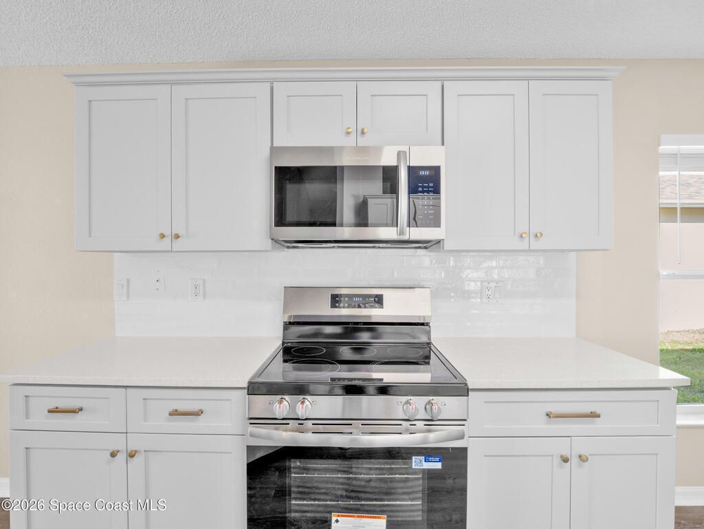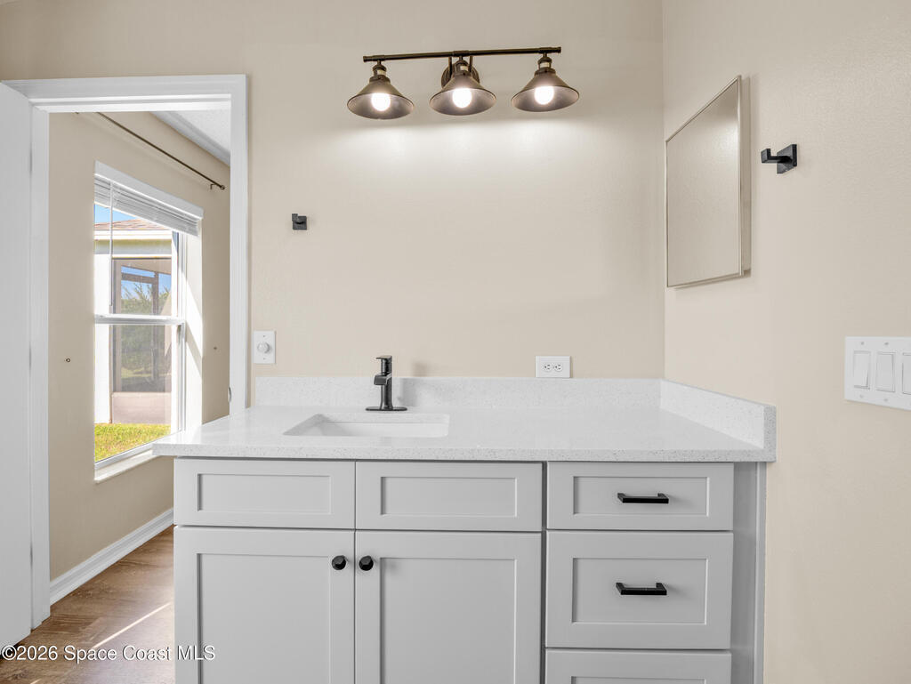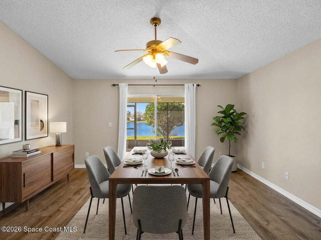 Beautiful lakefront living in this Viera home! A+ school schools Kitchen & baths fully renovated with new cabinets, gorgeous quartz countertops, sleek hardware, and faucetsNewly REMODELED Viera 4-BDRM lakefront property in A+ school district. Brand-new glass front door welcomes you into a home with stylish vinyl plank flooring throughout - no carpet! Kitchen & baths fully renovated with new cabinets, gorgeous quartz countertops, sleek hardware & faucets. Bathrooms also feature new glass-enclosed showers & toilets. Vaulted ceilings with open living & dining areas create a spacious atmosphere. The kitchen boasts a breakfast nook & large walk-in pantry. The sizable dining room provides access to a screened porch overlooking the lake. The primary suite offers lake views, a soaking tub, a separate shower & his-&-her closets. Laundry room off the kitchen. This home includes a 2-car garage. Enjoy the community pool and quiet streets, with close proximity to golf, shopping, dining, the new Wh