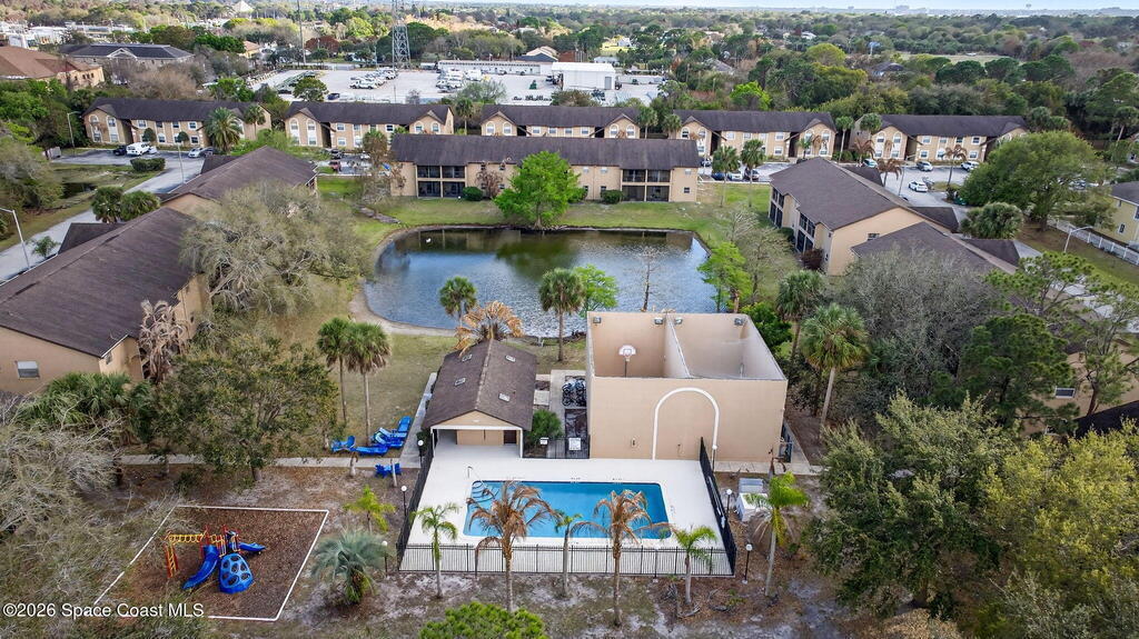 Centrally located spacious condo park like setting. View of the pond. First floor unit. Breakfast bar separate dining area. Solid Surface countertops. Community pool and playground. Easy access to 1-95 and the Beach Line. Ten minutes from Cape Canaveral. A Must See.
