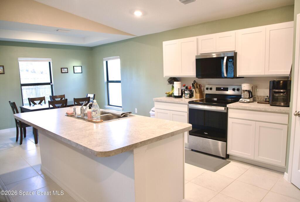 Spacious Great Room with vaulted ceilings and sliding glass doors that lead to a covered, private lanai--ideal for seamless indoor-outdoor living. The centrally located kitchen features a freestanding island, walk-in pantry, and opens to a bright dining area accented by a tray ceiling. The primary suite includes a generous walk-in closet and an en-suite bathroom with a dual-sink vanity, a walk-in shower, and a separate linen closet for added storage. Additional features include hurricane-impact windows and doors, tile flooring throughout the main living areas, designer cabinetry in both the kitchen and bathrooms, stainless steel appliances, and an attached two-car garage. A newly installed privacy fence enhances the outdoor space, offering both comfort and seclusion. This home is move-in ready, and even Includes the washer and dryer!