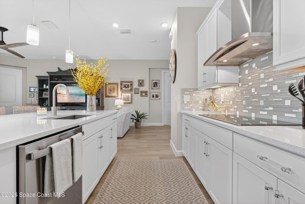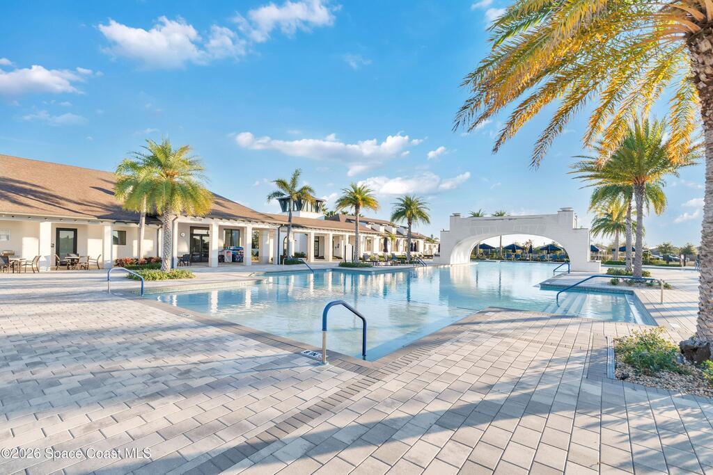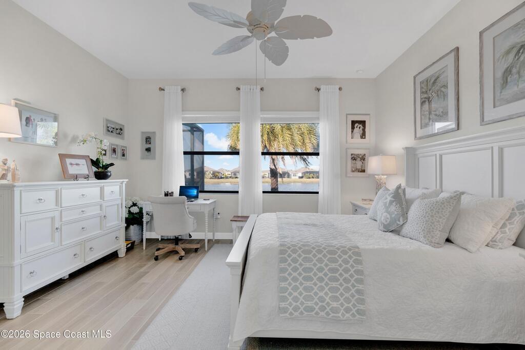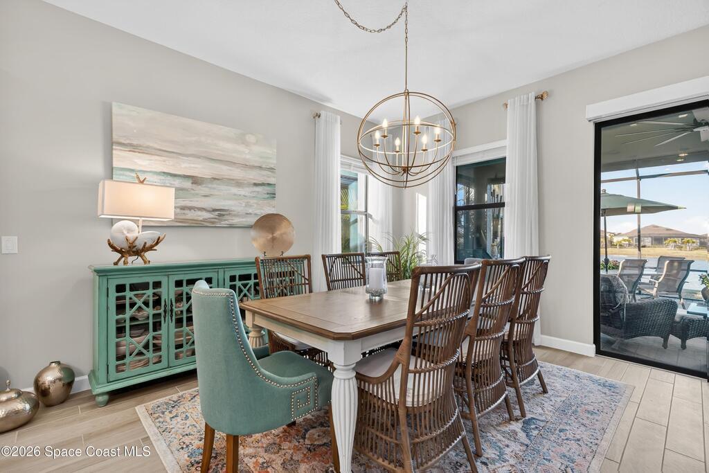 Waterfront Luxury Defined in this rare single-story gem, boasting one of the most expansive lake views in the community. Forget maintenance; this home is about pure enjoyment. The star of the show is the massive, upgraded paver lanai--an expensive, extended outdoor living space featuring soaring ceilings and a sleek electronic hurricane screen for effortless protection because no one wants to move lawn furniture. Inside, the ''no carpet'' lifestyle shines with premium light wood-look tile throughout. The kitchen is a showstopper: quartz countertops, 42-inch designer cabinets, a massive social island, and high-end stainless appliances. Retreat to a private owner's suite or utilize the flexible 3rd bedroom with French doors as your executive office or hobby sanctuary. From the whimsical starfish accents in the laundry to the resort-style amenities & included lawn care, every detail is designed for high-end, low-stress living. This is the upgraded waterfront retreat you've been waiting for.