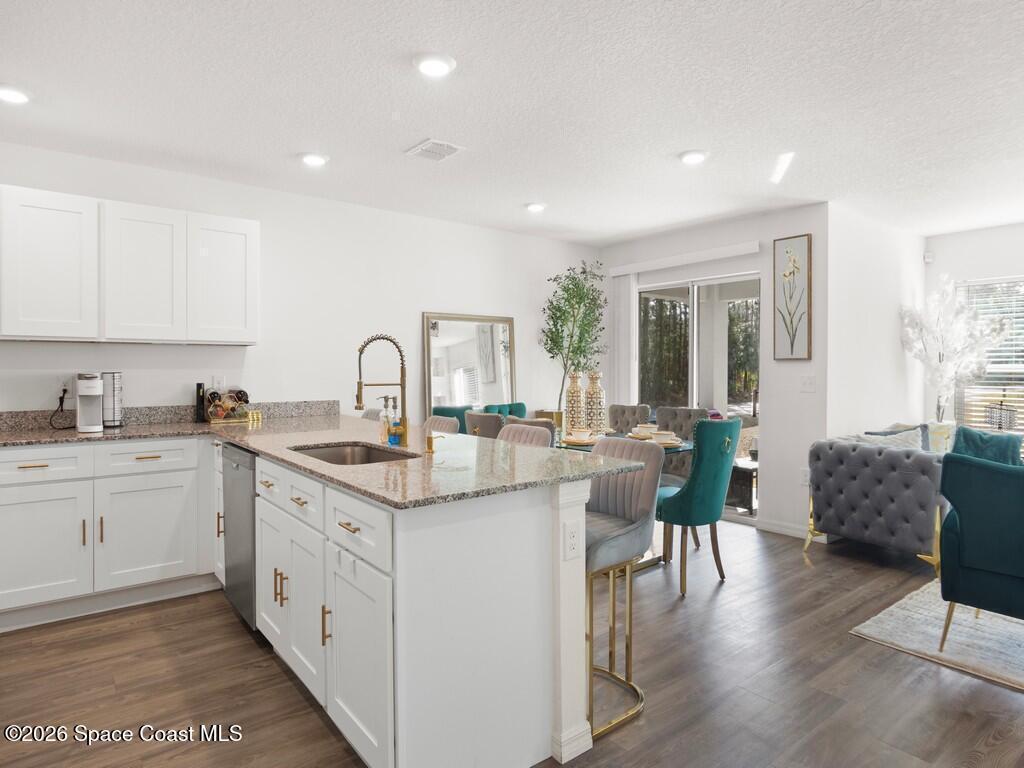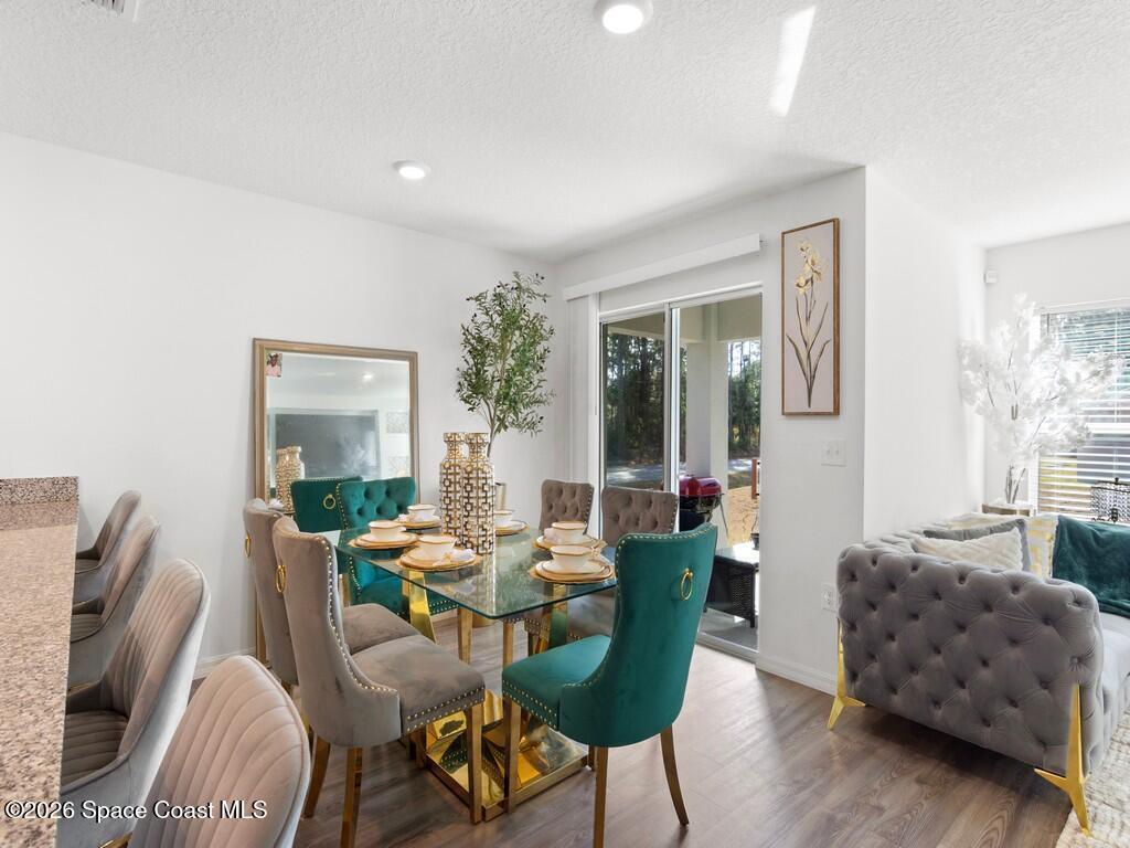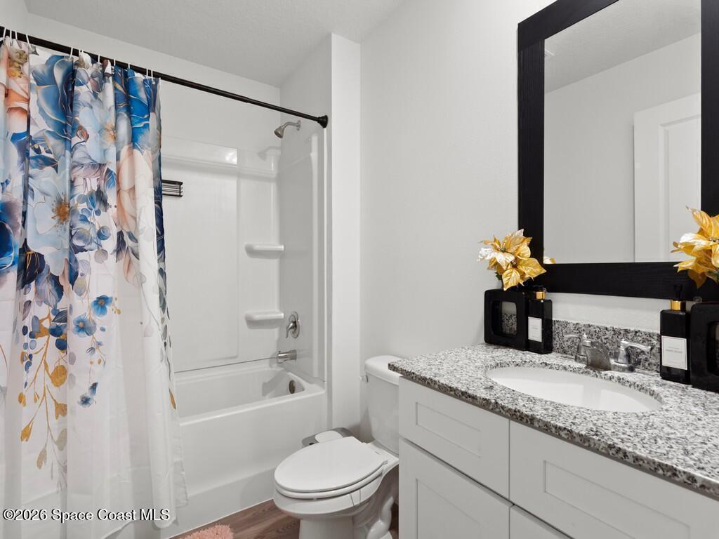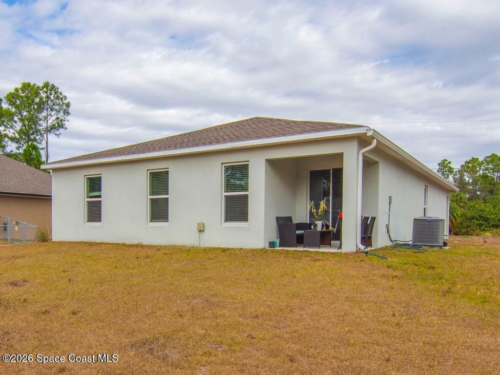 Gorgeous and spacious 3-bedroom, 2-bath single-family home located in the desirable Palm Bay community. This home offers a split-bedroom floor plan, providing privacy with the primary suite situated on its own side of the home. A versatile den with a door functions perfectly as a fourth bedroom, home office, or guest space. The thoughtfully designed layout offers ample storage and comfortable living throughout. Enjoy a full-size laundry room with full-size washer and dryer. The beautiful kitchen features white cabinetry, granite countertops, stainless steel appliances, and is open to the living and dining areas, ideal for entertaining. The primary suite includes a generously sized walk-in closet and dual vanity sinks. Additional highlights include a two-car garage, rear porch, and a large corner-lot yard, perfect for families or pets, with only one neighboring home. Conveniently located minutes from Publix, shopping, dining, and everyday conveniences in a growing community.