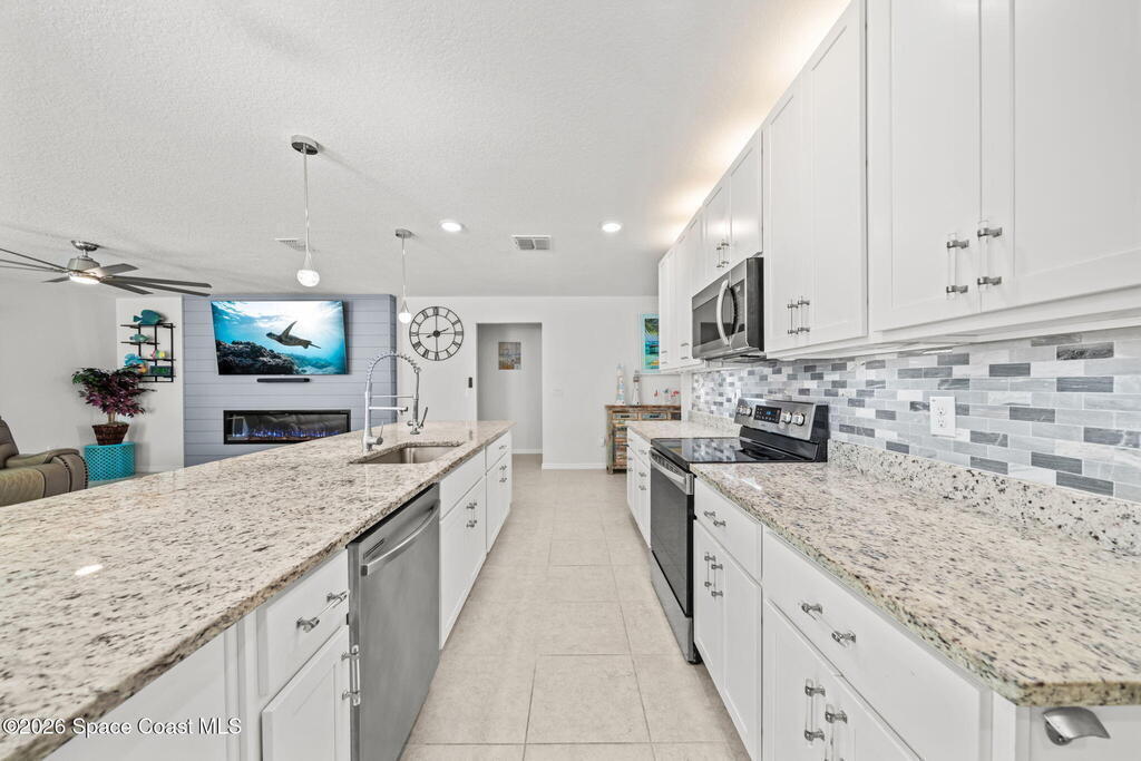 Move-in ready, with over $100,000 in upgrades! Built in 2021, this immaculate 3-bedroom, 2-bath home features a versatile office/den flex room- perfect for remote work, creative pursuits, or guests.Step outside to your own backyard oasis: a professionally landscaped and fenced backyard surrounds a screened-in, HEATED SALTWATER POOL & SPA. The expansive pool area is ideal for entertaining, relaxing, or enjoying Florida's beautiful weather year-round. Remote-controlled hurricane patio shade adds comfort and protection. Nestled on a premium lot with canal views and no direct rear neighbors, this home offers exceptional privacy & tranquility.Inside, the open concept living space features tile flooring throughout, professional interior paint, upgraded modern light fixtures, and blinds. The spacious great room boasts a custom TV and fireplace feature wall with an 80'' TV that conveys. The primary suite is generously sized, offering a custom walk-in closet and a spa-like ensuite bath.
