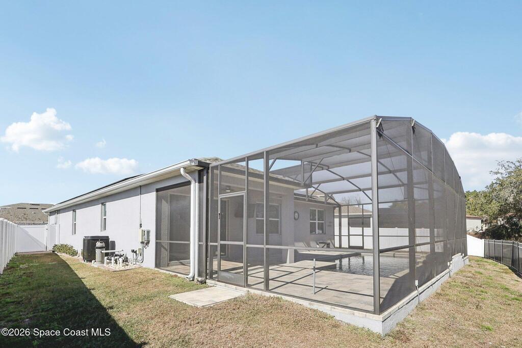 Beautifully upgraded and designed for ultimate Florida living, this 2023 built 4 bedroom, 2 bath home offers a modern open-concept layout on a private waterfront pond lot backing to a protected wildlife preserve, providing lasting privacy and peaceful views. Enjoy year round outdoor living with a resort style inground pool, perfect for relaxing or entertaining. Inside, the home features a gourmet kitchen with upgraded finishes, upgraded flooring, and energy-efficient construction. Paid-off solar panels add long-term value and efficiency. Conveniently located near major space industry employers, shopping, and dining, this home delivers luxury, comfort, and efficiency in one exceptional property.