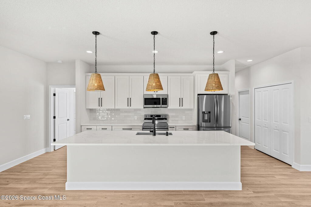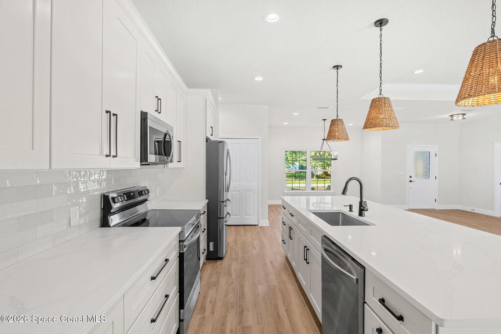 Brand new and built like a custom house, this Arianna model by a renowned local builder delivers 2,074 sq ft of premium, storm-smart design with 4 bedrooms, 2.5 baths, and zero HOA, pairing underground power, an impact-rated front door, impact-rated garage door, PGT impact windows, and an impact-rated sliding glass door for everyday confidence. A 24-ga standing seam metal roof secured with double straps and FORTIFIED Gold(tm) certification reinforces the home's most vulnerable points to help keep high winds, wind-driven rain, and storm pressures where they belong--outside--while wood-look tile throughout creates a clean, cohesive finish that's both polished and practical. The backyard is ready for a new pool with septic located in the NE corner of the front yard. Modern essentials stay dialed in with a tankless water heater plus city water paired with septic, making this new build feel elevated from the bones outward--simple, solid, and built for peace of mind.