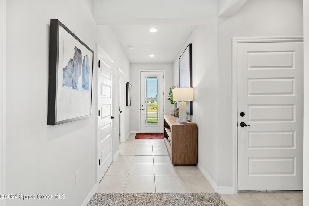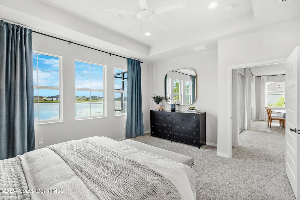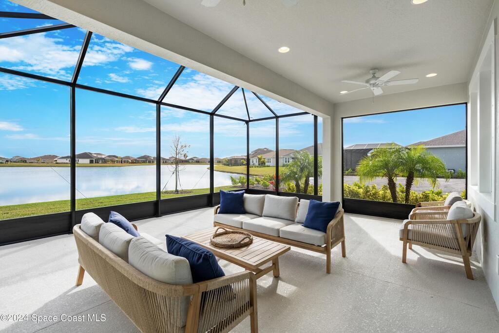 Lakefront Former Model Home in Viera where modern elegance meets an active, amenity-rich lifestyle. Built in 2023 and sited for long water views, this home welcomes you with brand new luxury vinyl plank flooring through the main living areas and an open floorplan with high ceilings that frame the lake from an oversized screened porch an ideal spot for morning coffee, sunset gatherings, or relaxed entertaining. The gourmet island kitchen features quartz countertops, stainless steel appliances, a pantry, and a large dining area overlooking the water, while a dedicated office with French doors provides a quiet workspace. The downstairs primary suite offers an expansive walk-in closet and a spa-like bath with double sinks, and two additional bedrooms plus two full baths on the main level ensure comfortable space for family and guests. Upstairs a spacious loft serves as a flexible family or recreation room accompanied by an additional bedroom and full bath. Located in Viera's award