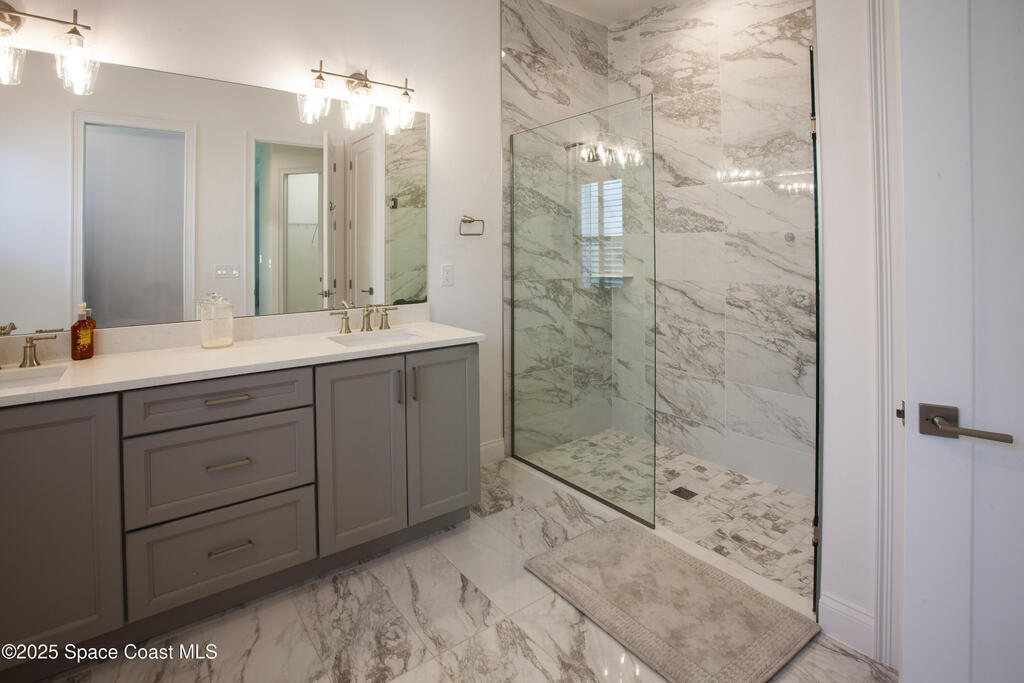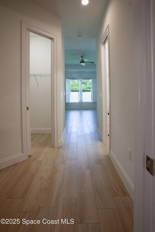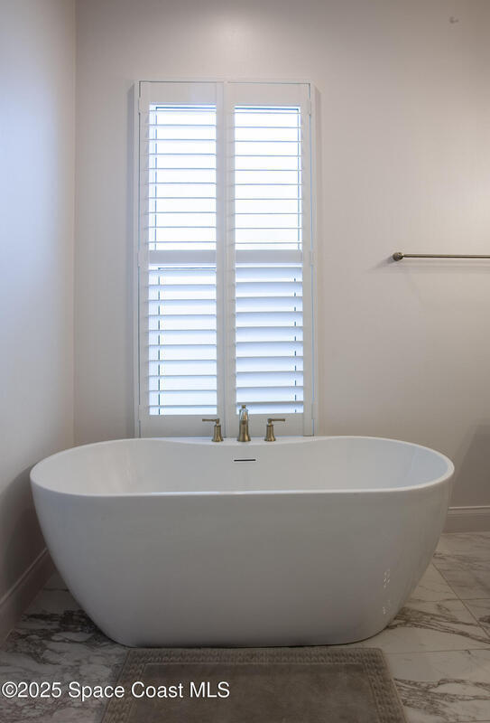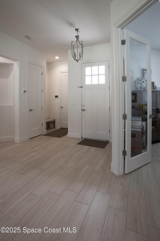 Discover this stunning custom-built home in a gated community with an open floor plan and a backyard facing a serene preserve. This beautifully designed residence offers three spacious bedrooms, two full bathrooms, and a versatile flex room.The gourmet kitchen features a gas range, beveled glass subway tile backsplash, quartz countertops, white maple cabinetry, and custom shelving. Plantation shutters throughout add timeless elegance.The oversized primary suite is a peaceful retreat with a tray ceiling, generous closet space, and direct patio access. The spa-like primary bath includes a freestanding tub, separate shower, and quartz finishes.Luxury upgrades include wood-look tile flooring, 10-foot ceilings, and 5 1/4'' baseboards. Enjoy outdoor living with a fully fenced yard, screened lanai, and paver driveway, all overlooking tranquil preserve views.Conveniently located 17 miles from Patrick Space Force Base, 1 hour from Orlando.