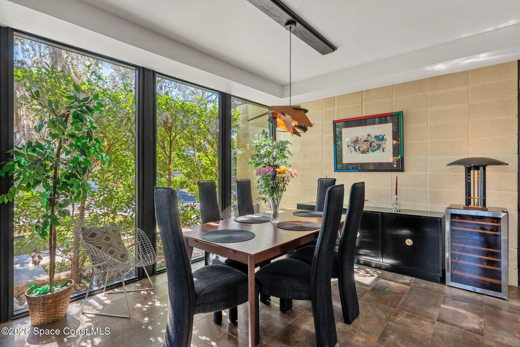 A true Mid-Century Modern masterpiece, this architect-designed residence is inspired by an unbuilt early-1950s Usonian design by Frank Lloyd Wright. Built in 2019, Ultra High Efficiency Smart Home. Re-engineered to meet current Broward Code standards, the home blends iconic Wright principles with modern performance, including enhanced wind resistance, energy efficiency, water conservation, and full smart-home technology. Expansive walls of glass reflect Wright's philosophy of bringing nature indoors, while the generous use of natural hardwoods adds warmth and organic character throughout. Construction techniques inspired by Wright's original methods create a sustainable, intentional design that feels both timeless and livable. Located in the historic Eau Gallie district and surrounded by charming vintage homes, this one-of-a-kind property is more than a residence-it is a living work of art where design, function, and history come together seamlessly.