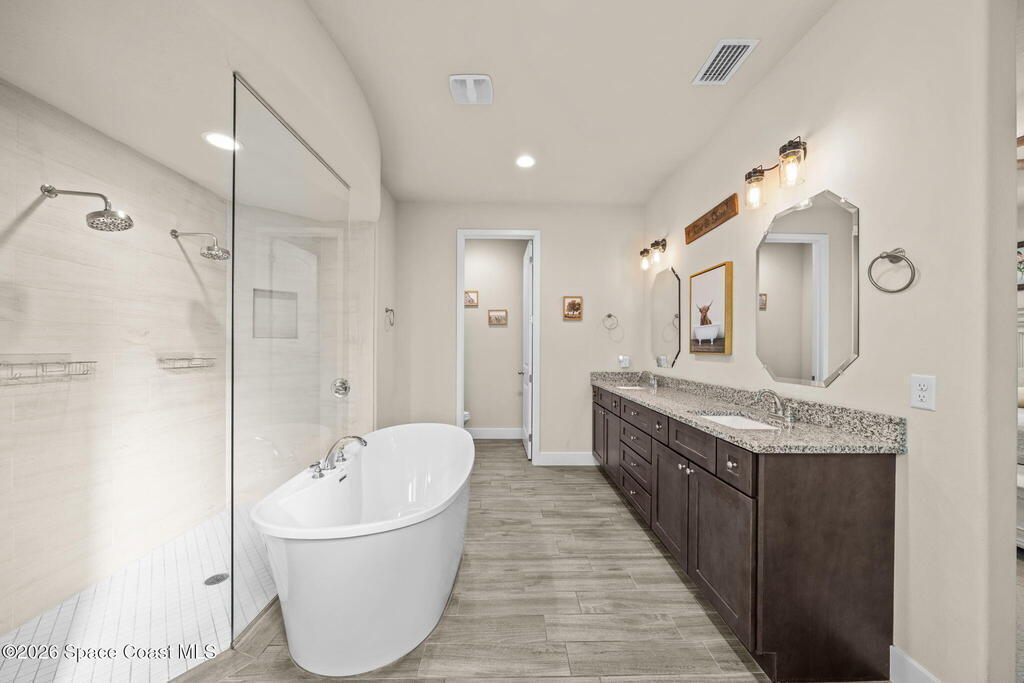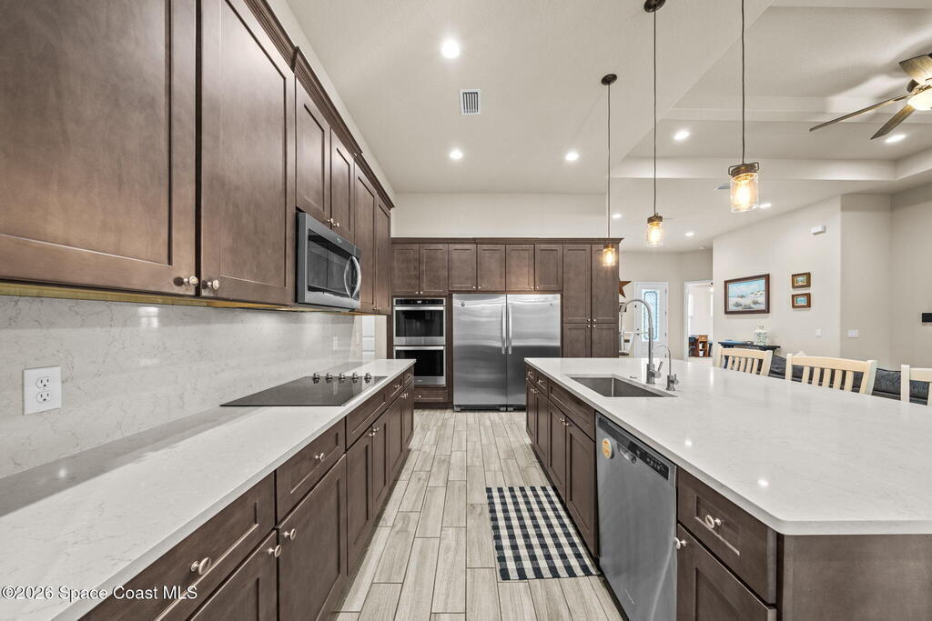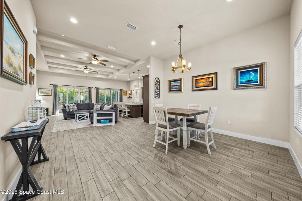 Located in the desirable Country Club Estates community of Titusville, this well-designed 5-bedroom, 3-bath home offers space, style, and a highly functional split floor plan. The open-concept layout is enhanced by valulted 12-foot ceilings, 8-foot doors, and an abundance of natural light that enhances the welcoming and elevated feeling of the home.The chef's kitchen sits at the heart of the home and features quartz countertops, a large center island, ample cabinetry, stainless steel appliances, and a double wall oven, ideal for both everyday living and entertaining. Wood like plank tile flooring flows throughout the main living areas.The large primary suite is thoughtfully positioned for privacy and features a spacious walk-in closet and a well appointed bathroom with a standalone soaking tub, separate walk-in shower, and double-sink vanity.Impact-rated windows and sliders provide added peace of mind and energy efficiency throughout the home. Additional highlights include