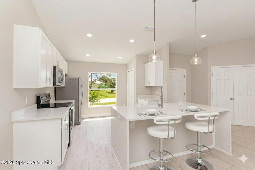 NO CLOSING COST LOANS AVAILABLE | NEW CONSTRUCTION Experience modern luxury in this exquisitely crafted 3/4-bedroom, 2-bath residence located in the heart of Palm Bay. Designed with an open-concept flow, the home features a Chef's Kitchen complete with a granite prep island, solid wood soft-close cabinetry, and premium stainless steel appliances.The spacious layout is bathed in natural light, leading you to a massive Primary Suite designed for ultimate relaxation. This home is defined by its high-end, included upgrades:Flooring: Luxury Vinyl Plank throughout (no carpet!).Bathrooms: Floor-to-ceiling shower tile, custom niches, and granite vanities.Details: Solid wood cabinets, designer hardware, and an electric garage opener.Note: One or more photos have been virtually staged.