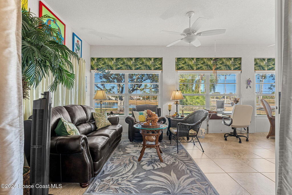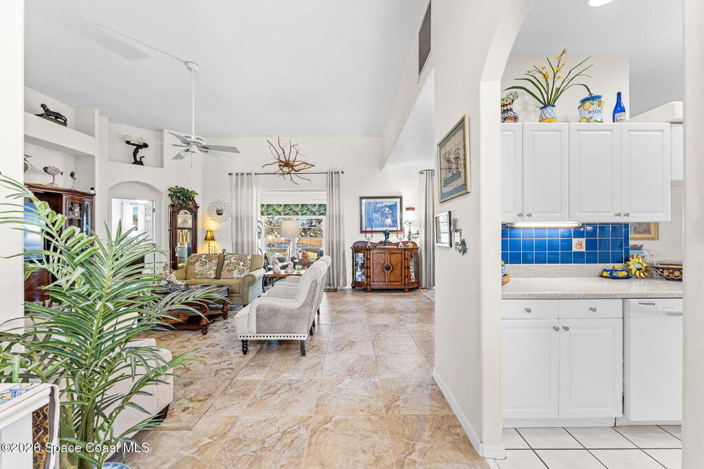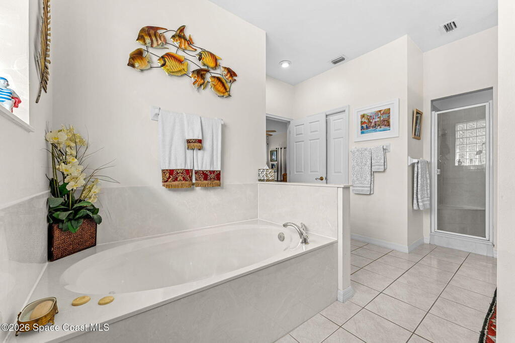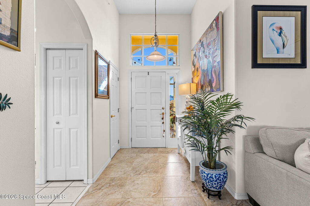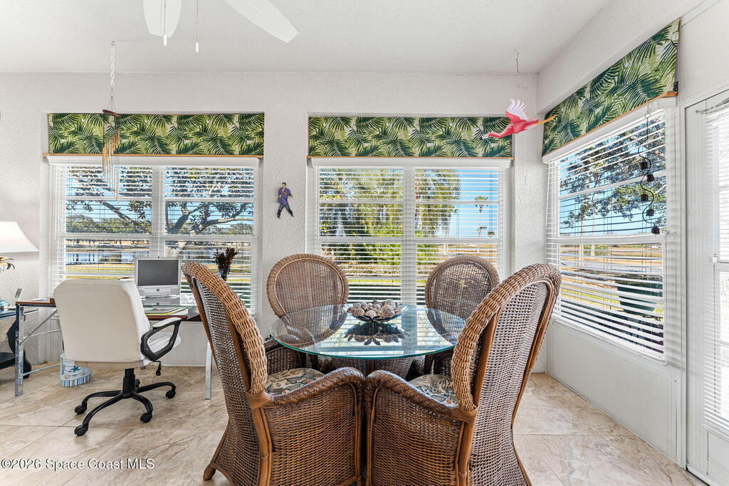Beautiful 3BR/2BA home on a premium corner lot with water views in sought-after Viera East. Light and bright with abundant windows and tall ceilings. Spacious living and dining room combo opens to a large enclosed lanai with stunning lake and golf course views. Kitchen features a breakfast bar and a breakfast nook. Tile flooring throughout the main living areas. Generous primary suite with shower, tub, and 2 walk-in closets. Indoor laundry. Oversized garage has a separate golf cart entrance! Charming patio area perfect for outdoor dining and entertaining, complete with a gas outlet for a grill. Community amenities include a pool, a clubhouse, a fitness room, and a yummy on-site restaurant. Enjoy relaxed Florida living in this beautiful golf course setting!