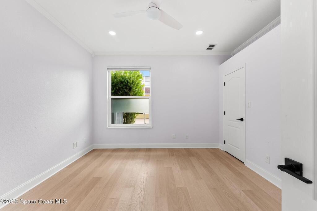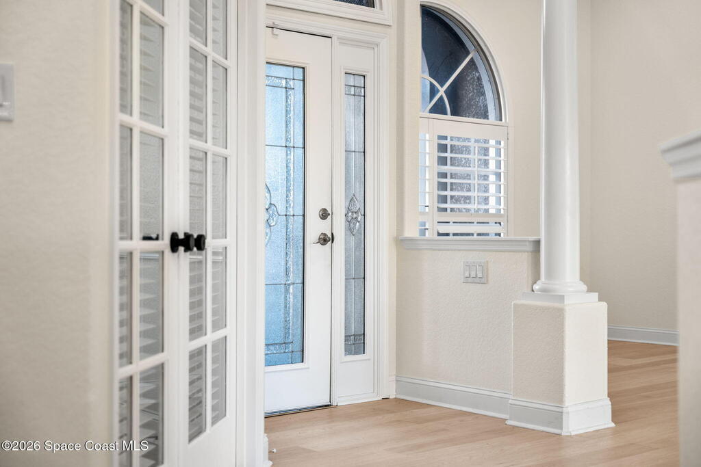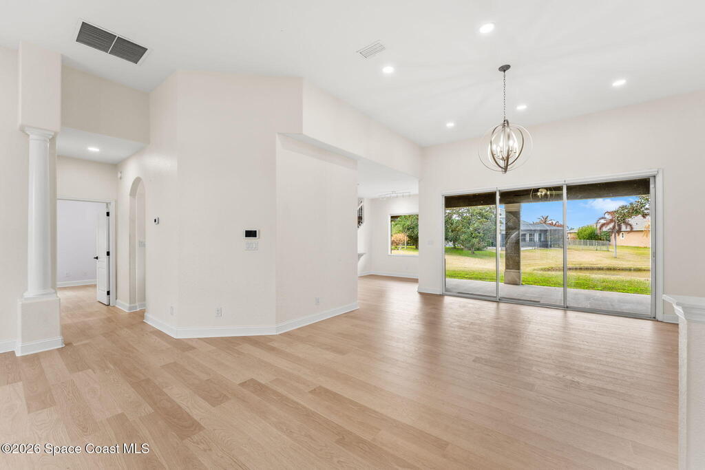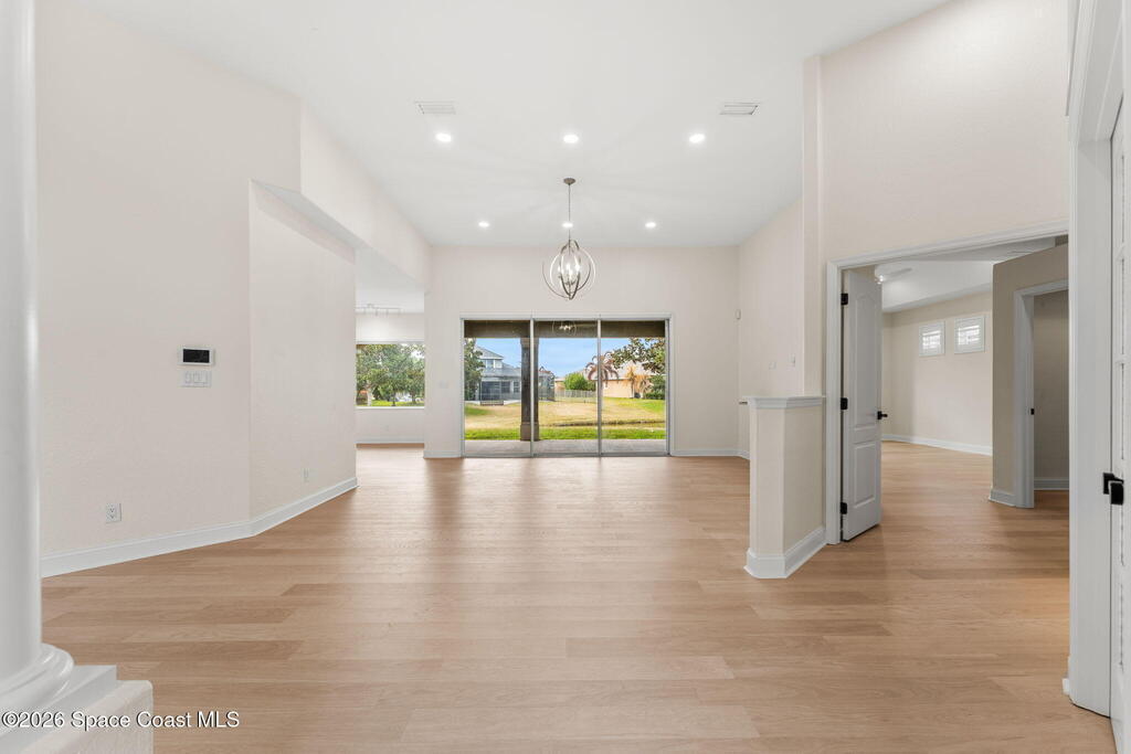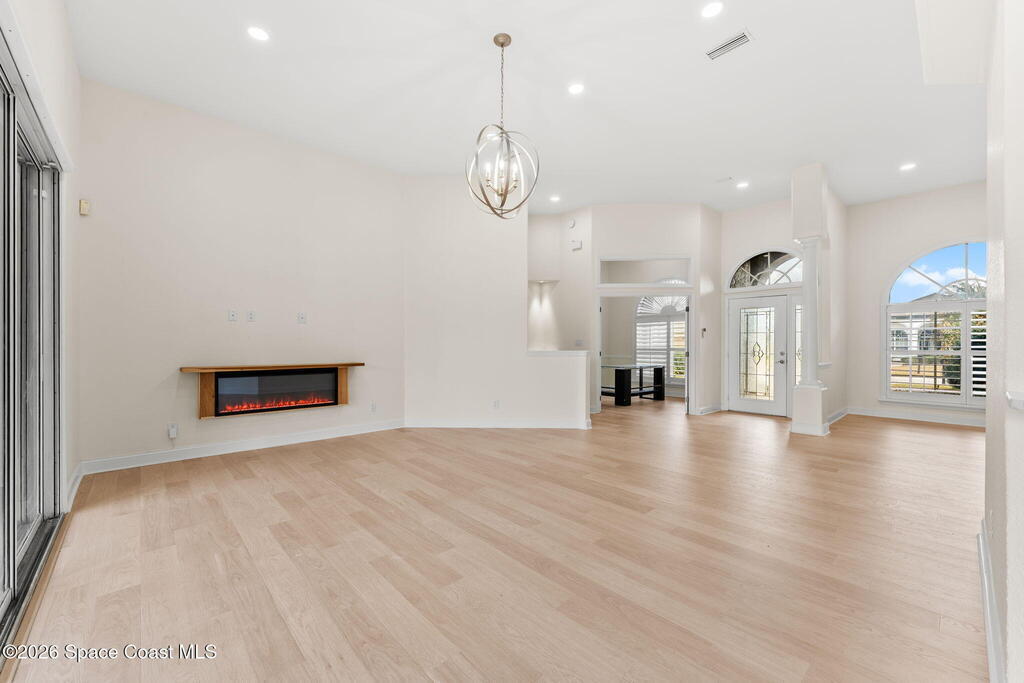 Renovated in Ravencliffe at West Viera, this gated lakefront residence offers 2,913 sq ft of refined living with 5 bedrooms, 3 baths, and a flexible split floor plan designed for multi-generational living. The fifth bedroom can easily serve as a private office, den, or additional guest room to fit your needs. Primary suites on both levels provide privacy and versatility, with four bedrooms and two full baths on the main floor, while upstairs features a private retreat with its own bedroom, bath, and living area--ideal for guests or in-laws. The redesigned kitchen showcases custom cabinetry, quartz countertops, and premium appliances, flowing into a bright breakfast nook framed by panoramic lake views and a spacious backyard with room for a future pool. The guest bathroom has been beautifully remodeled, and the home features a blend of laminate, tile, and carpet flooring throughout. Additional upgrades include energy-efficient windows w/ automatic blinds, dual 2024 A/C units.