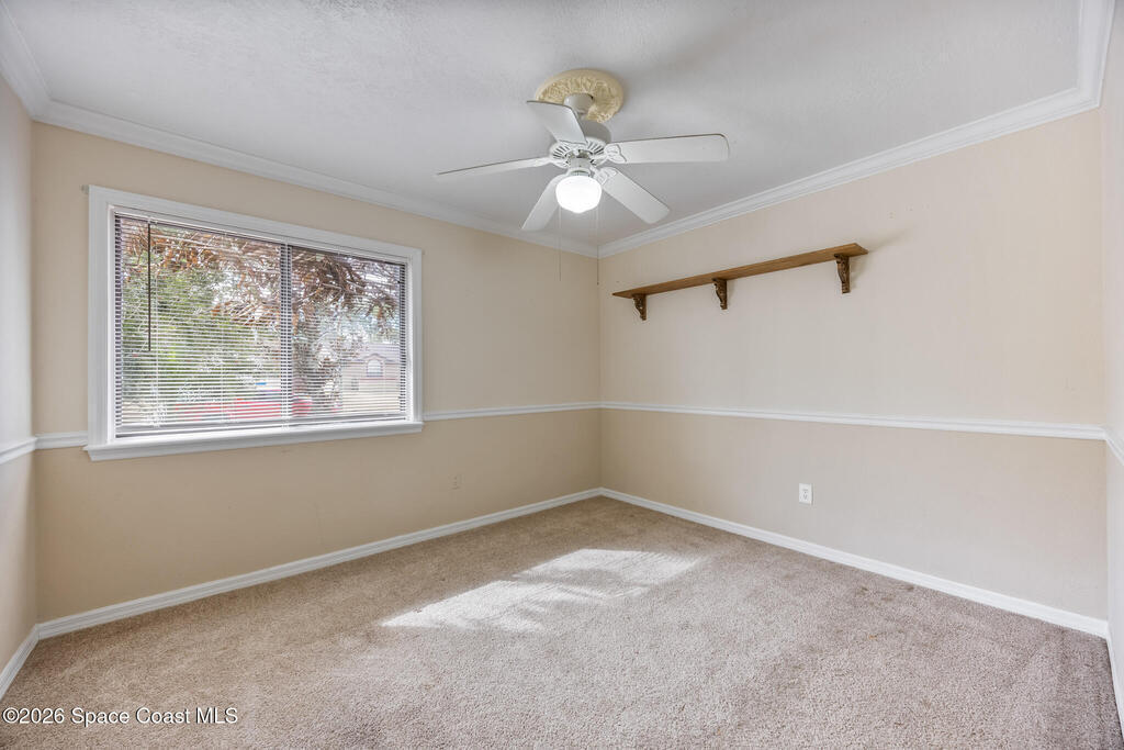 Highly functional 3BR/2BA PLUS Office/4th bedroom situated on a corner lot in NW Palm Bay with CITY water! Flexible floor plan with a front living room, dining room and family room. Roomy kitchen with loads of cabinet space, pantry, nice front glass cabinets & breakfast bar. Workshop/shed in the fenced backyard along with patio. Don't miss your opportunity to live in a great part of Palm Bay with a property on city water. Enjoy newly laid laminate flooring and indoor laundry area. Have peace of mind with a 2022 roof, 2018 hot water heater and 2020 HVAC system all in good working order. Take this chance to live in a 4-bedroom home with living room, family room, large back yard and private corner lot! Completely move in ready and waiting for its next owners.
