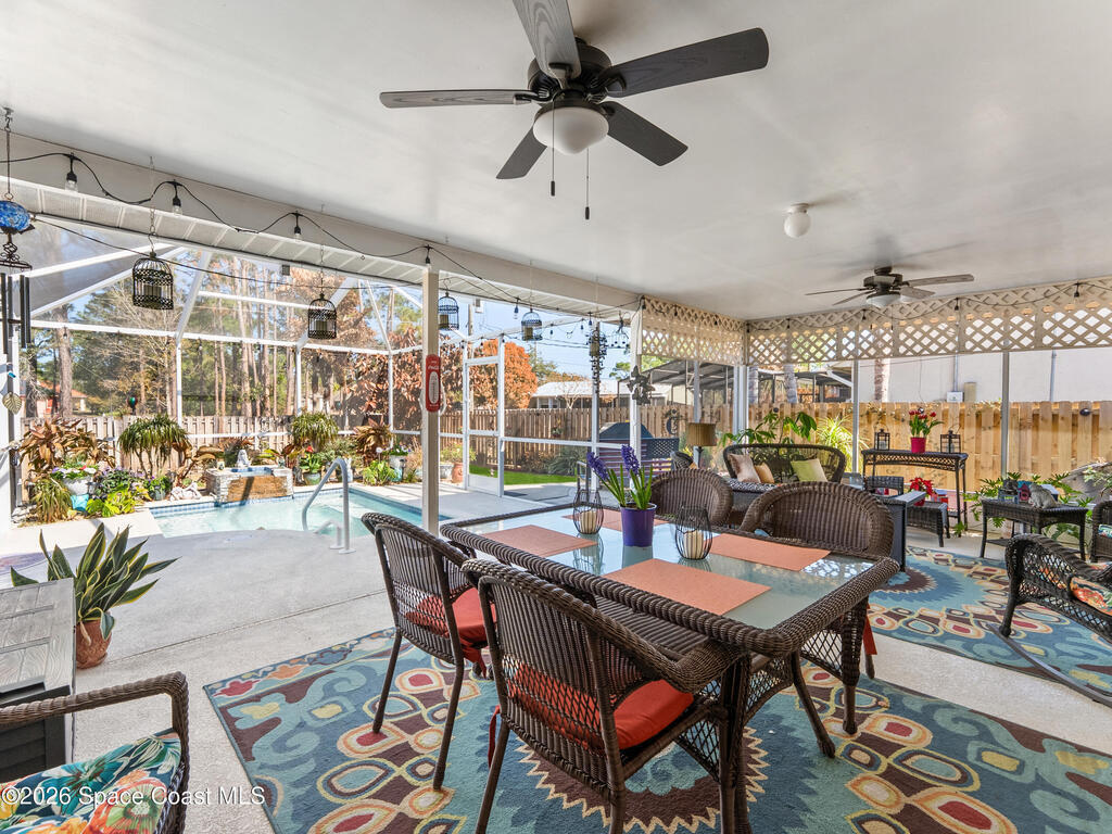 Located in a highly desireable non HOA community we have this fully fenced 3/2/2 with an oversized, jetted, heated spa/plunge pool & waterfall feature. CBS construction with triple pane impact glass and 2021 roof+ gutters for peace of mind with city water. The residence features traditional split floor plan with captivating vaulted ceilings, electric fireplace and fresh interior paint. Home features an updated kitchen, granite countertops, shaker cabinets, built-in pantry with pull outs and breakfast bar. Newer LVP in the family room, dining room and bedrooms. Primary bedroom showcasing the his and her walk-in closets, barn door for bathroom privacy, dual sink vanity & walk-in shower. Spacious guest bedrooms with granite countertops top vanity in guest bathroom and shower/tub combo. Enjoy this outdoors slice of paradise rescreened and painted lanai with your heated pool, selection of two patios & low voltage lighted fenced in yard.