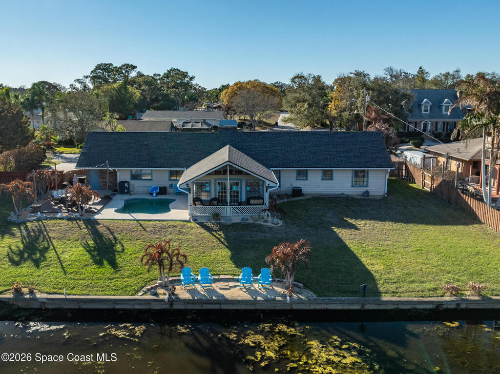 Blissful Waterfront Retreat on Turkey Creek -Welcome to your private waterfront sanctuary nestled along the scenic shores of Turkey Creek in Palm Bay. Perfectly positioned just 15 minutes to downtown and area beaches, this beautifully upgraded 4-bedroom plus office, 3-bath estate offers the rare combination of tranquility, recreation, and income potential.Spanning approximately 2,375 square feet on an expansive .41-acre lot, this open-concept home is designed to capture breathtaking panoramic water views. A striking double-sided fireplace anchors the main living areas, while the chef-inspired kitchen flows seamlessly into generous gathering spaces ideal for entertaining.Step outside into your own resort-style backyard oasis featuring a private pool, multiple conversation patios, propane fire pit, gas BBQ, and a private dock along a navigable canal with direct access to Turkey Creek. Launch your kayak or paddleboard from your backyard, fish from your your private coquina pebble