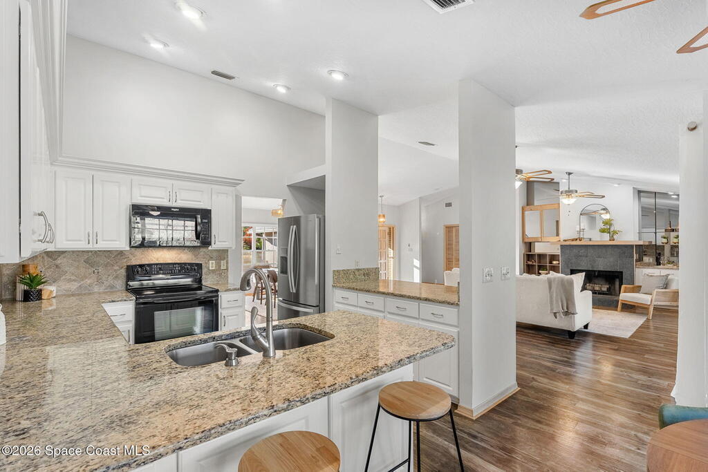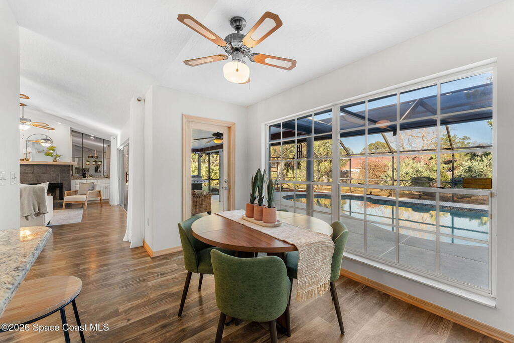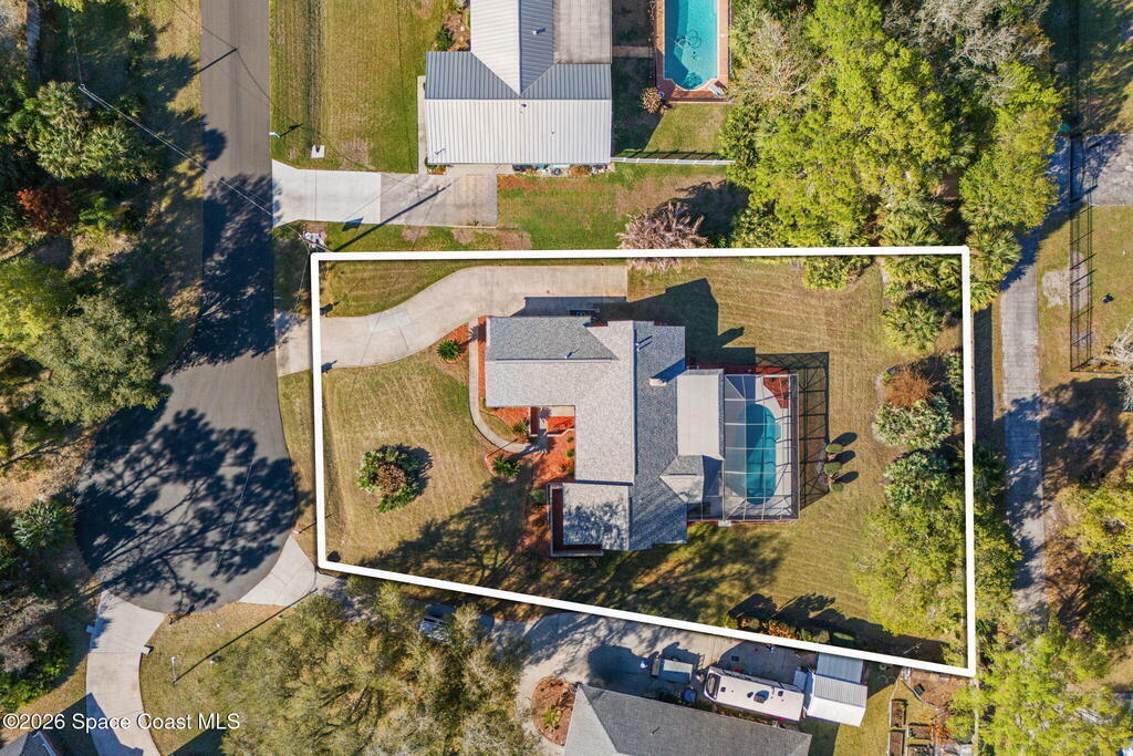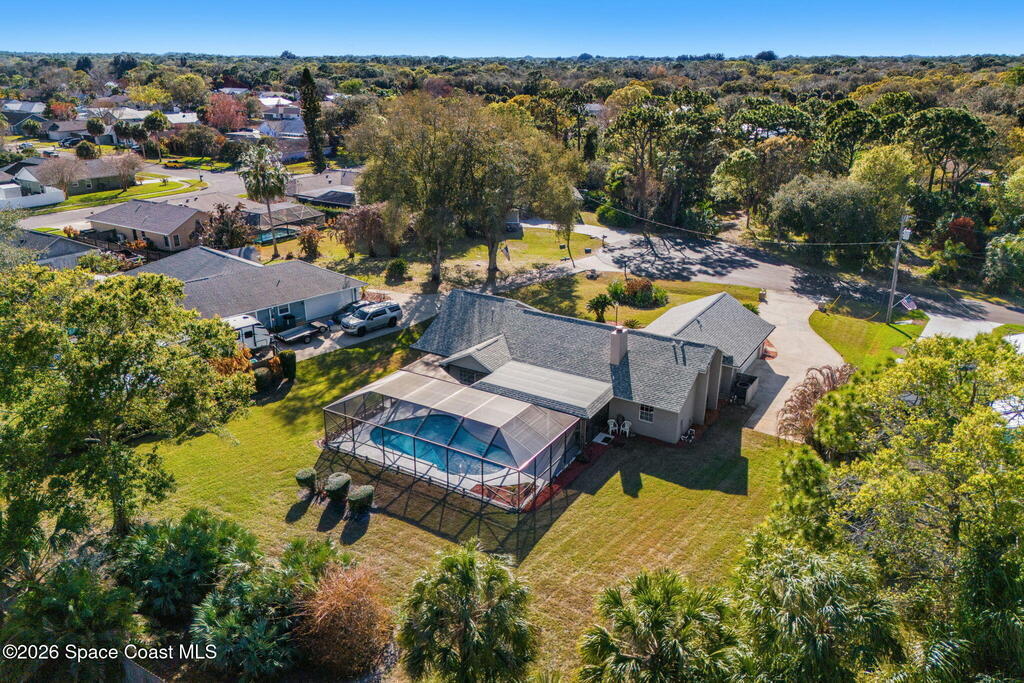Welcome to this beautifully maintained concrete block, pool home situated on a spacious 0.5-acre lot, offering privacy, space, and functionality. New roof in 2025. AC 2024. This desirable split floor plan provides separation between the primary suite and guest bedrooms, ideal for families. The updated kitchen overlooks the expansive living room, creating a seamless open-concept layout perfect for entertaining. Enjoy additional flexibility with space for a formal dining room or flex space to suit your needs.Features include hurricane shutters for storm protection, durable laminate flooring throughout (no carpet), and a dedicated indoor laundry room for added convenience. Step outside to your private backyard oasis featuring a screened swimming pool and ample yard space on this oversized, private half-acre property--perfect for outdoor living, pets, gardening, or entertaining.Conveniently located near shopping, dining, schools, and major roadways. Septic and City Water!