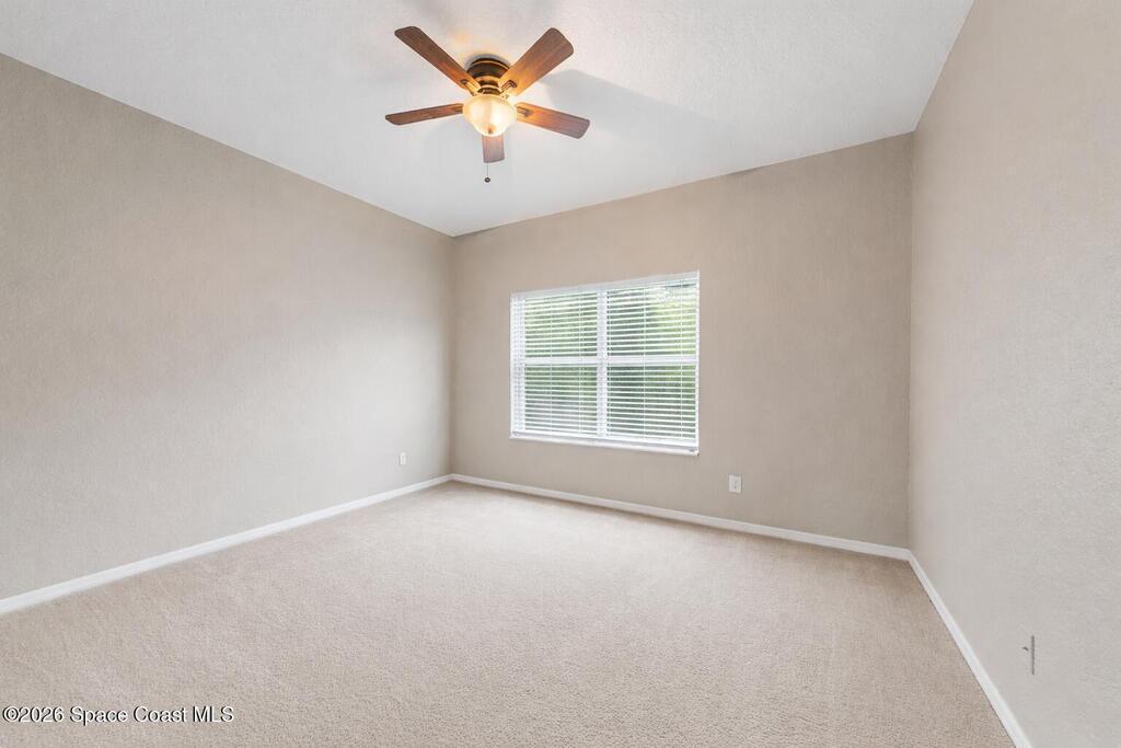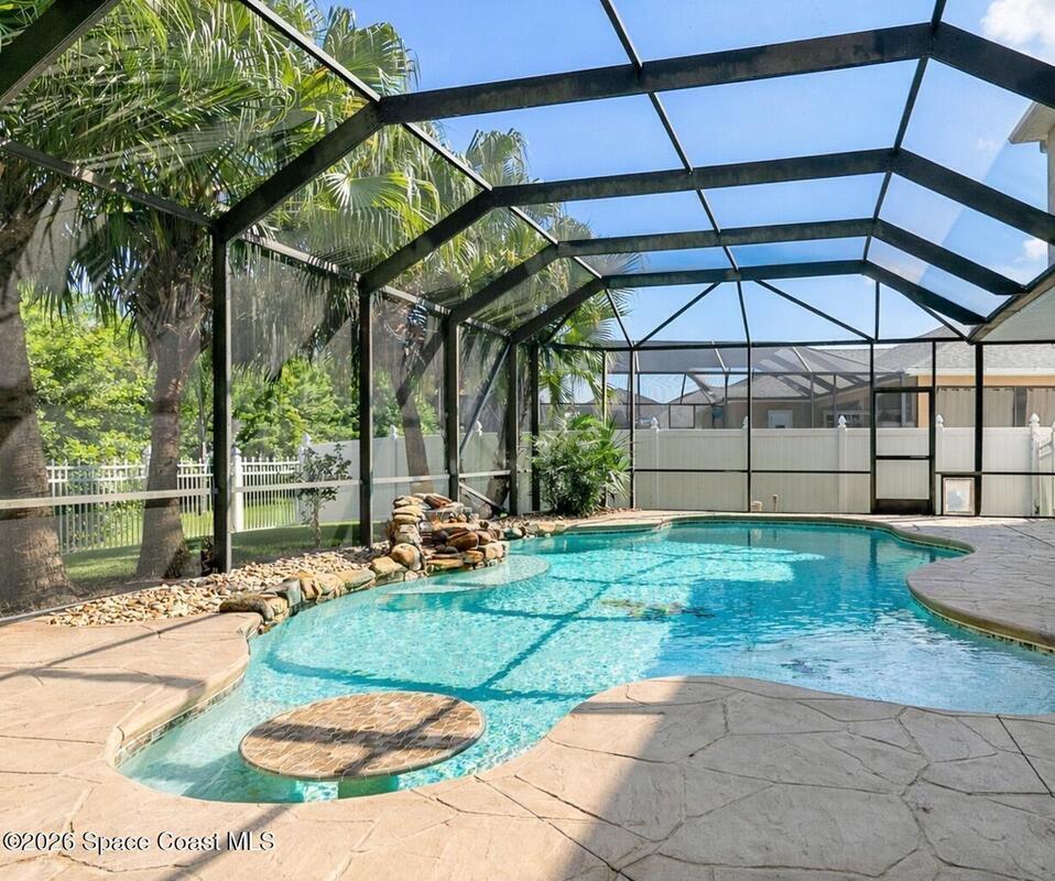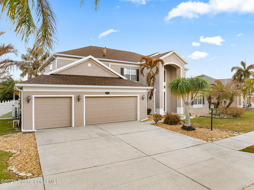 Exceptional space, comfort, and privacy define this stunning 5 bedroom, 3.5 bathroom pool home in the gated community of Chastain Manor. Offering nearly 4,000 square feet of living space, the thoughtfully designed layout includes a private office and spacious primary suite on the main level, plus an upstairs loft, four secondary bedrooms, and three full baths. The updated kitchen features 42'' cabinets, granite countertops, and a gas cooktop. Vaulted 20-foot ceilings, crown molding, custom tile, and a gas fireplace add elegance throughout. Enjoy rocket launches all year round from your screened heated saltwater pool, large patio and fenced yard backing to protected wetlands. Oversized 3-car garage for added storage. Minutes to I-95, 5 minutes to The Indian River, 12 minutes to The Brevard Zoo, 15 minutes to the beach and Patrick's Space Force Base.