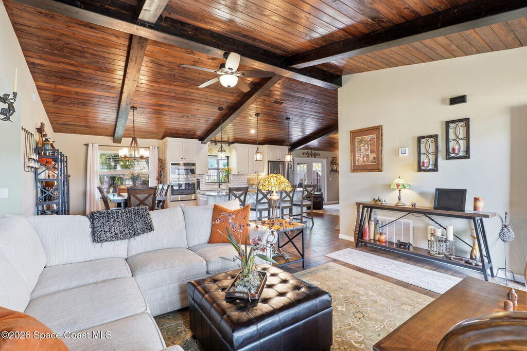 This home exudes thoughtful style and design from the very moment you arrive. Vaulted tongue-and-groove ceilings with exposed beams create warmth, complemented by wood-look tile flowing seamlessly throughout the entire home. The impressive kitchen features 15-inch deep soft-close cabinetry, sleek induction cooktop, GE Profile appliances, and Waterdrop reverse osmosis filtration system that even filters water for ice cubes. Impact windows provide peace of mind, along with a 2024 roof, 2018 gas water heater, and a variable-speed AC system (2014) which is known for its longer-than-average lifespan. Screened porch and private fully fenced backyard offers premium cedar fencing (resistant to rot and insects), storage sheds, and double-gate yard access with potential to store a small trailer or boat. Ideally located near Publix, the Eau Gallie Arts District, and I-95. Schedule a showing today!
