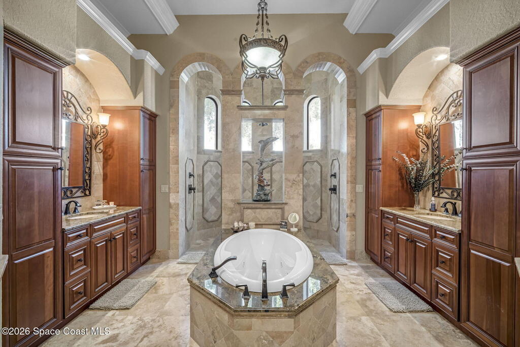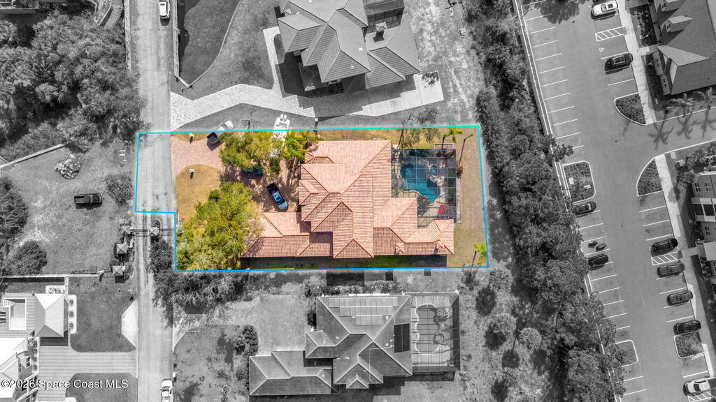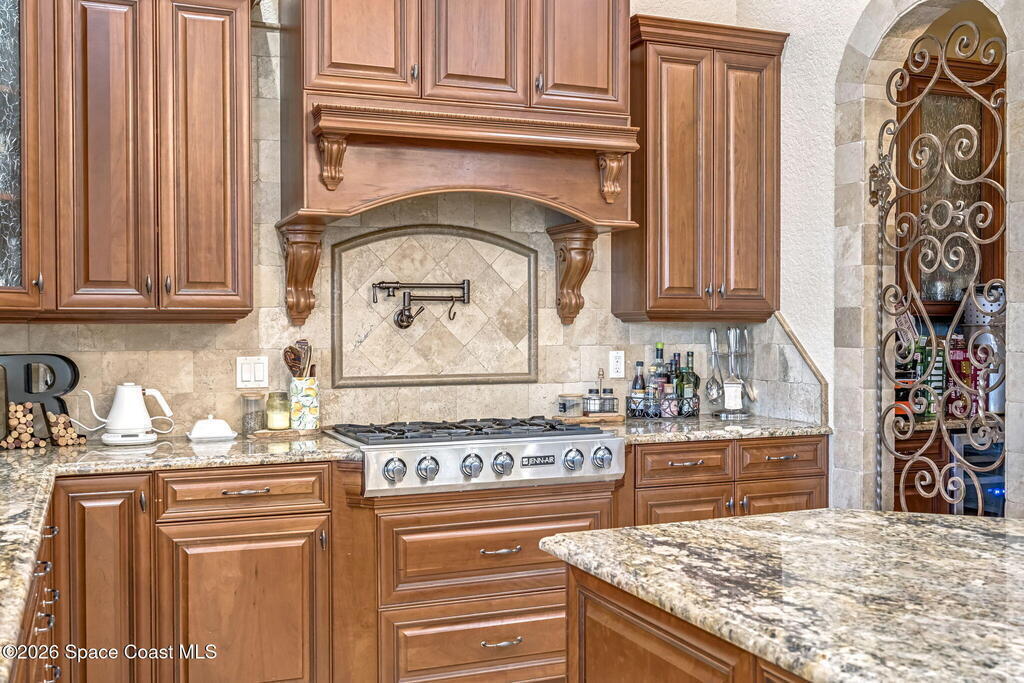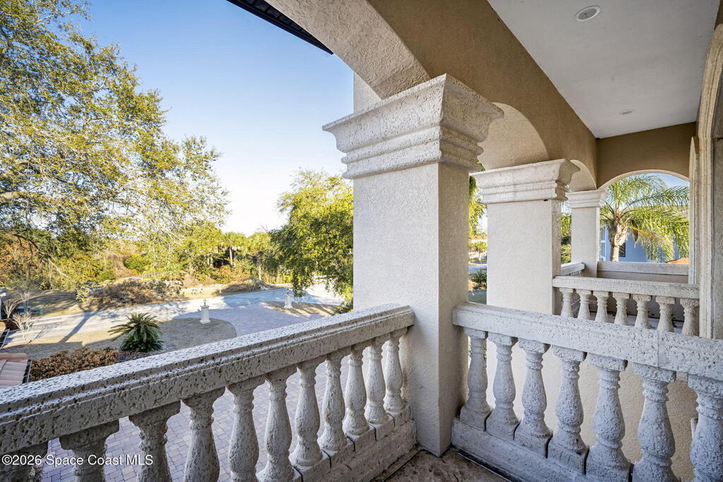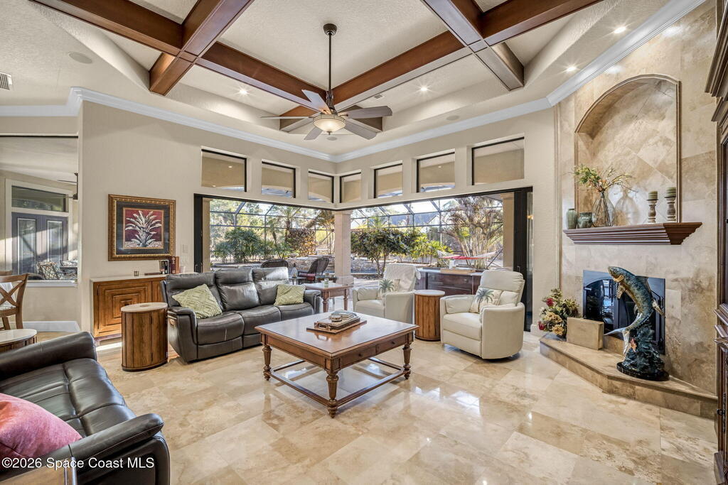 Custom-designed luxury pool home featuring a saltwater pool and spa with waterfall, fire bowls, and color-changing LED lighting. Equipped with PGT impact-rated windows, soaring tray and coffered ceilings, summer kitchen, and energy-efficient spray foam insulation. Expansive 90-degree pocket sliders create a seamless indoor-outdoor living space, ideal for entertaining. Spacious family room with fireplace. The chef's kitchen offers a large center island, granite counters, solid wood cabinetry, premium appliances, and a butler's pantry. Travertine and Brazilian cherry floors run throughout. Four private bedroom suites, each with its own bath. First-floor primary suite includes an elegant bath with dual vanities. Upstairs features a theater/entertainment room with kitchenette. Enjoy private access to a 200' dock across the street. Exceptional curb appeal and meticulous craftsmanship throughout. Located in the gated Hidden Creek community on the Space Coast, just steps from the Indian River