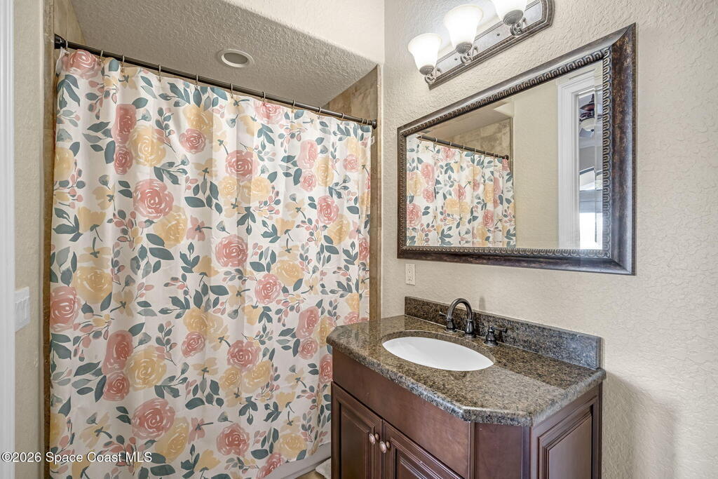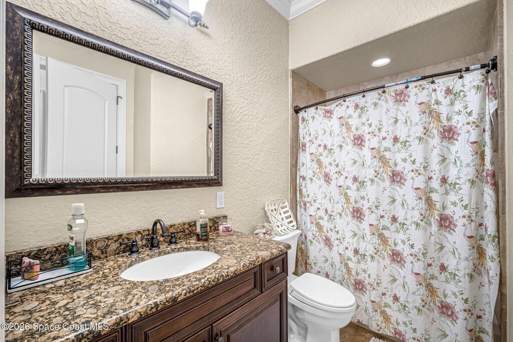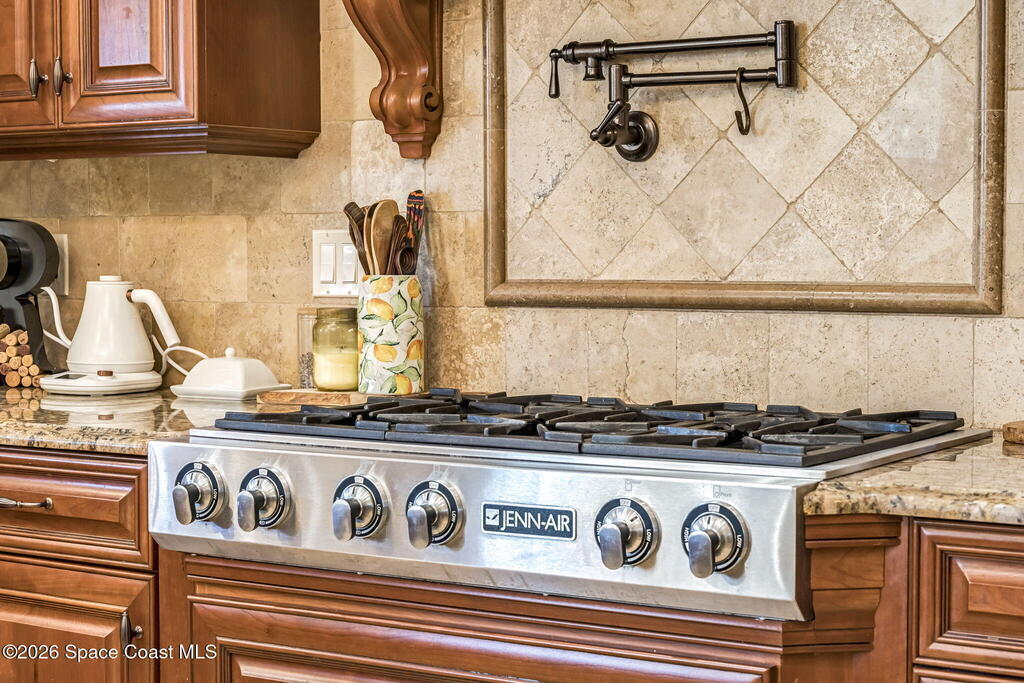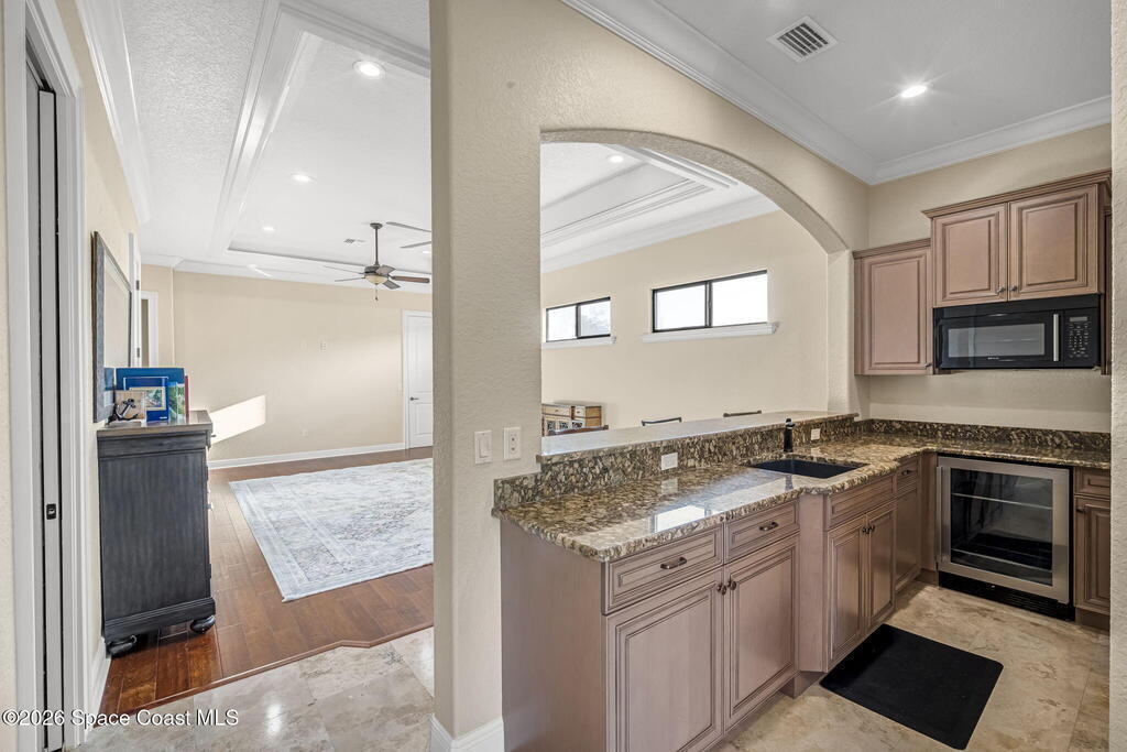 Custom-designed luxury pool home featuring a saltwater pool and spa with waterfall, fire bowls, and color-changing LED lighting. Equipped with PGT impact-rated windows, soaring tray and coffered ceilings, summer kitchen, and energy-efficient spray foam insulation. Expansive 90-degree pocket sliders create a seamless indoor-outdoor living space, ideal for entertaining. Spacious family room with fireplace. The chef's kitchen offers a large center island, granite counters, solid wood cabinetry, premium appliances, and a butler's pantry. Travertine and Brazilian cherry floors run throughout. Four private bedroom suites, each with its own bath. First-floor primary suite includes an elegant bath with dual vanities. Upstairs features a theater/entertainment room with kitchenette. Enjoy private access to a 200' dock across the street. Exceptional curb appeal and meticulous craftsmanship throughout. Located in the gated Hidden Creek community on the Space Coast, just steps from the Indian River